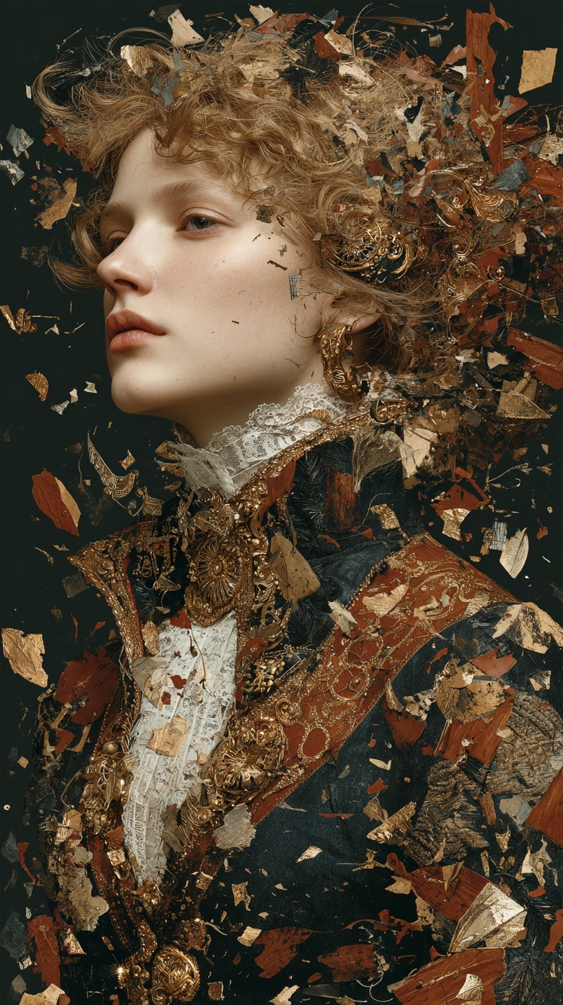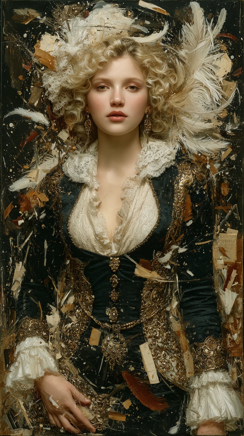 Этот промпт создает мощный художественный гибрид, где утонченность барокко сталкивается с хаосом абстрактного экспрессионизма.
