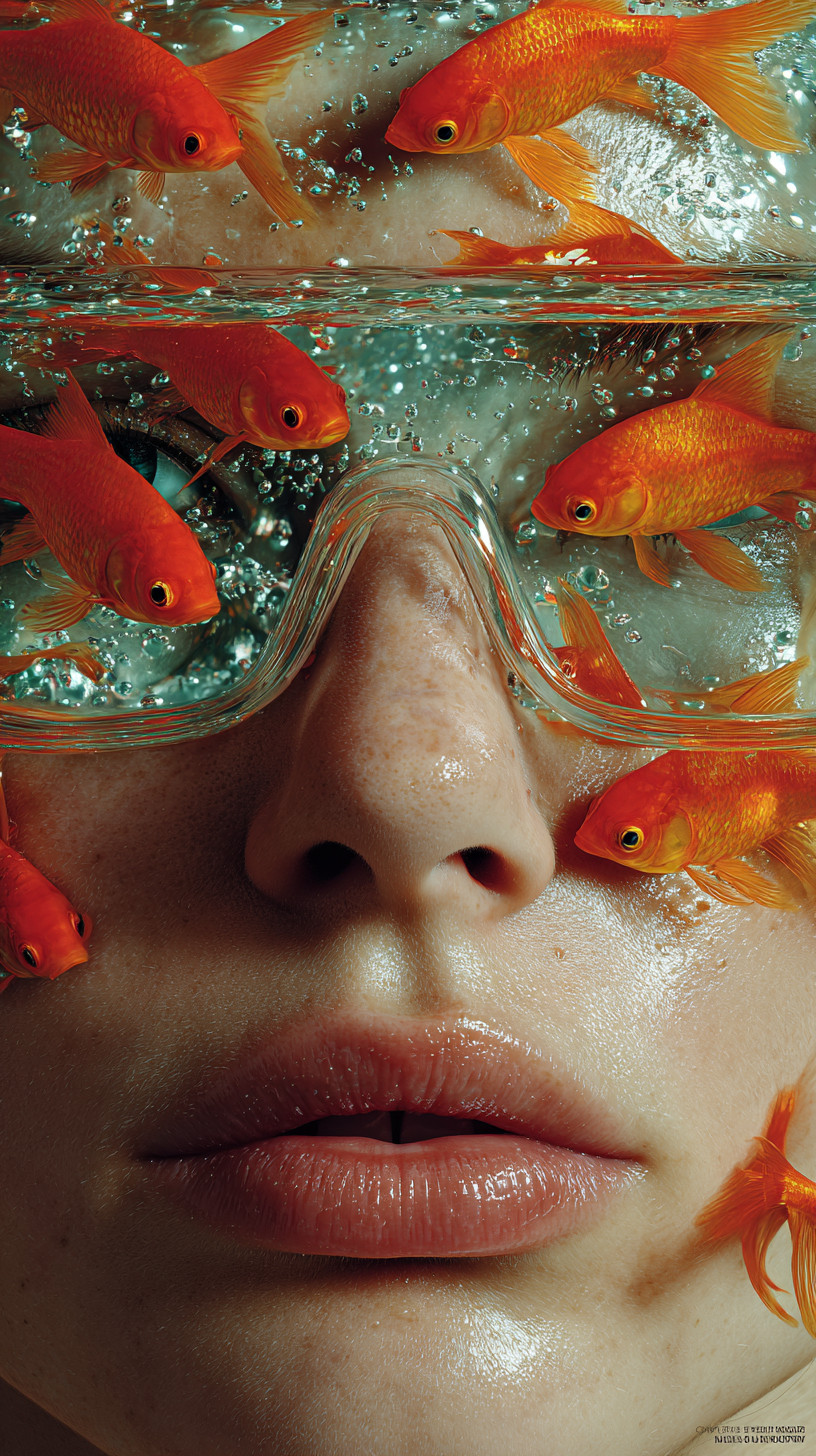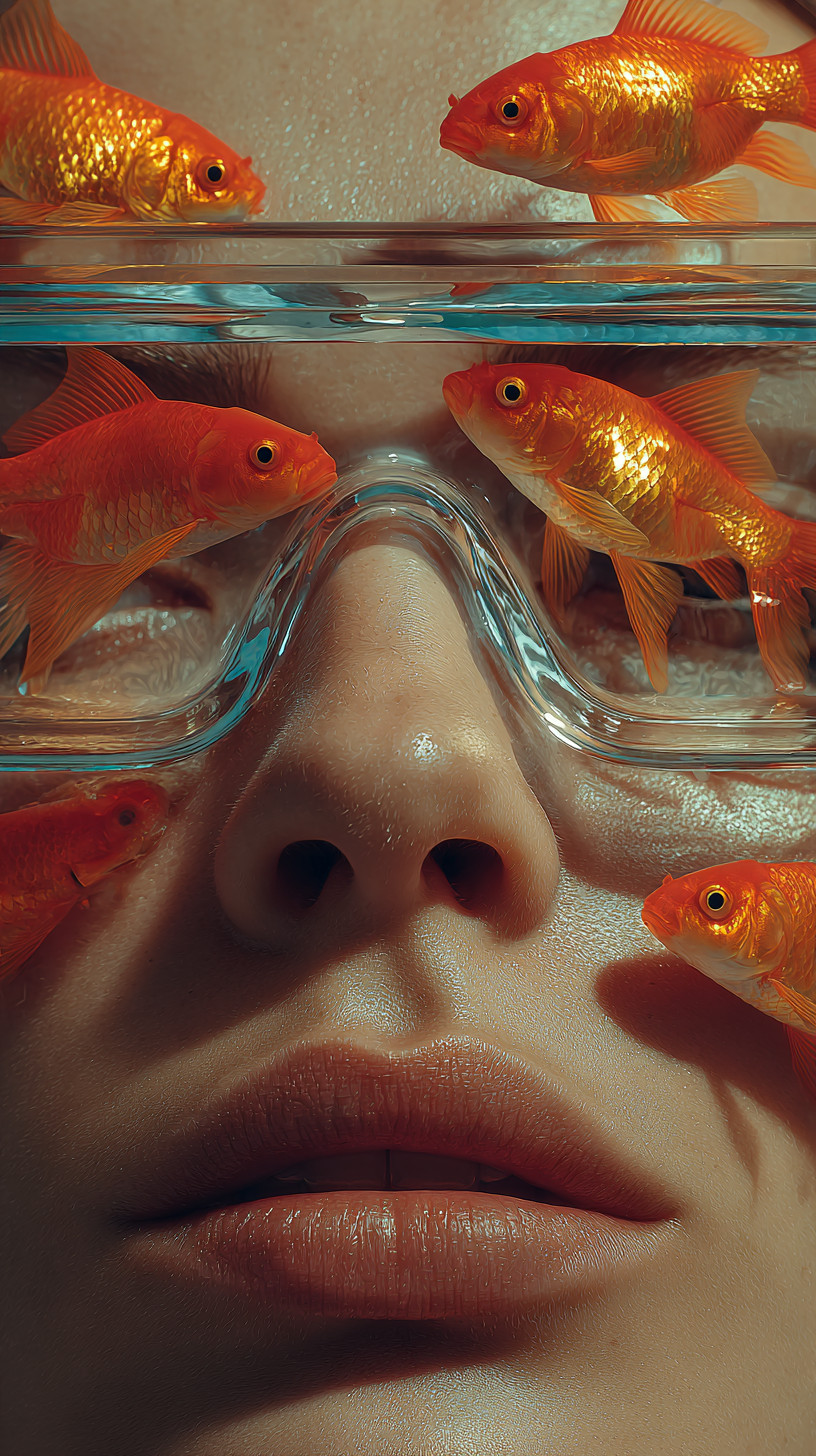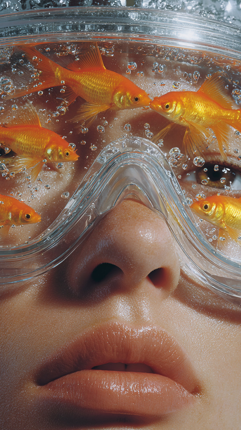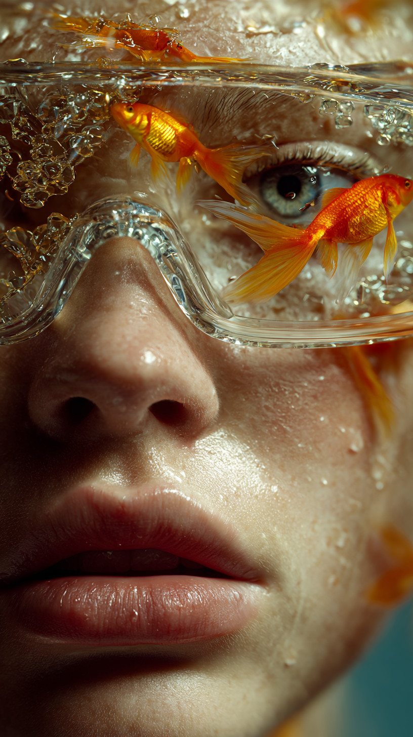 Крупный план женского лица в подводных очках, внутри которорых плавают золотые рыбки.