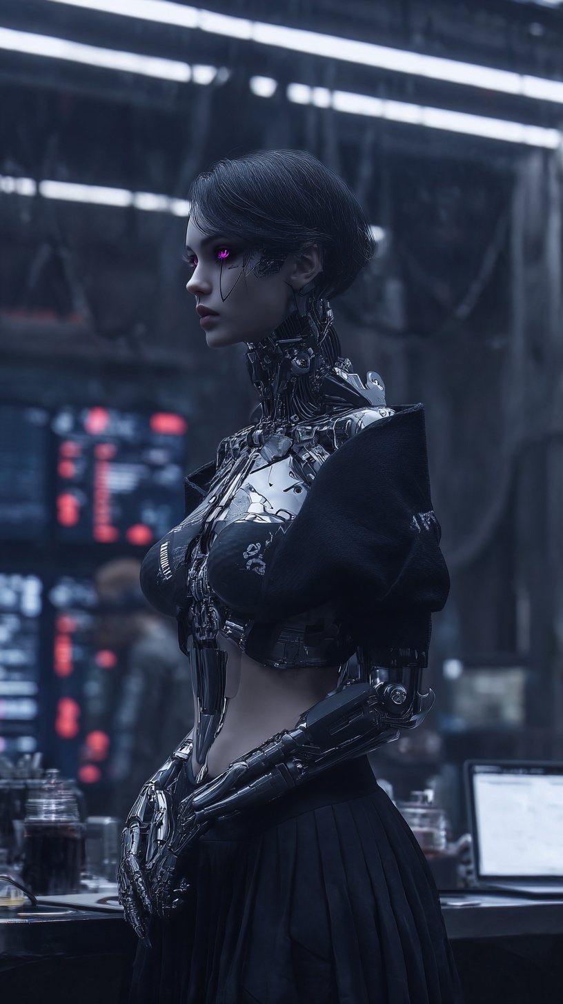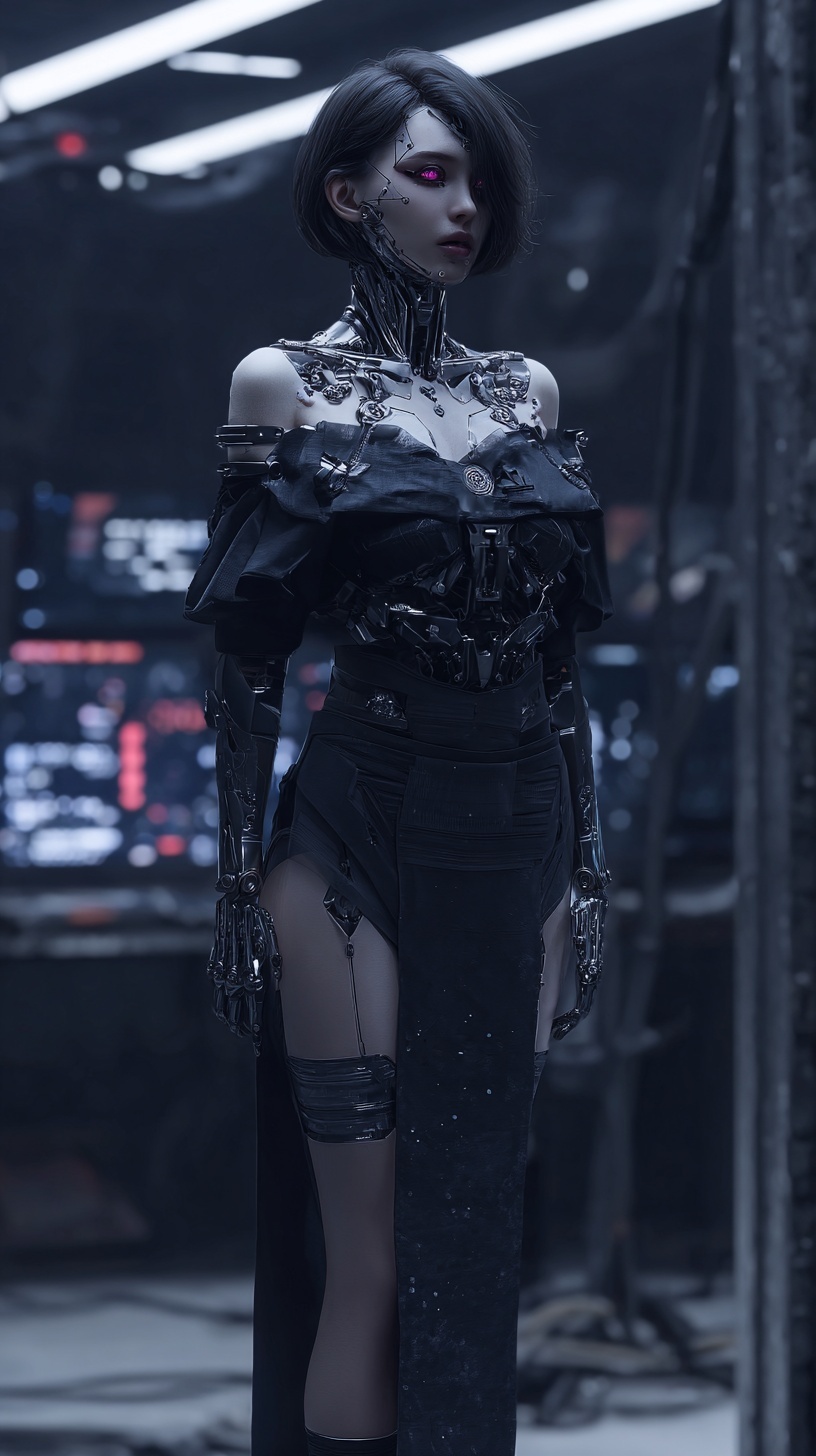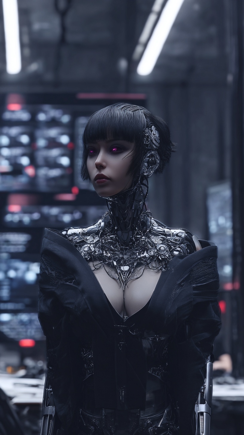 Футуристичная женщина-андроид со сверкающими красными глазами и короткими темными волосами.