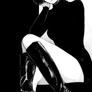 Стильный черно-белый рисунок в аниме-стиле, девушка одета в темный наряд, напоминающий школьную униформу или официальное платье.