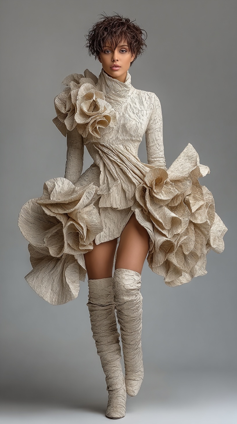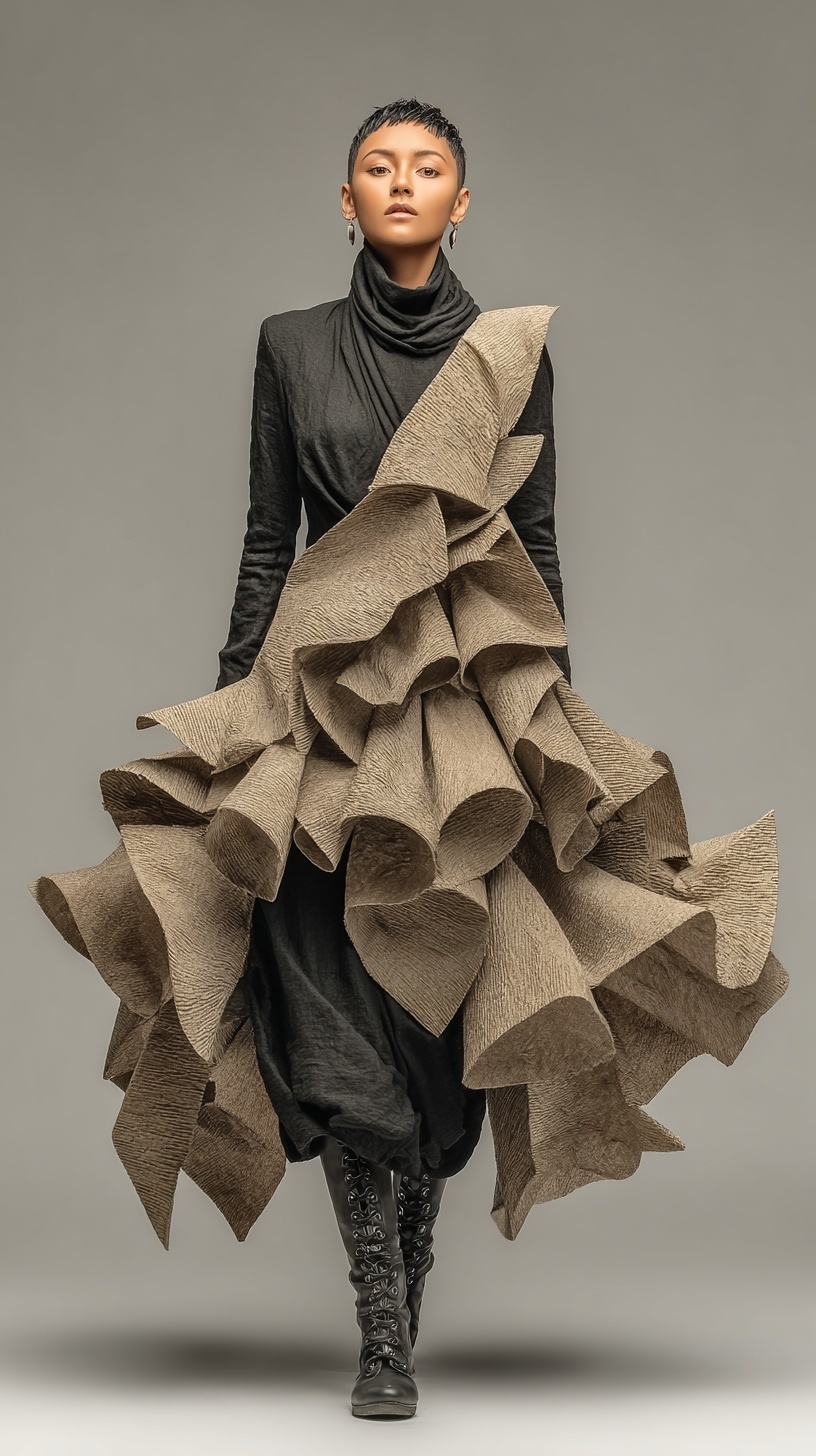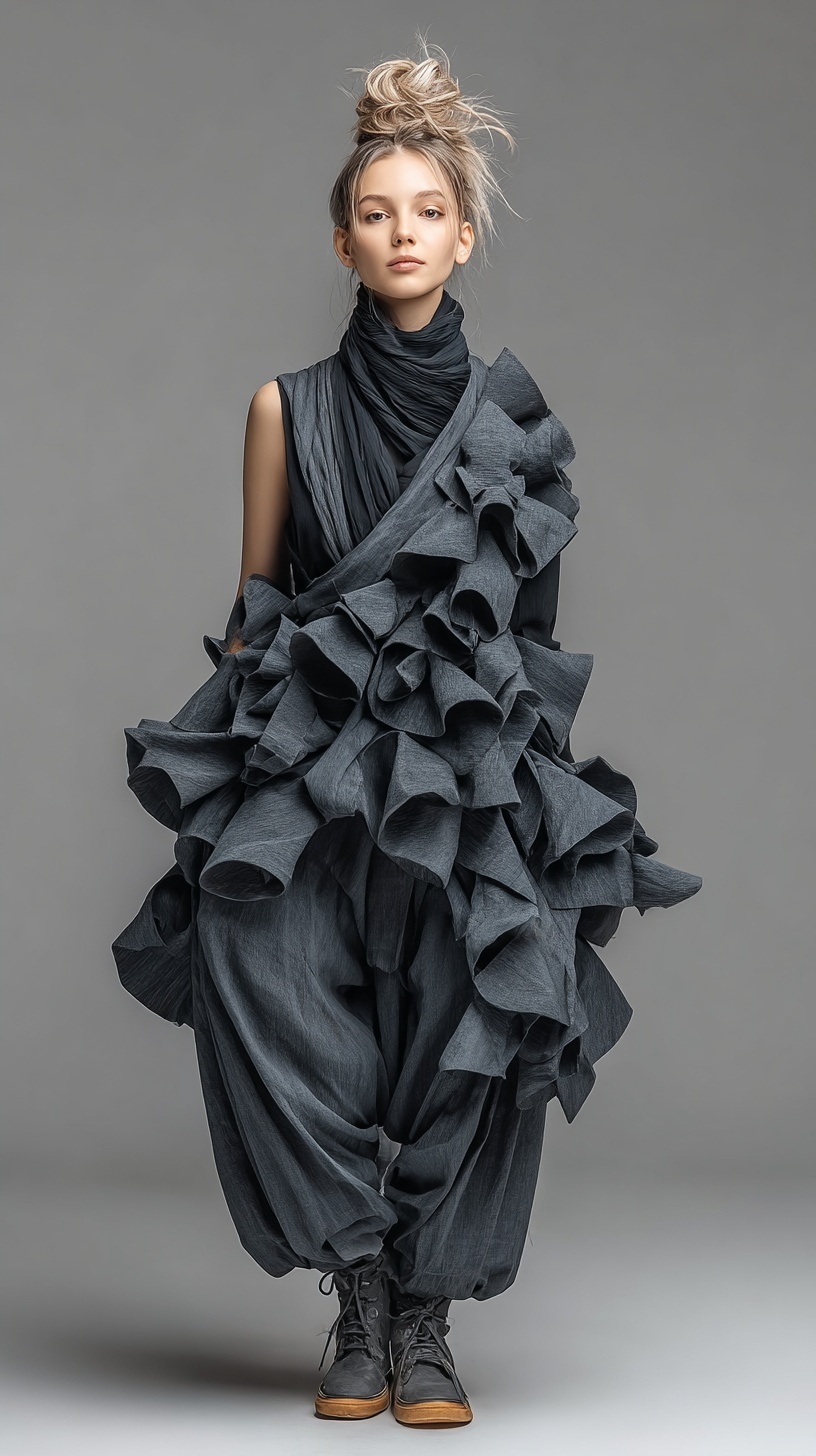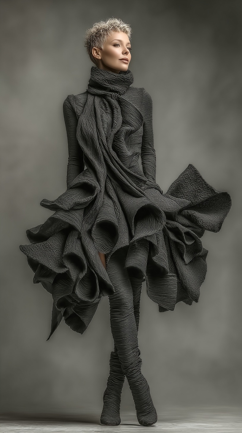 Асимметричный костюм из фактурных материалов, драматическое студийное освещение на чистом фоне.