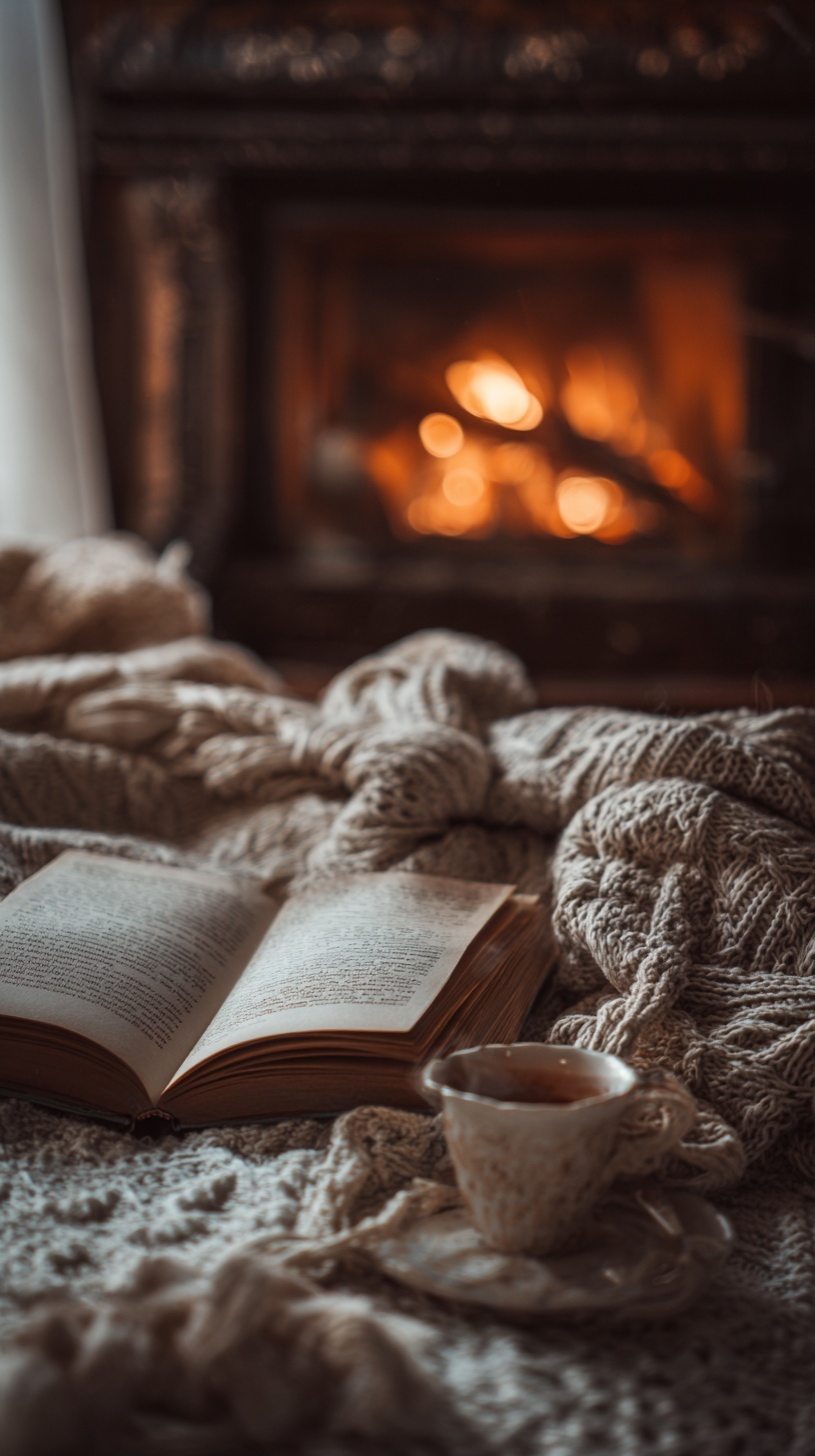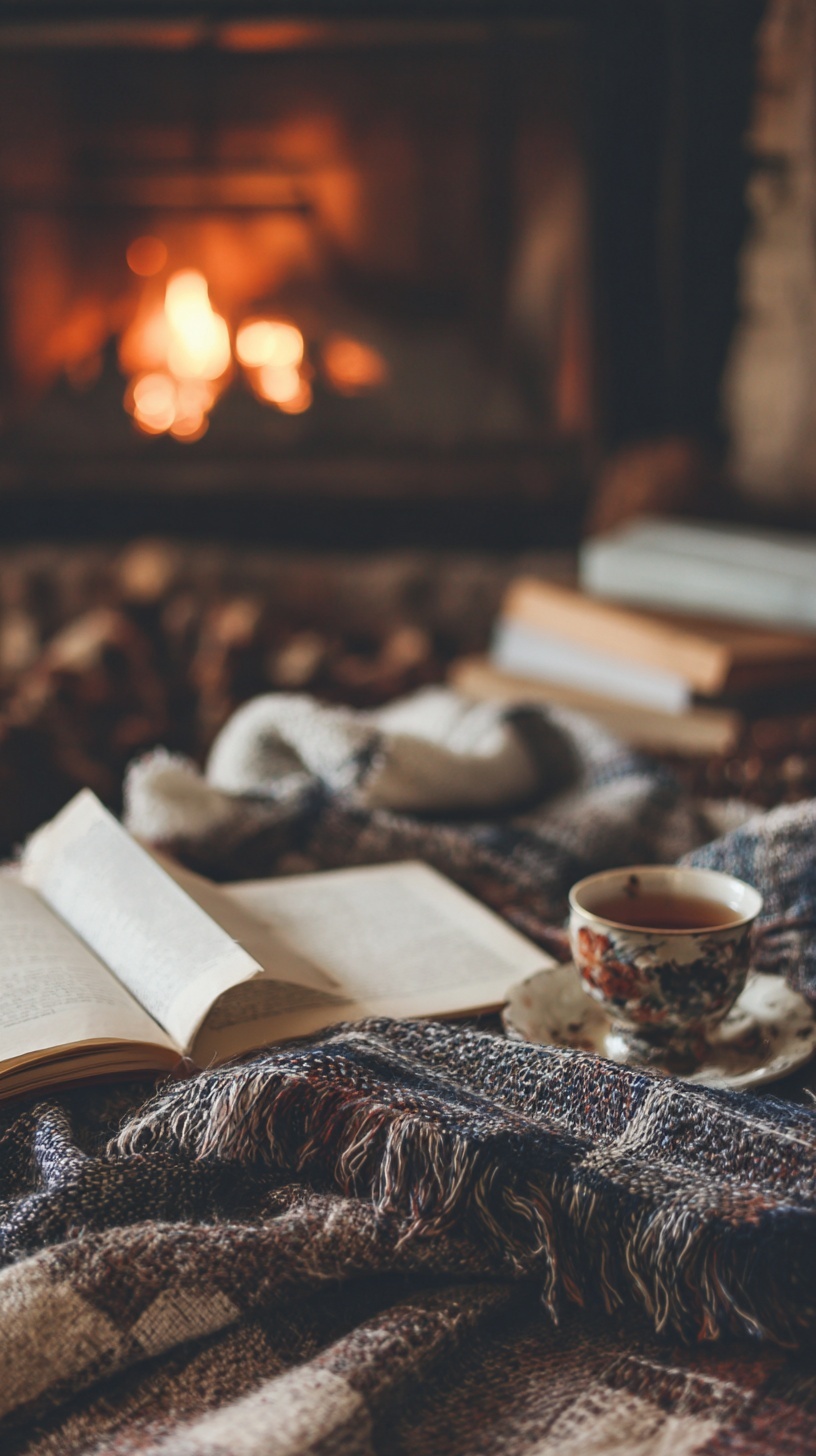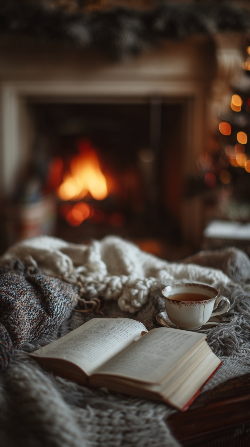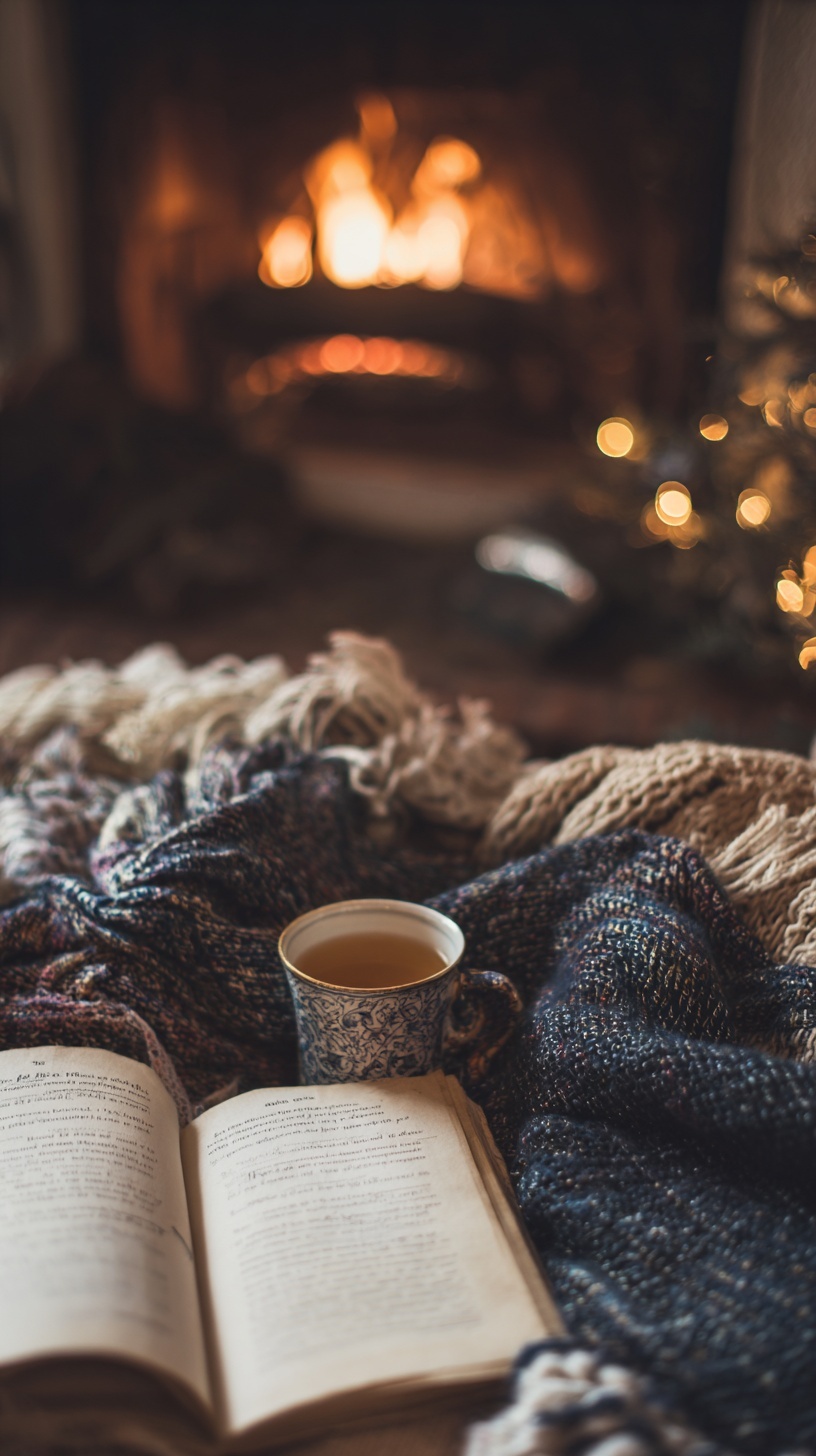 Уютная рождественская сцена: помятое одеяло, открытая книга и недопитая чашка чая у камина.