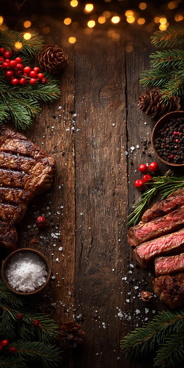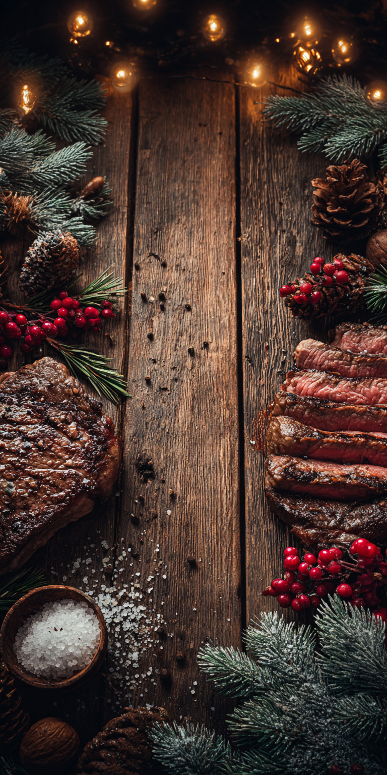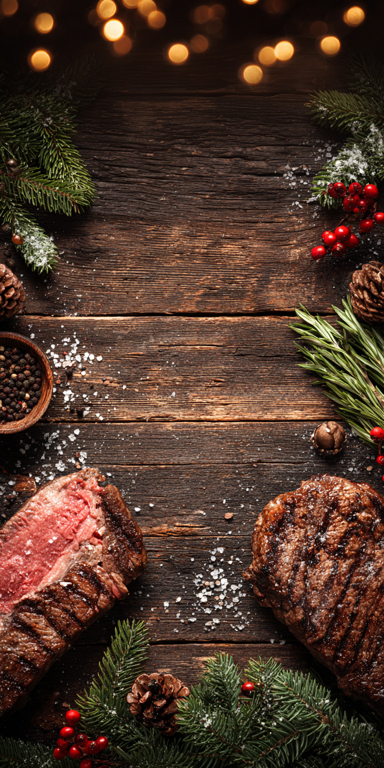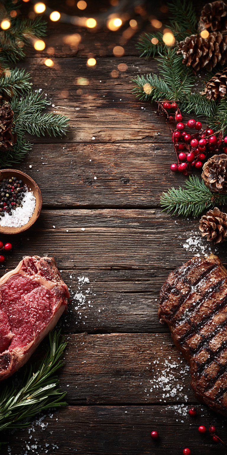 По бокам — стейки, соль, перец, розмарин, еловые ветки, ягоды и шишки.