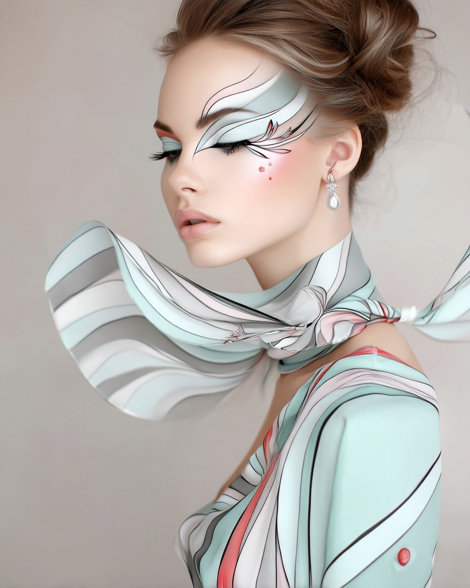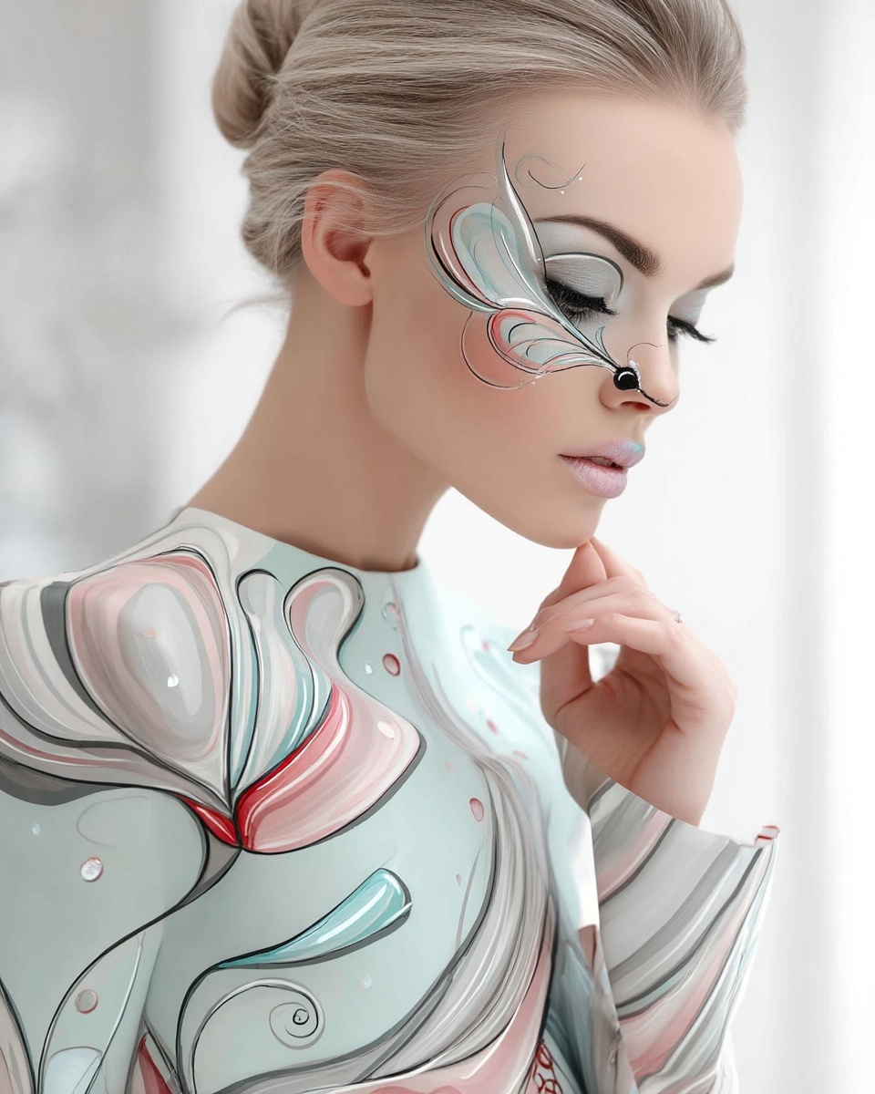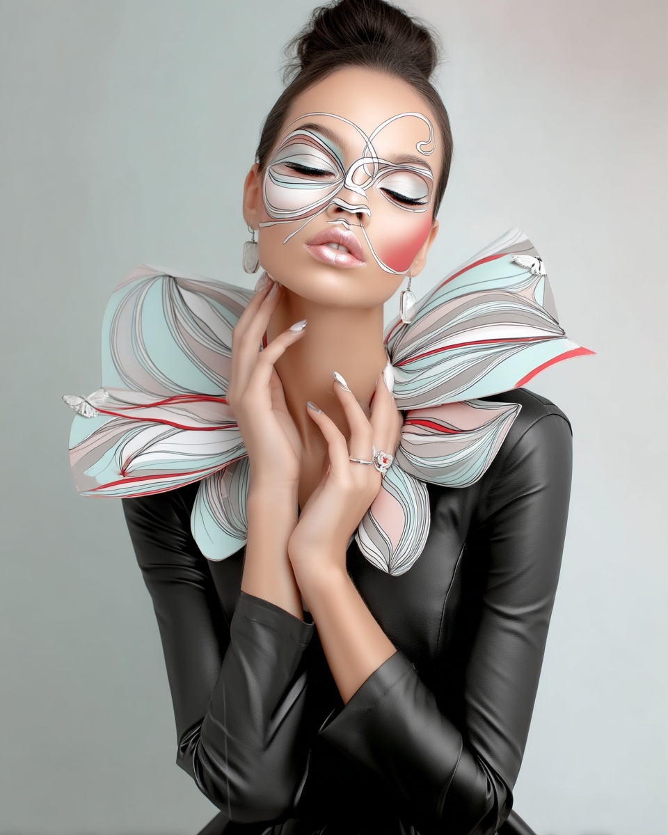 Модель с авангардным макияжем, драматичным стилем и глянцевым освещением.