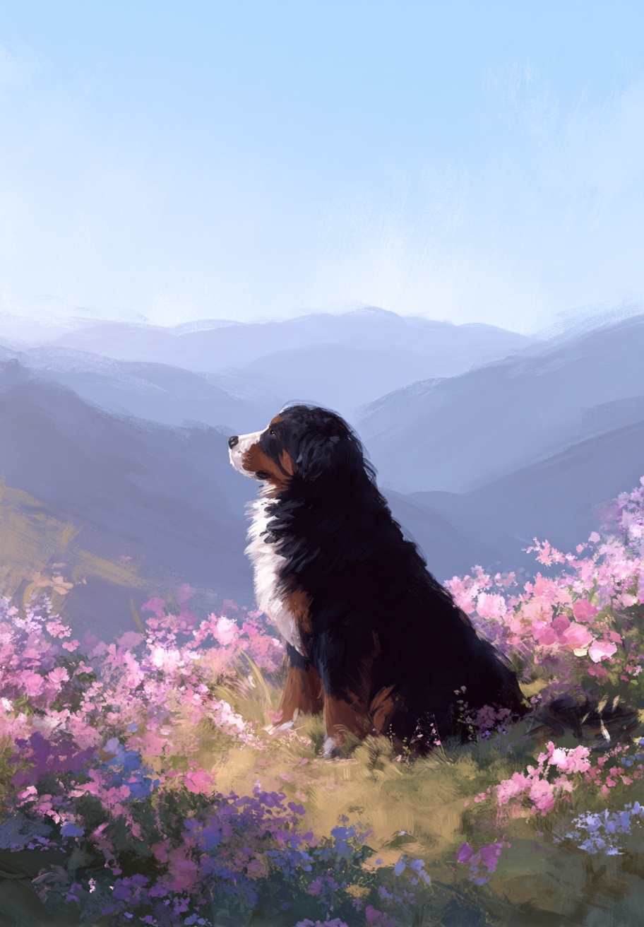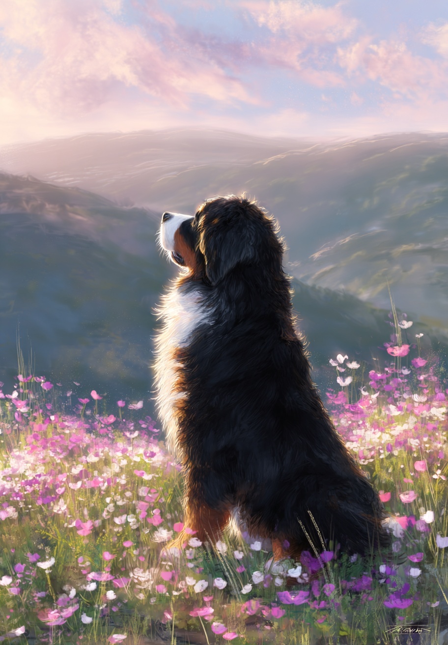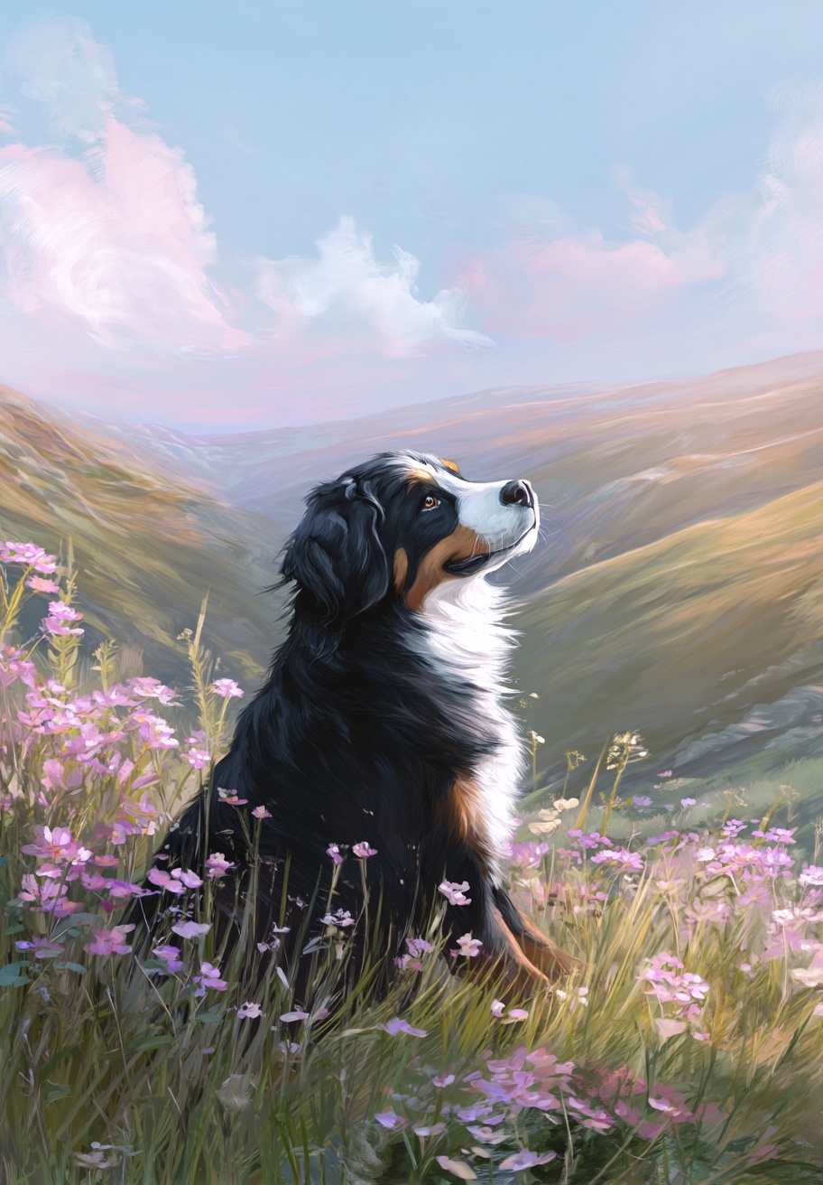 Милый щенок бернского зенненхунда сидит на травянистом холме, смотрит вдаль.