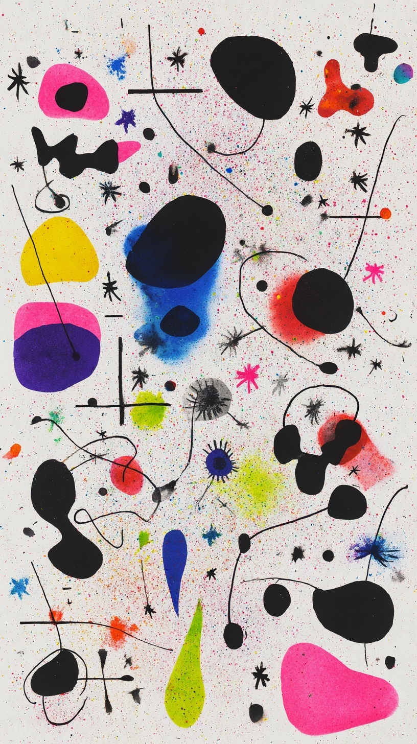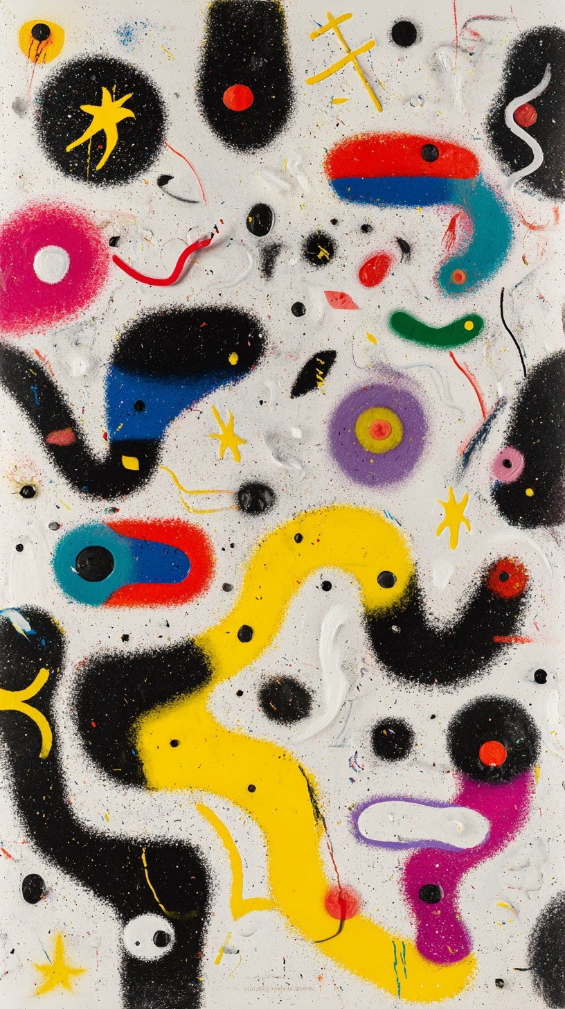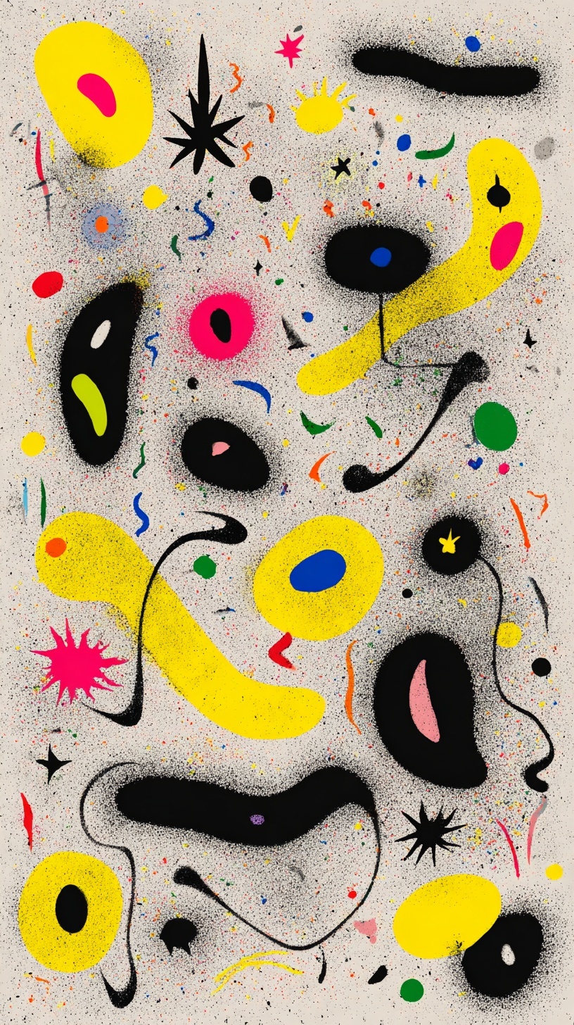 Абстрактная сюрреалистичная картина в стиле Жоана Миро: игривые биоморфные формы, чёткие чёрные контуры, звёздочки и точки, яркие основные цвета.