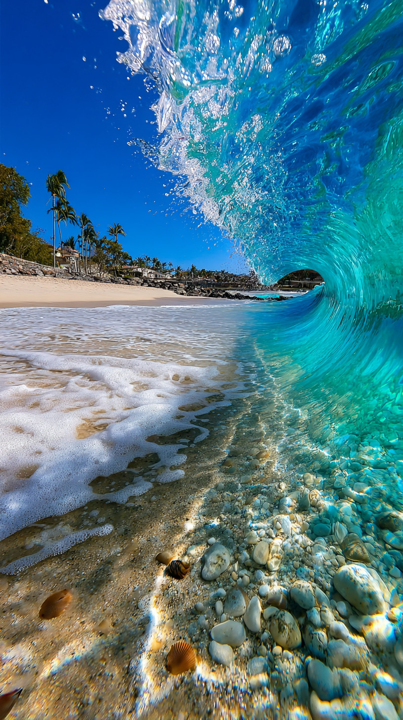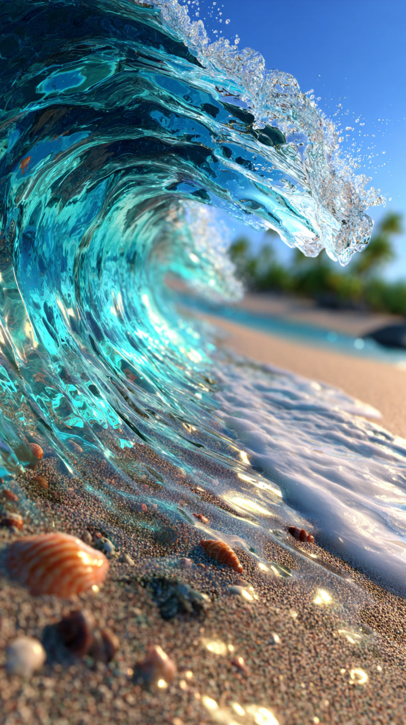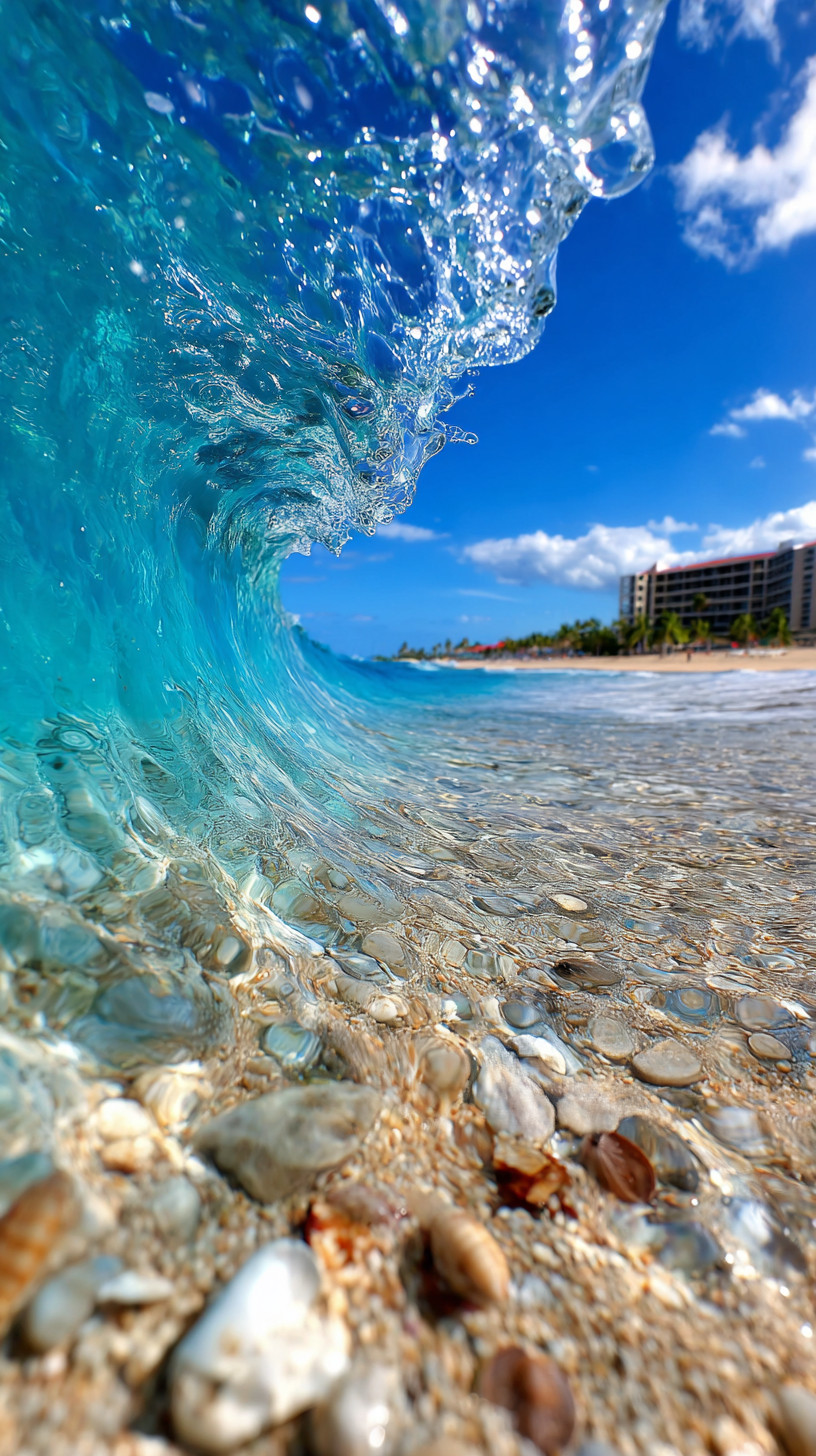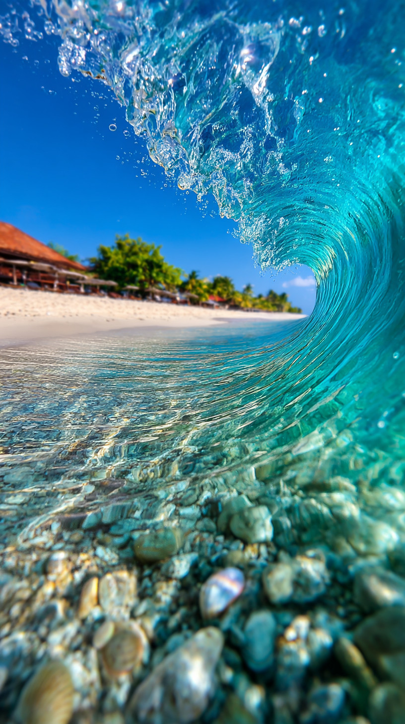 Крупный план изнутри волны: океанская волна накатывает на белый песок тропического пляжа.