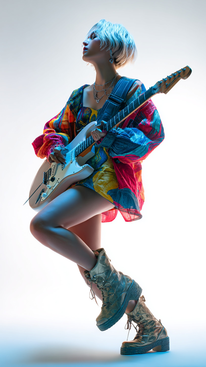 Девушка в яркой куртке и мини-юбке играет на электрогитаре в динамичной позе.