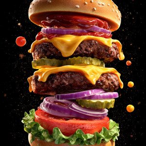 Реалистичный гамбургер, все слои и компоненты которого парят друг над другом. Динамичная композиция в движении, аппетитный образ.
