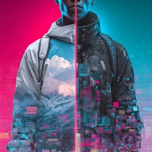 Модный постер: силуэт в котором сочетаются человек и стилизованный 3D-аватар с асимметричной идентичностью.