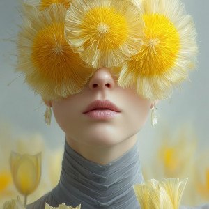 Портрет элегантной женщины, лицо которой скрыто крупными желтыми одуванчиками и тюльпанами.