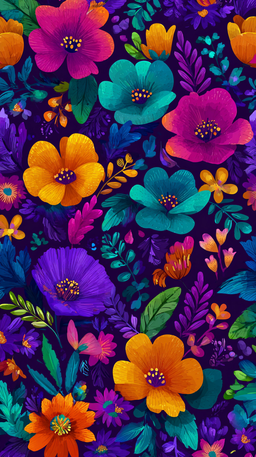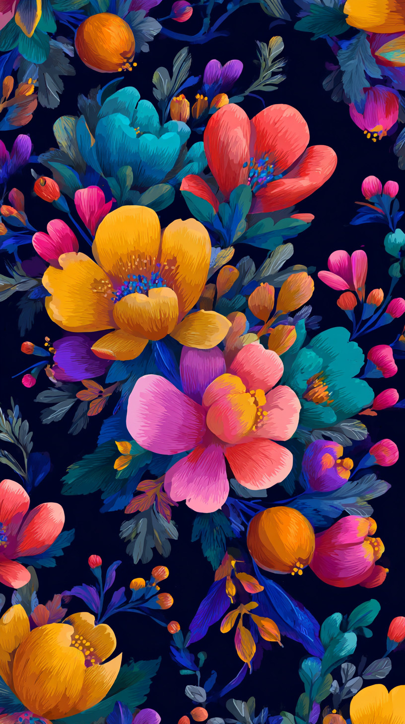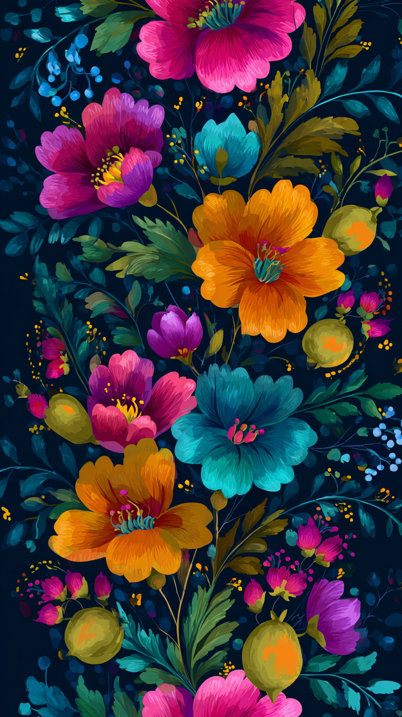 Стильный и яркий узор с яркими цветами на тёмном фоне. Орнамент в фольклорном стиле для текстиля или обоев.