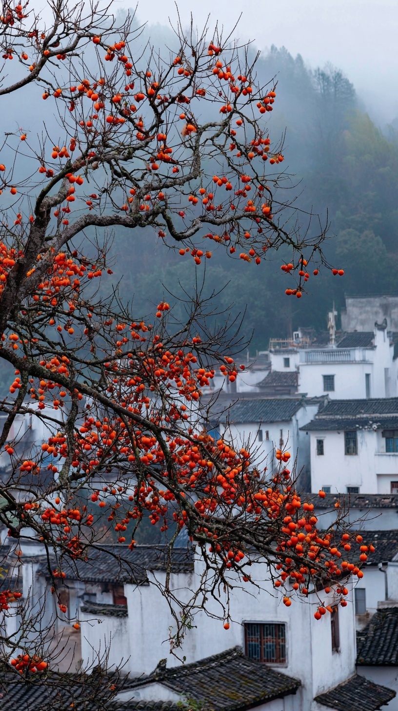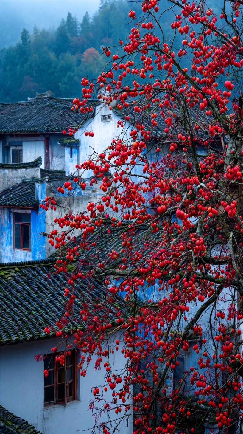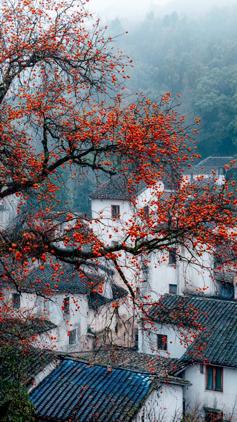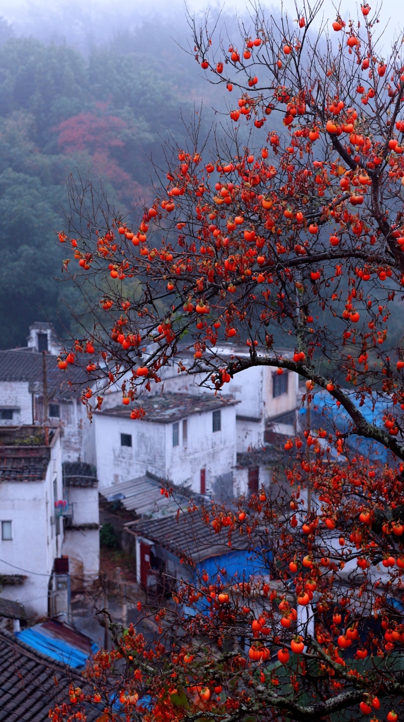 Горный пейзаж поздней осени: хурма с алыми плодами, дома с синей черепицей в тумане после дождя.