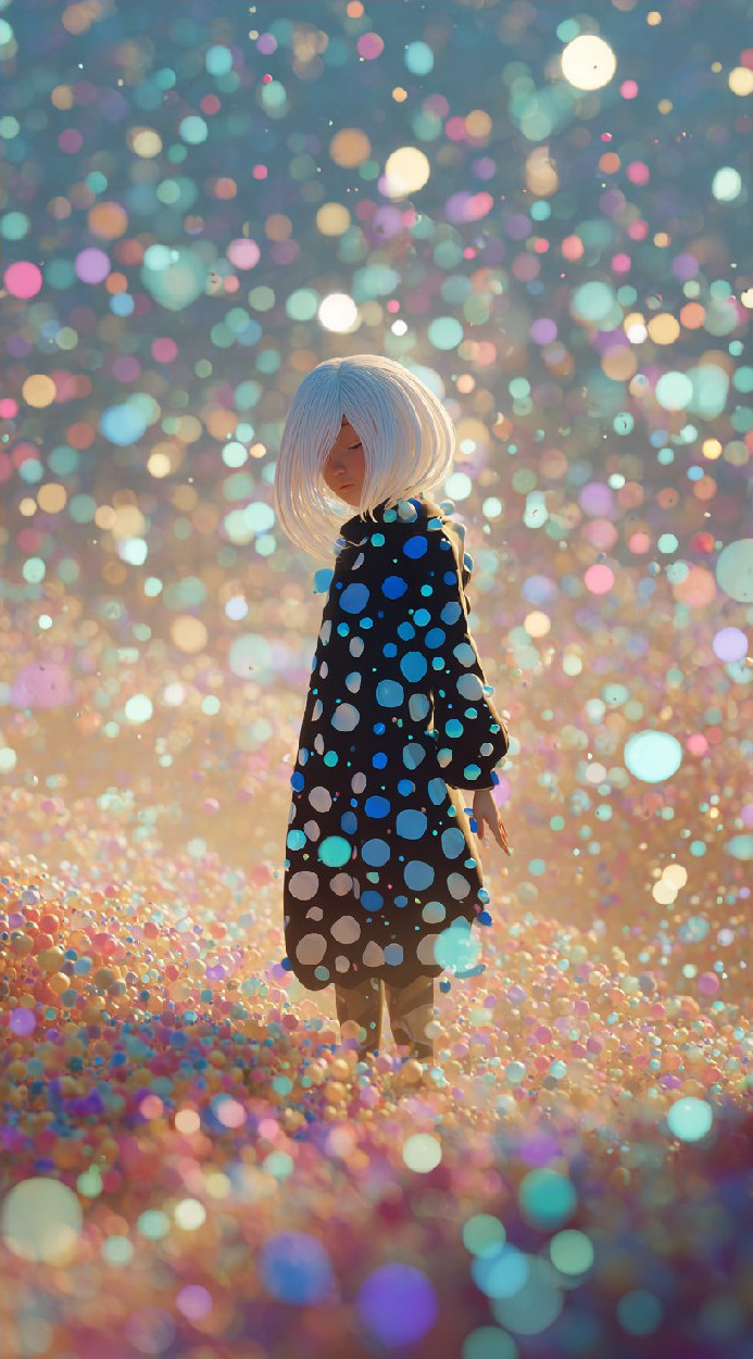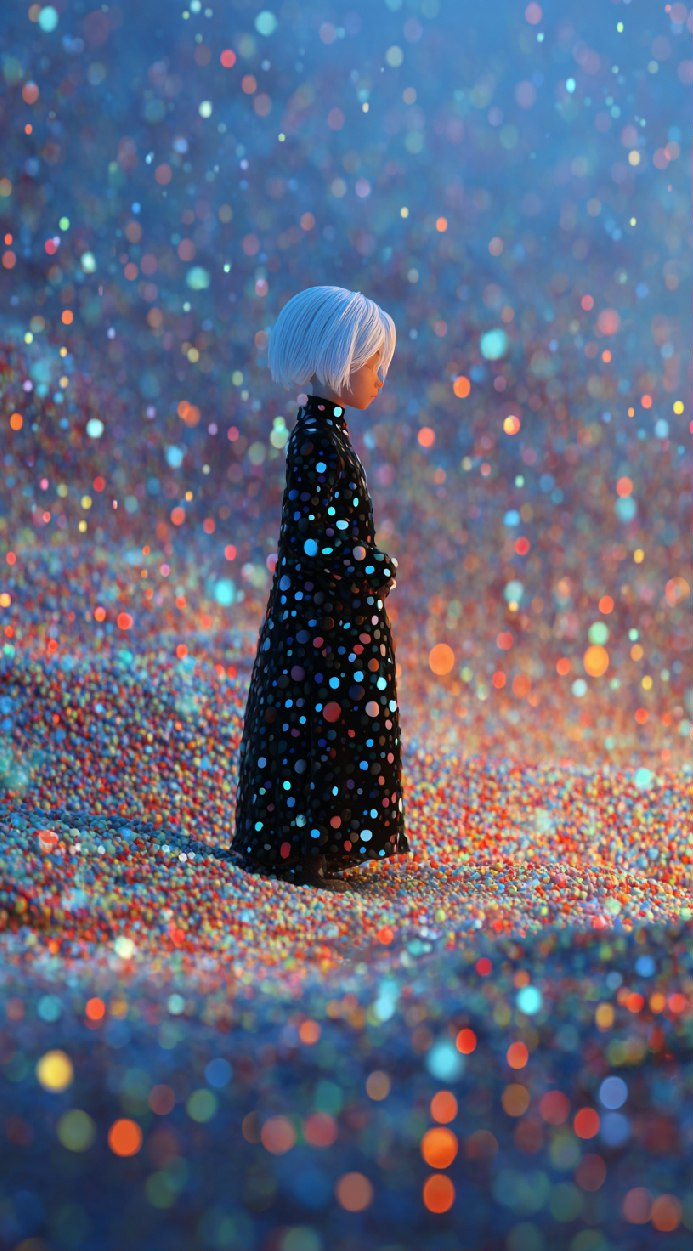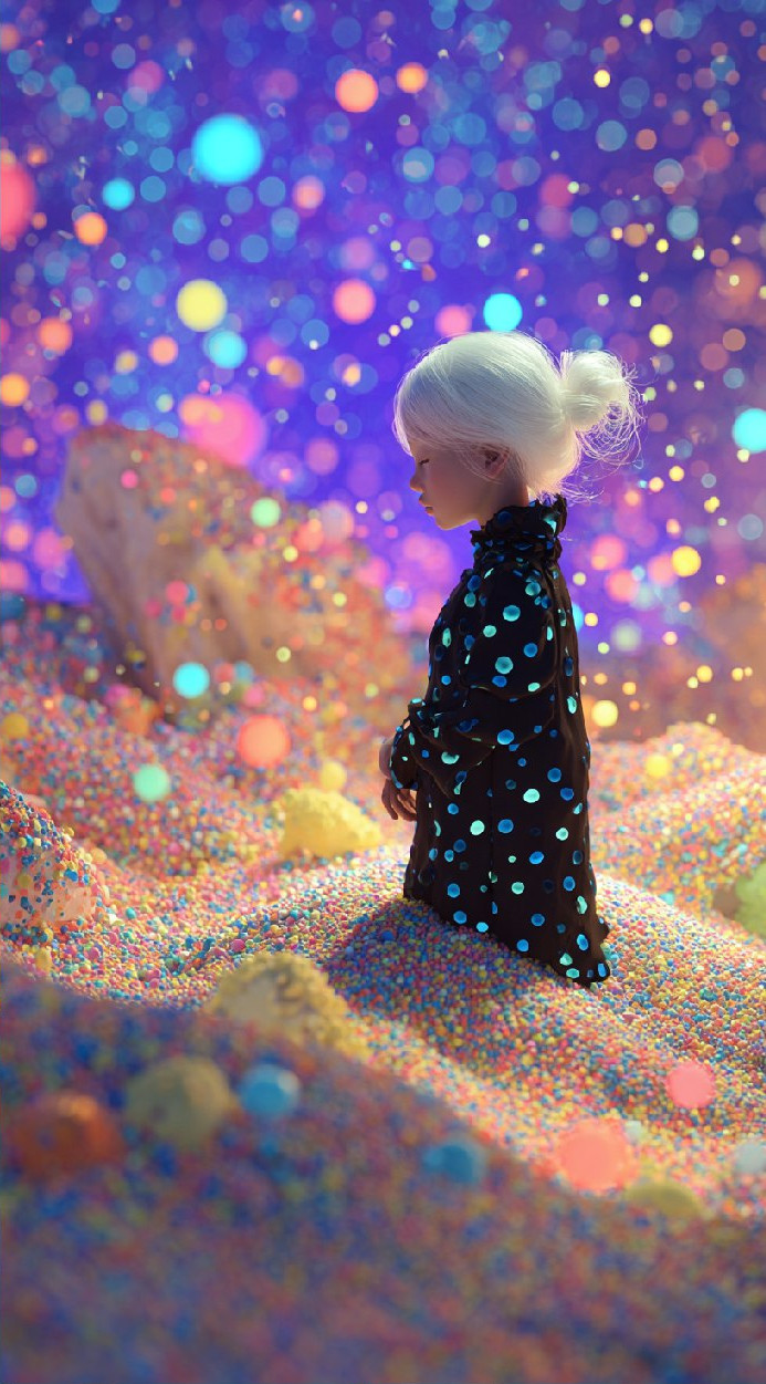 Девочка с белыми волосами в платье в горошек стоит в море разноцветных песчинок.