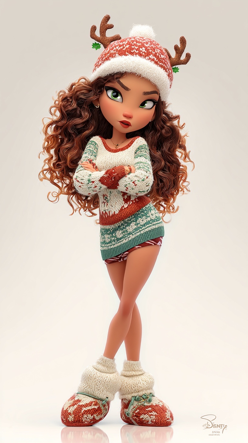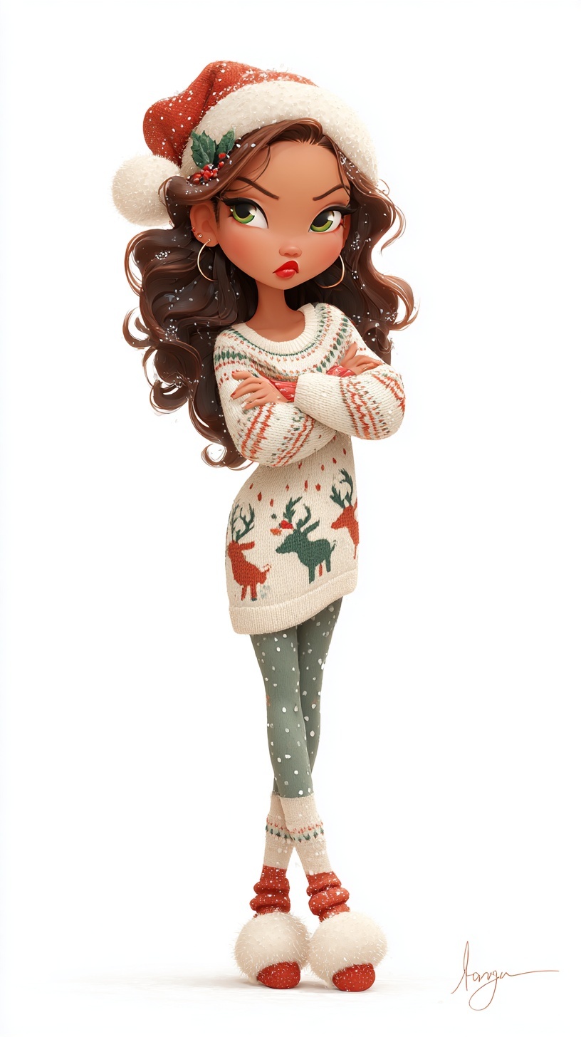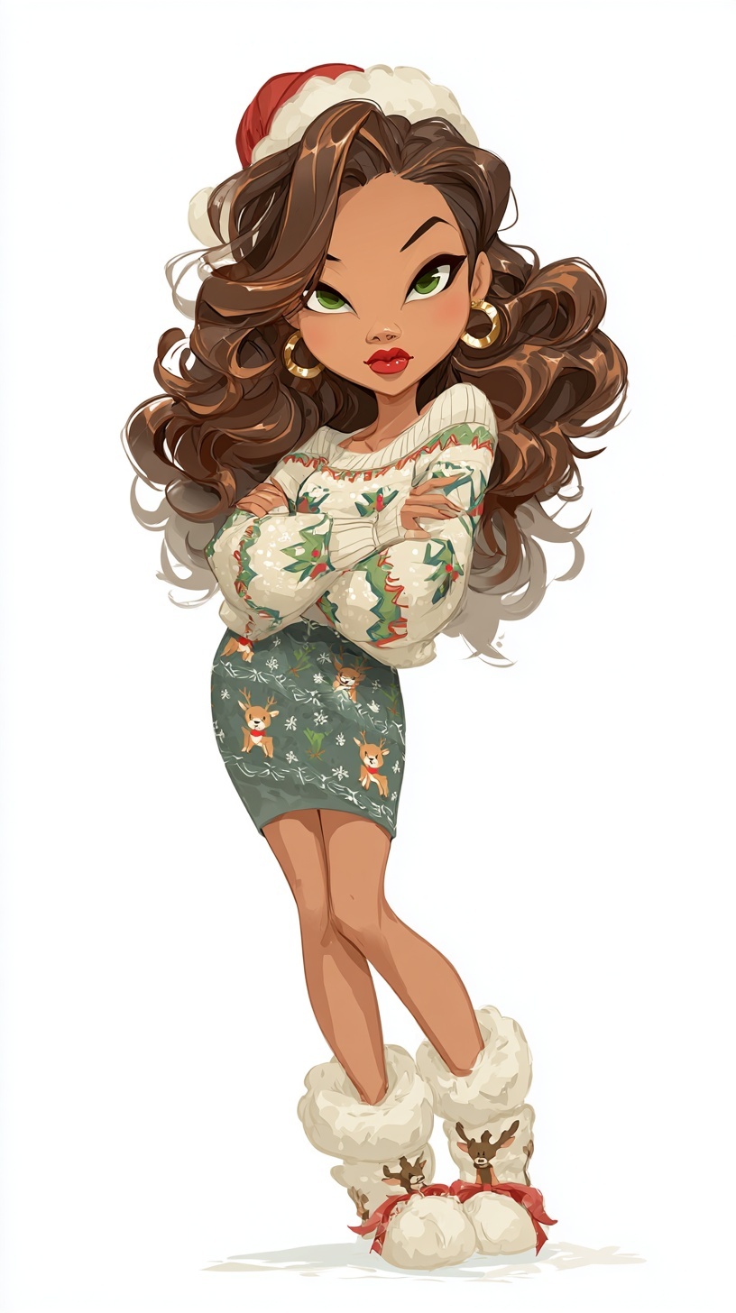 Милый и обаятельный карикатурный чиби-персонаж: афроамериканская девушка с длинными каштановыми волосами, зелёными глазами.