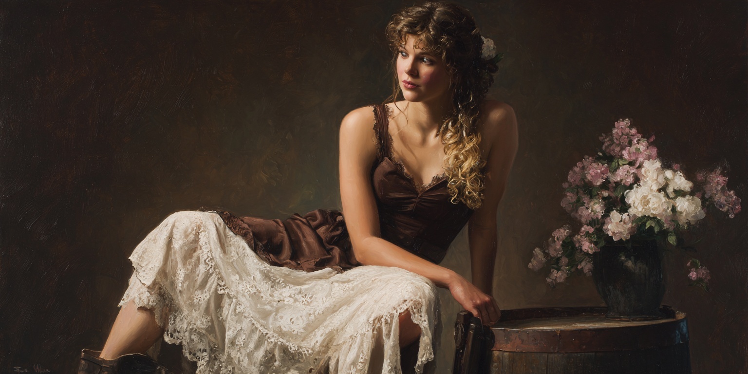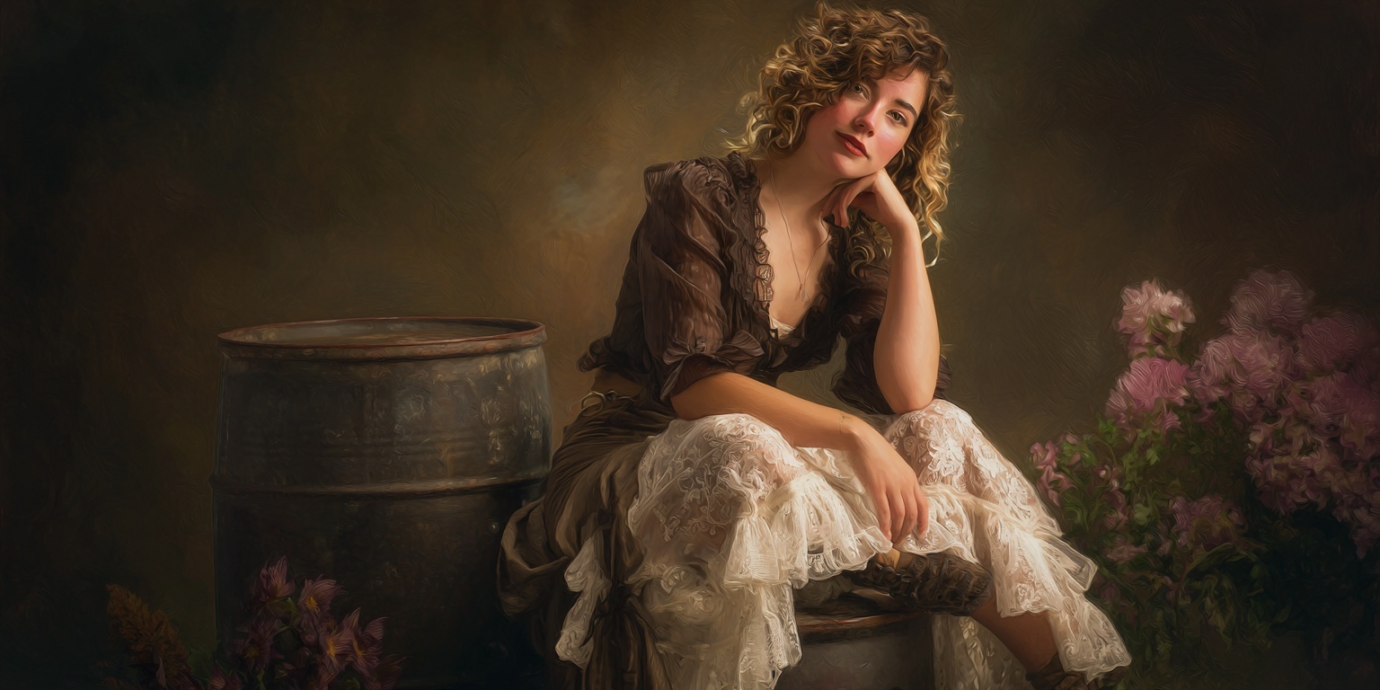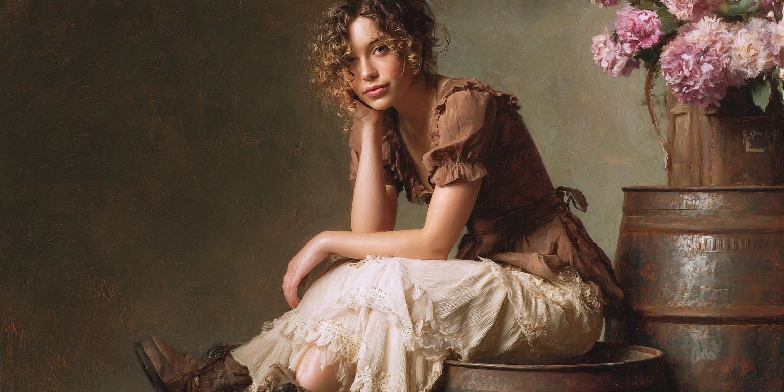 Портрет девушки, темные кудри со светлыми прядями, мягкий свет и цветы создают романтичную атмосферу в стиле Дэвида Ула