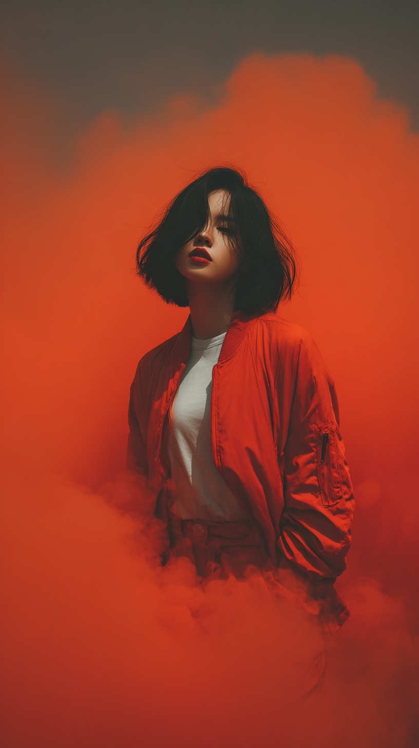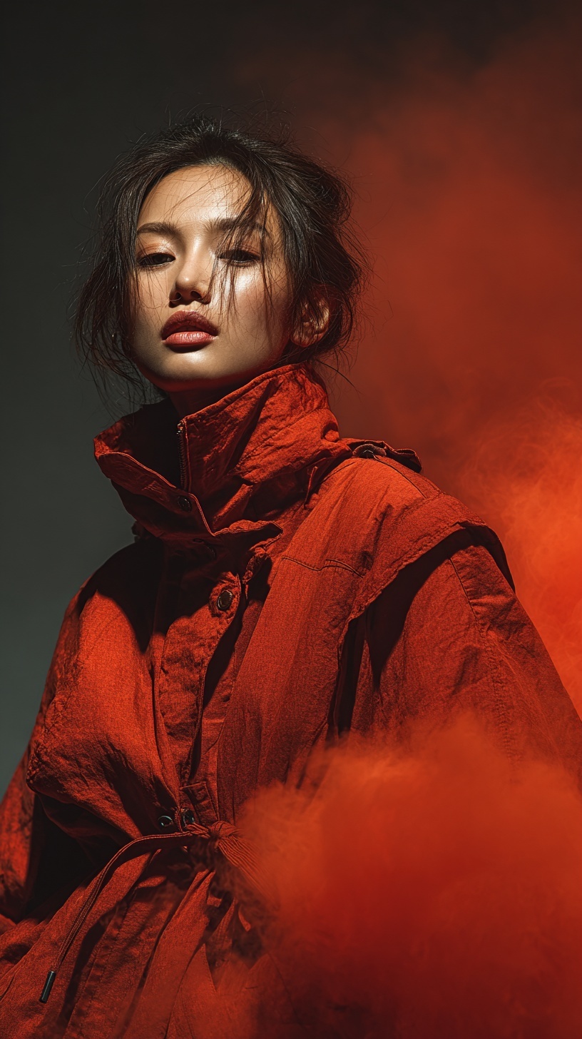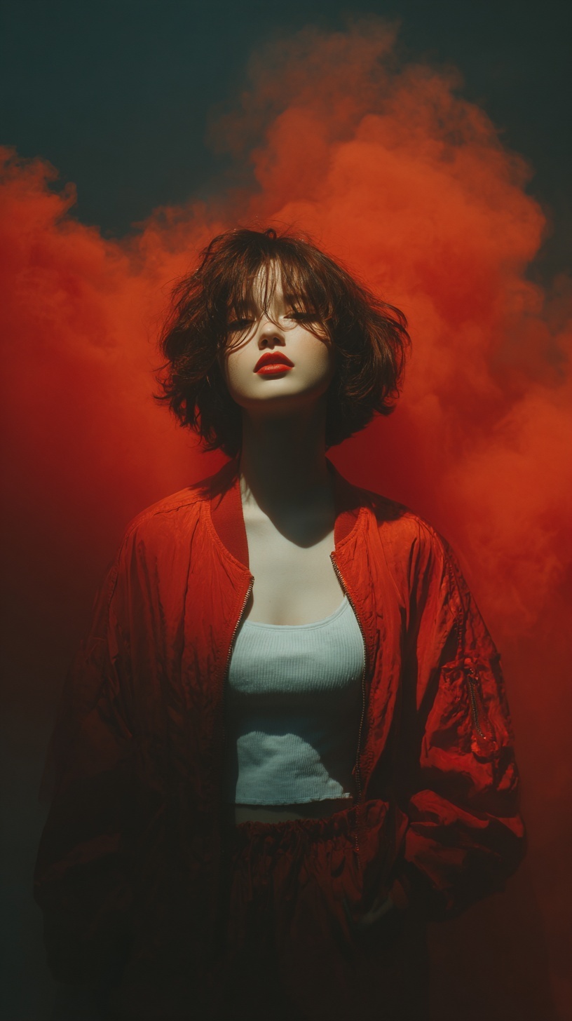 Модная фотография где модель в центре кадра в красном костюме, окруженная облаком красного тумана на черном фоне.
