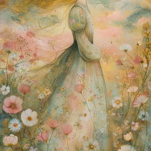 Мечтательная летняя сцена в акварельном стиле: нежная девушка с длинными развевающимися волосами и струящимся платьем стоит в поле летних цветов.
