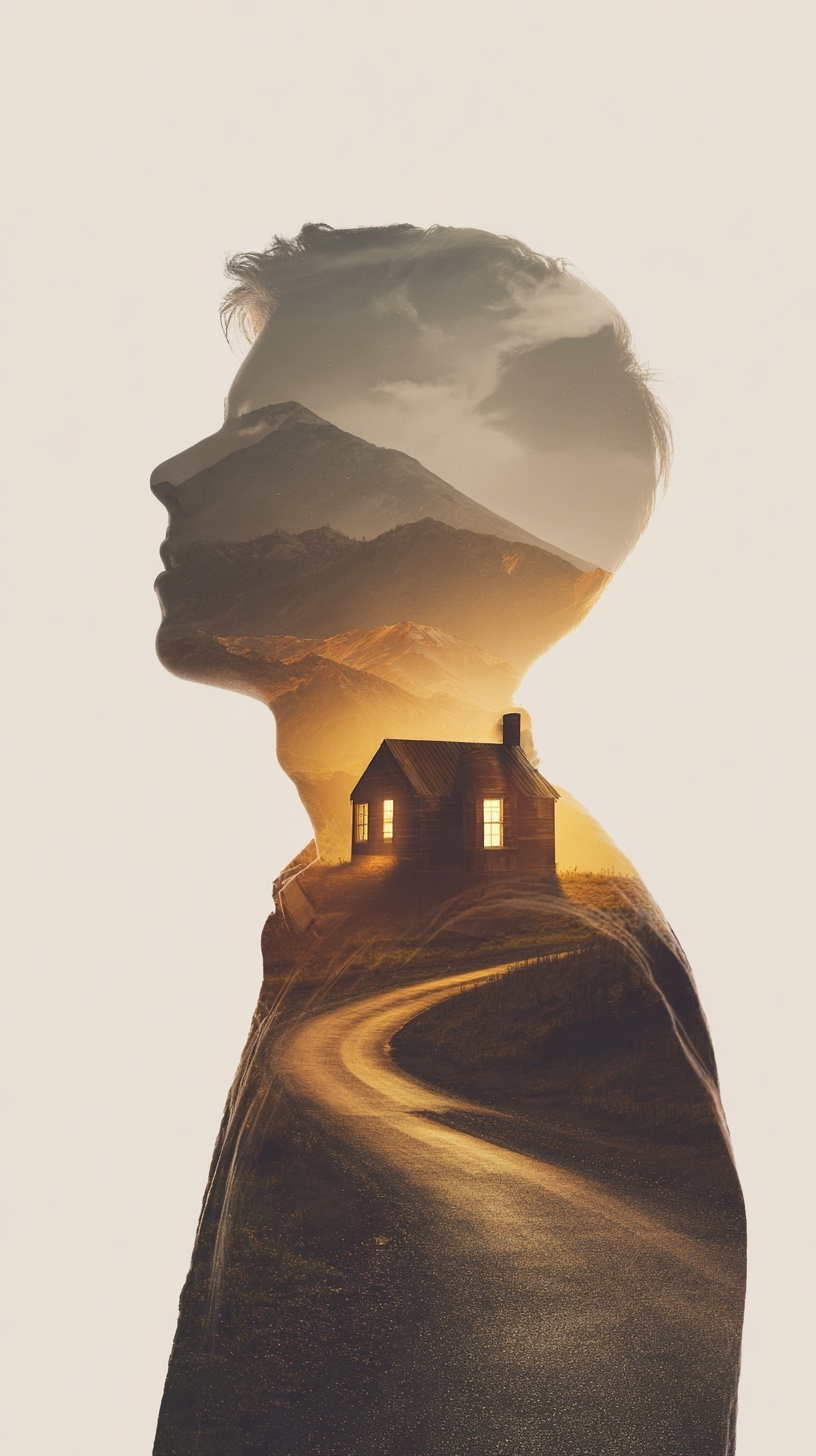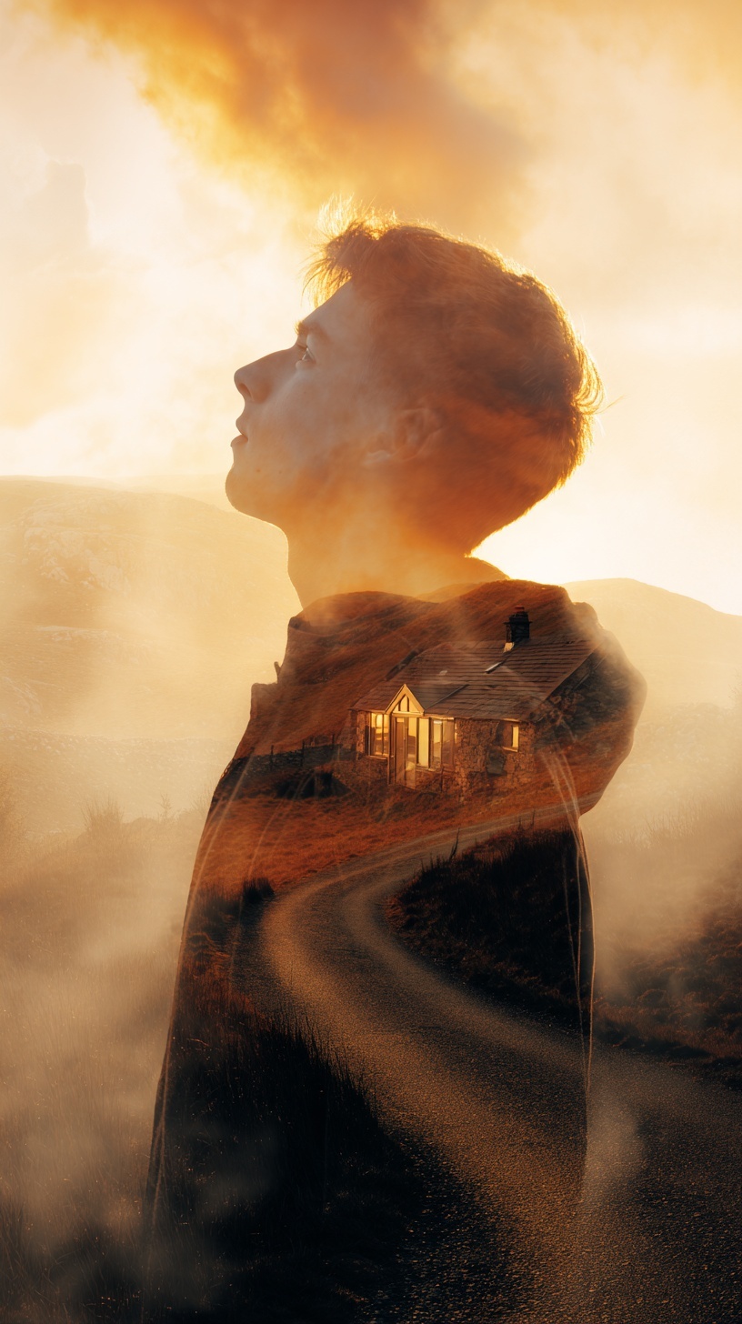 Тёплый свет окон, дорога домой, мягкие сумерки, эмоциональная атмосфера.