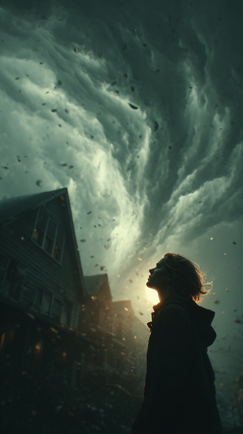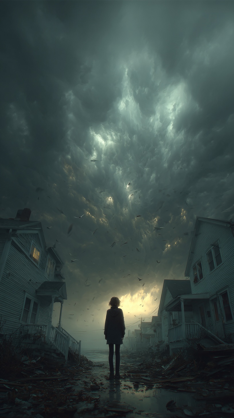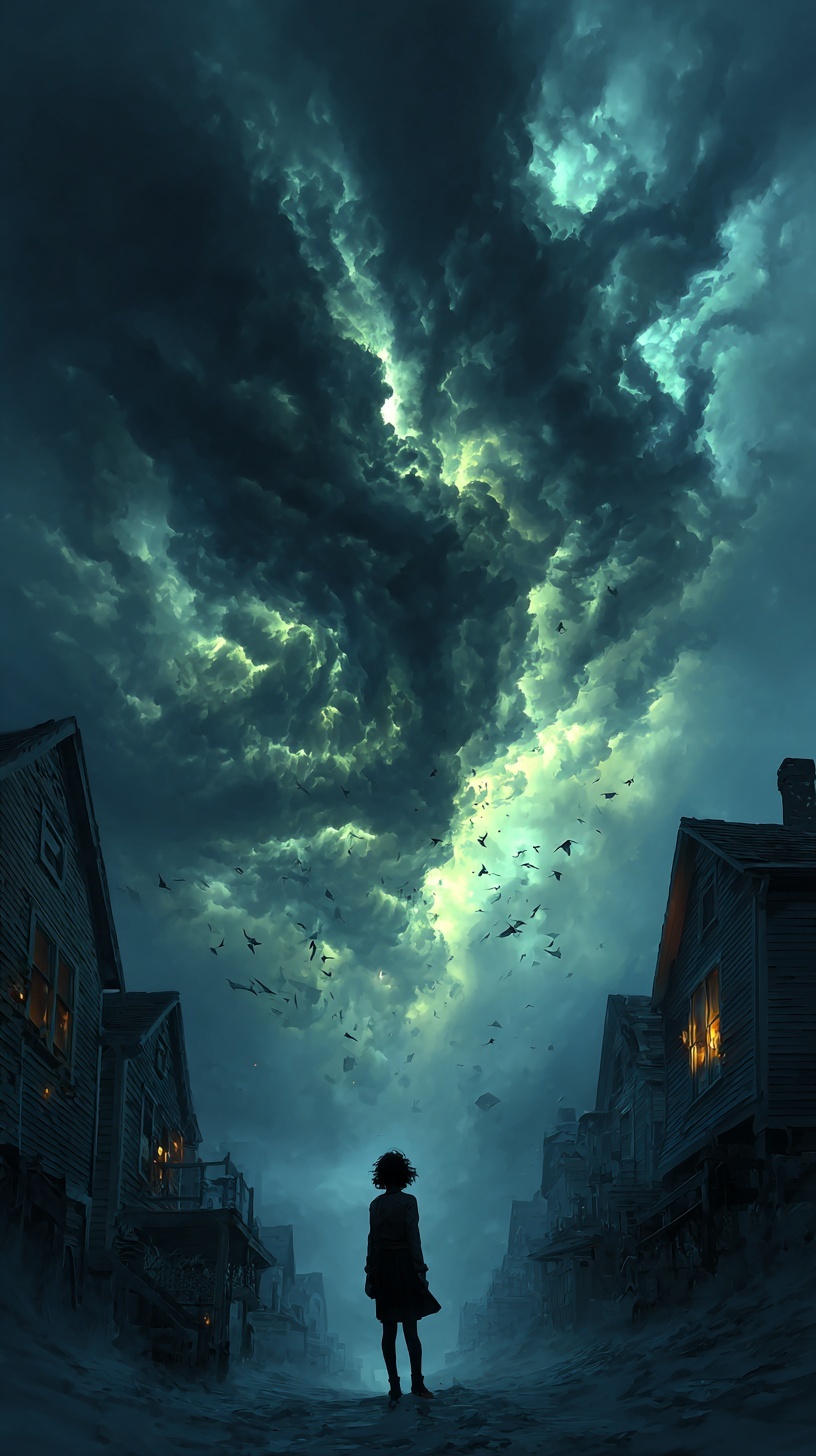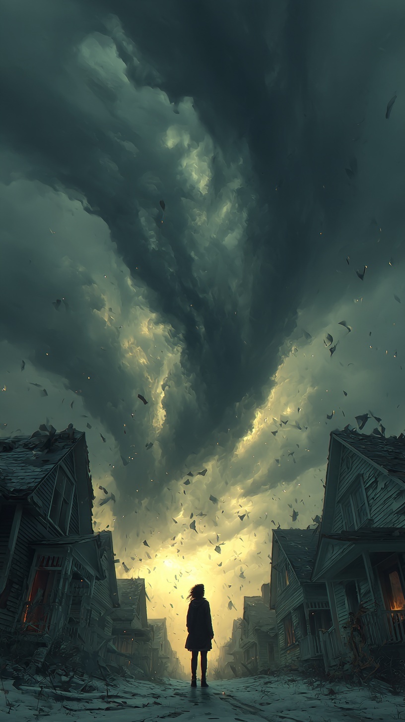 Под ногами земля содрогается, а дома вокруг как игрушки, отрываются от земли, их каркасы скрипят в немом ужасе. Её силуэт единственная неподвижная точка в апокалиптическом хаосе.
