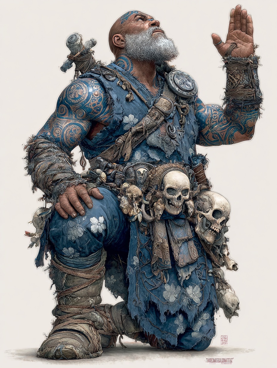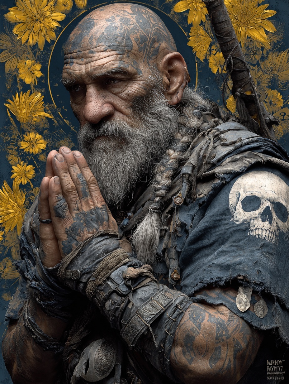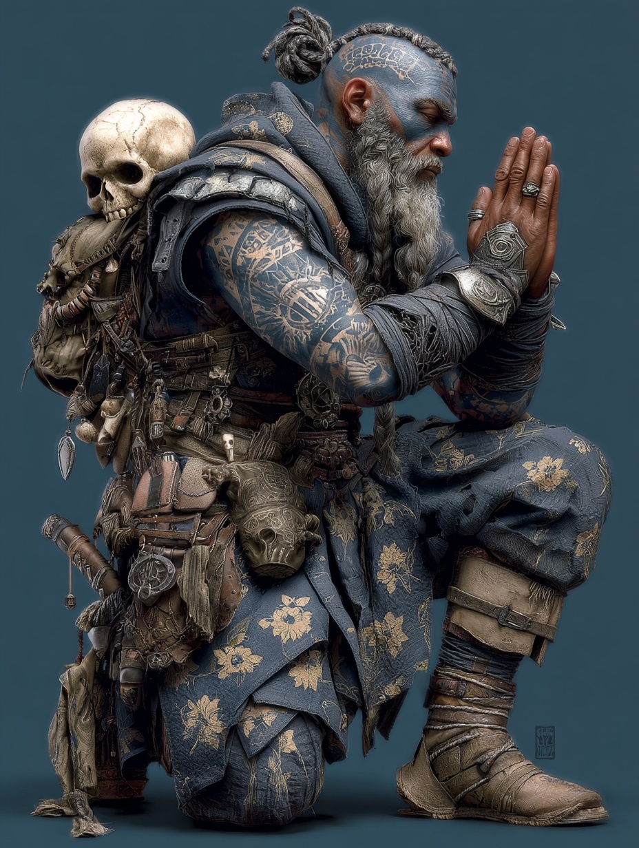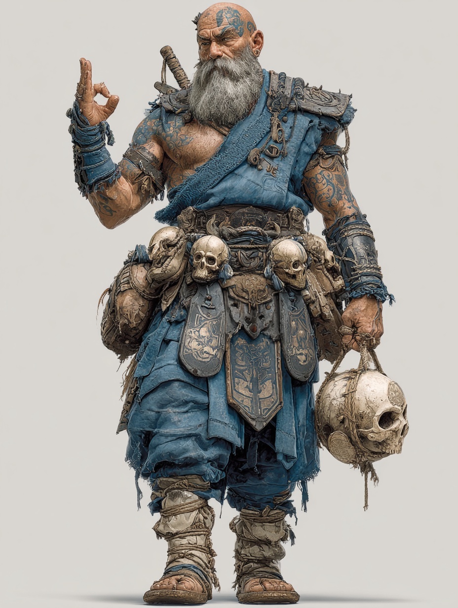 Дворф-монах с бритой головой и седой заплетённой бородой