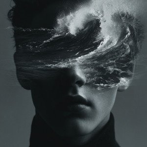 Сюрреалистичный портрет с двойной экспозицией: лицо молодого мужчины, плавно сливается с мощным океанским штормом.