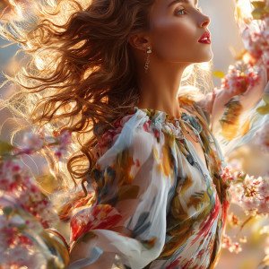 Молодая женщина как символ весны: ветер развевает её длинные волосы, окружённая цветущими цветами.