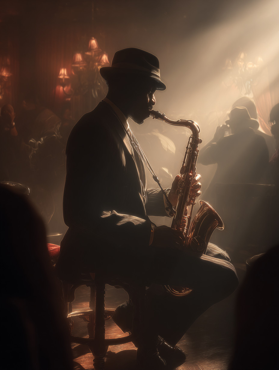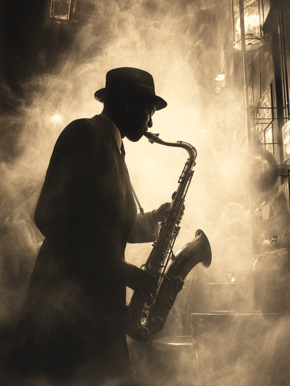 Изображение афроамериканского джазового музыканта 1920-х годов, играющего на саксофоне в дымном ночном клубе.