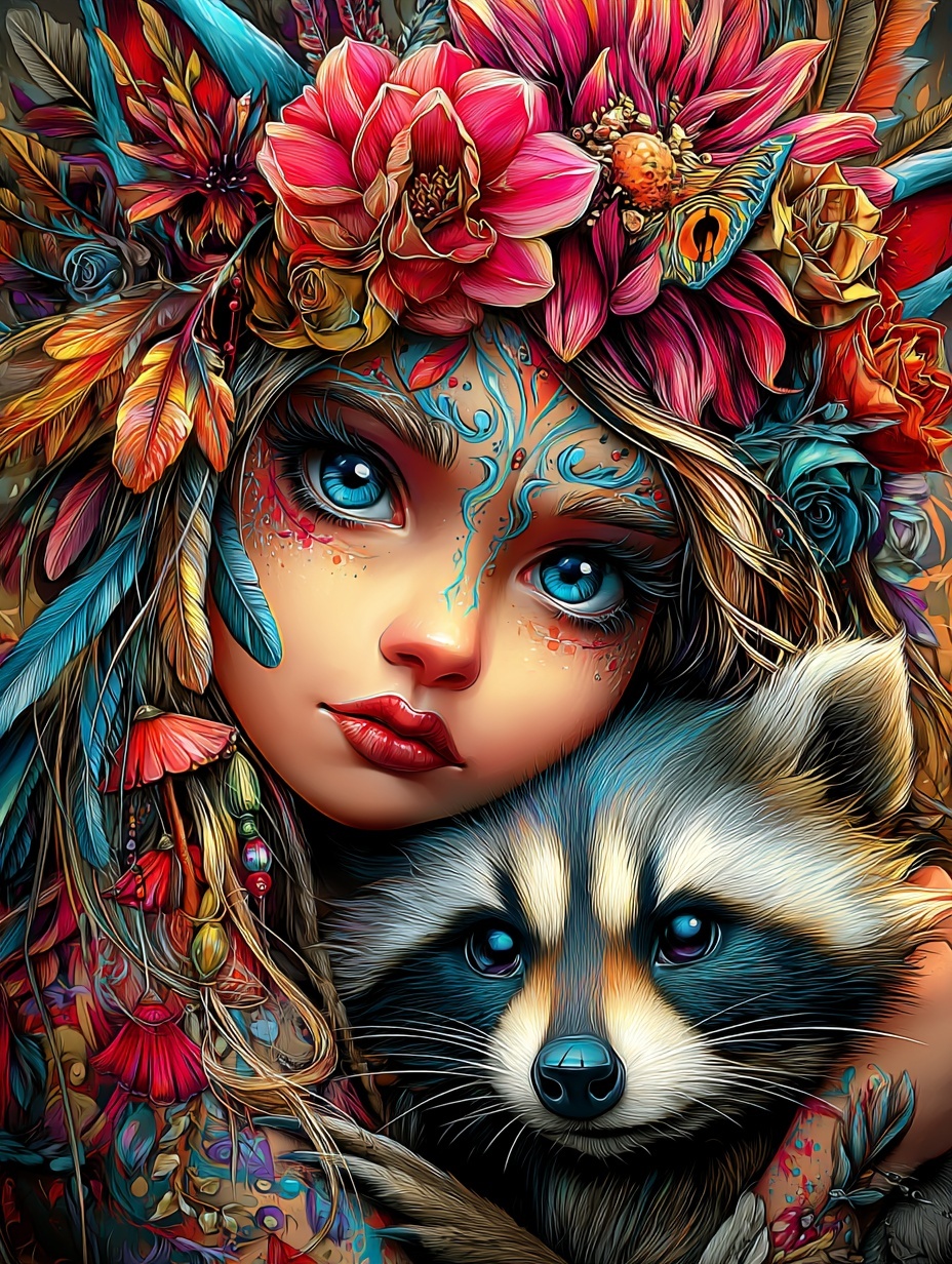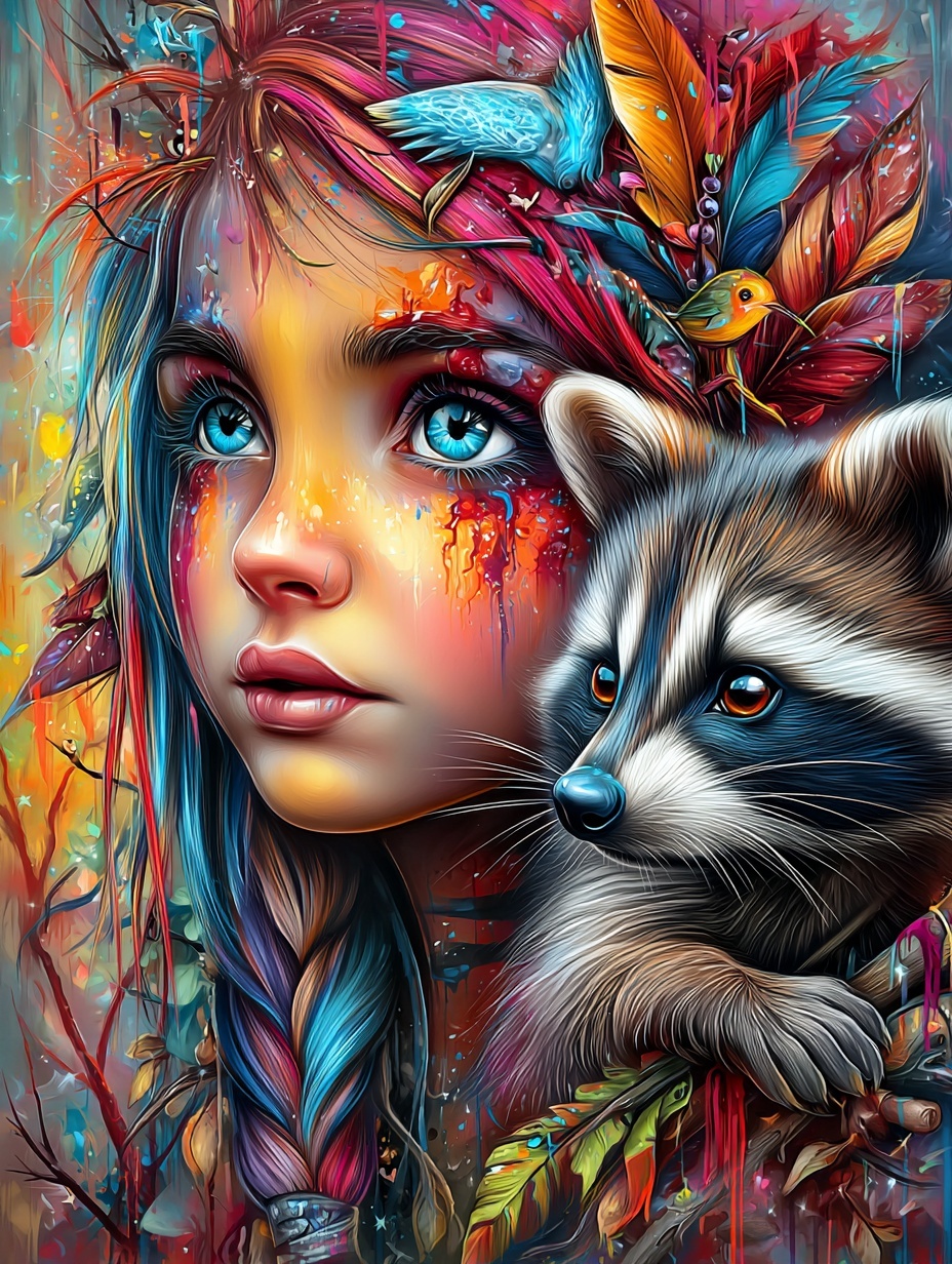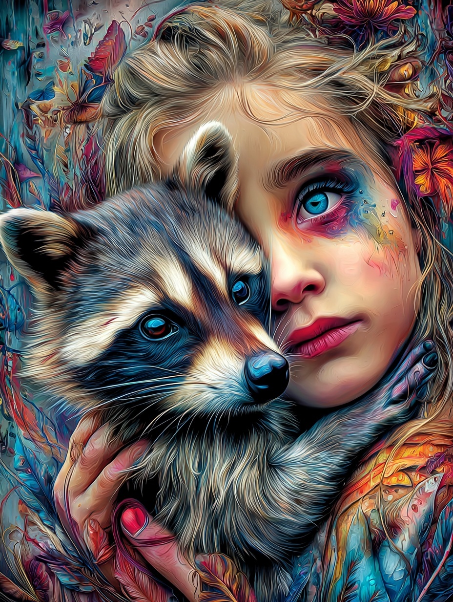 Девочка-эльф с енотом. Фэнтезийный образ, сочетающий магию леса и природную игривость.