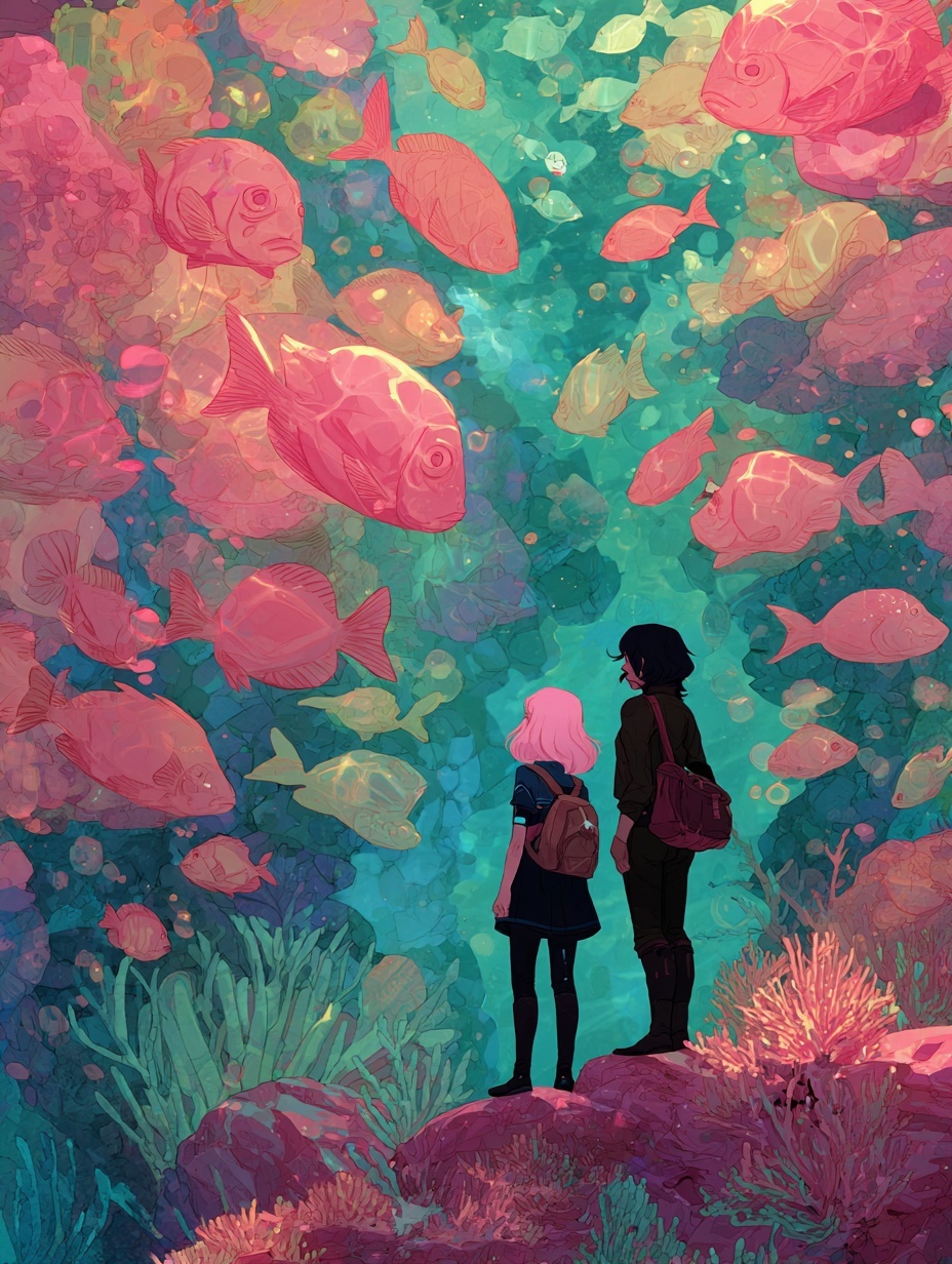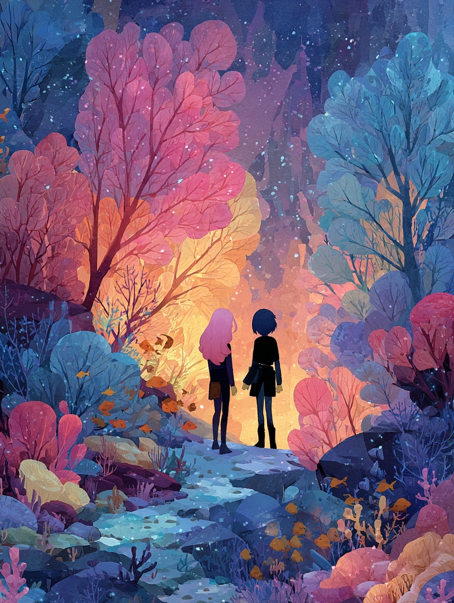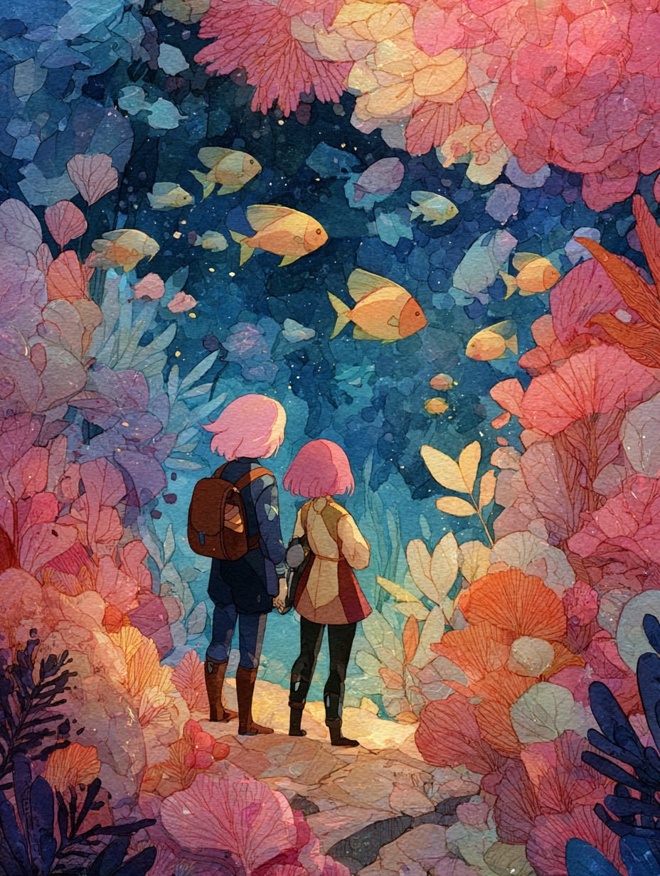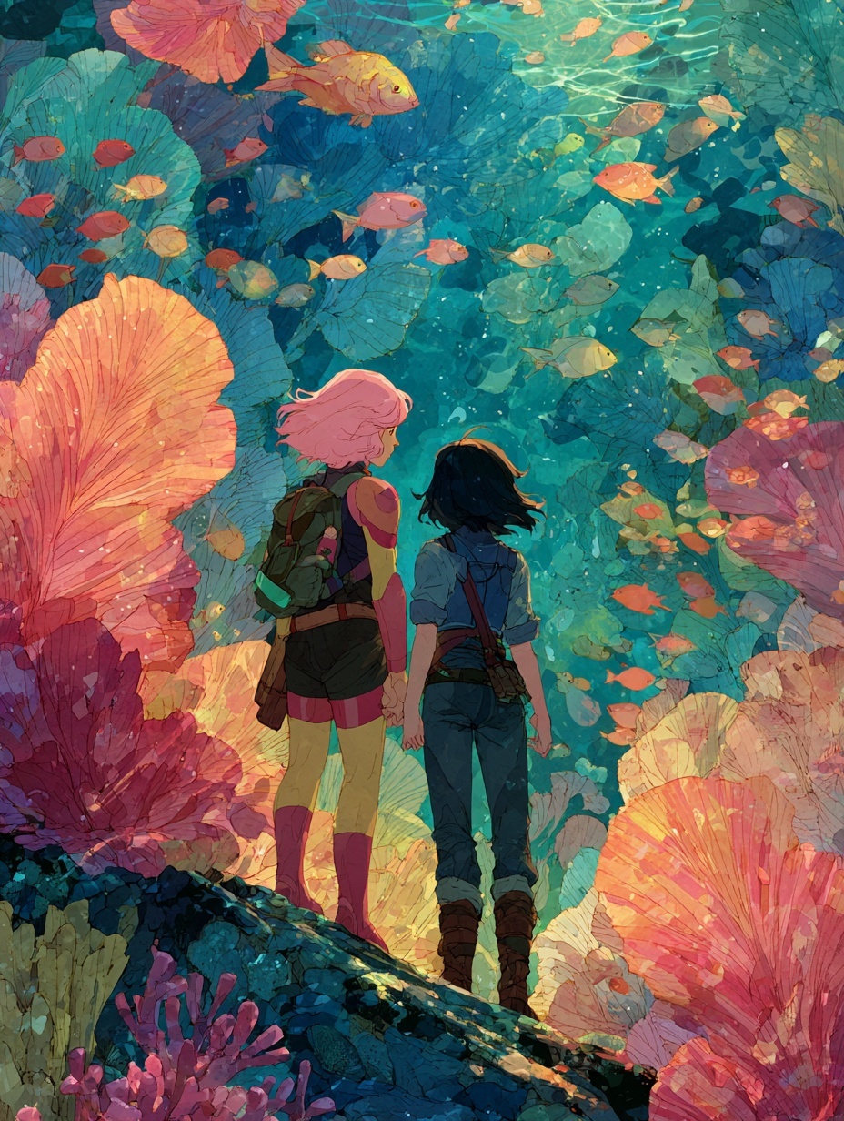Двое подростков стоят на коралловом рифе. Сцена выполнена в мягкой акварельной технике.