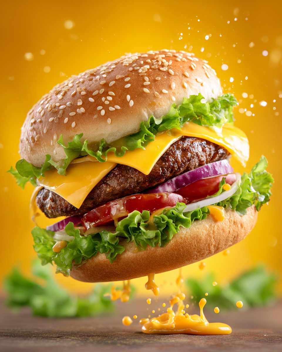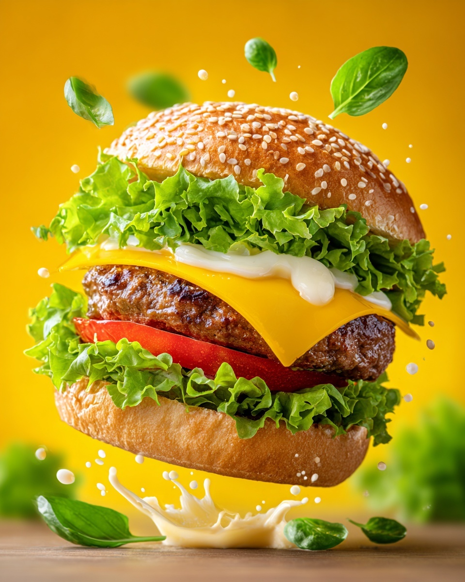 Коммерческая фуд-фотография: ингредиенты бургера (котлета, сыр, салат, булка, соус) застыли в полёте на ярко-жёлтом фоне.