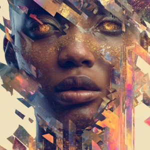 Лицо чернокожей женщины с золотыми глазами и глитч эффектом, фрагментированные и разбитые части парят в воздухе.