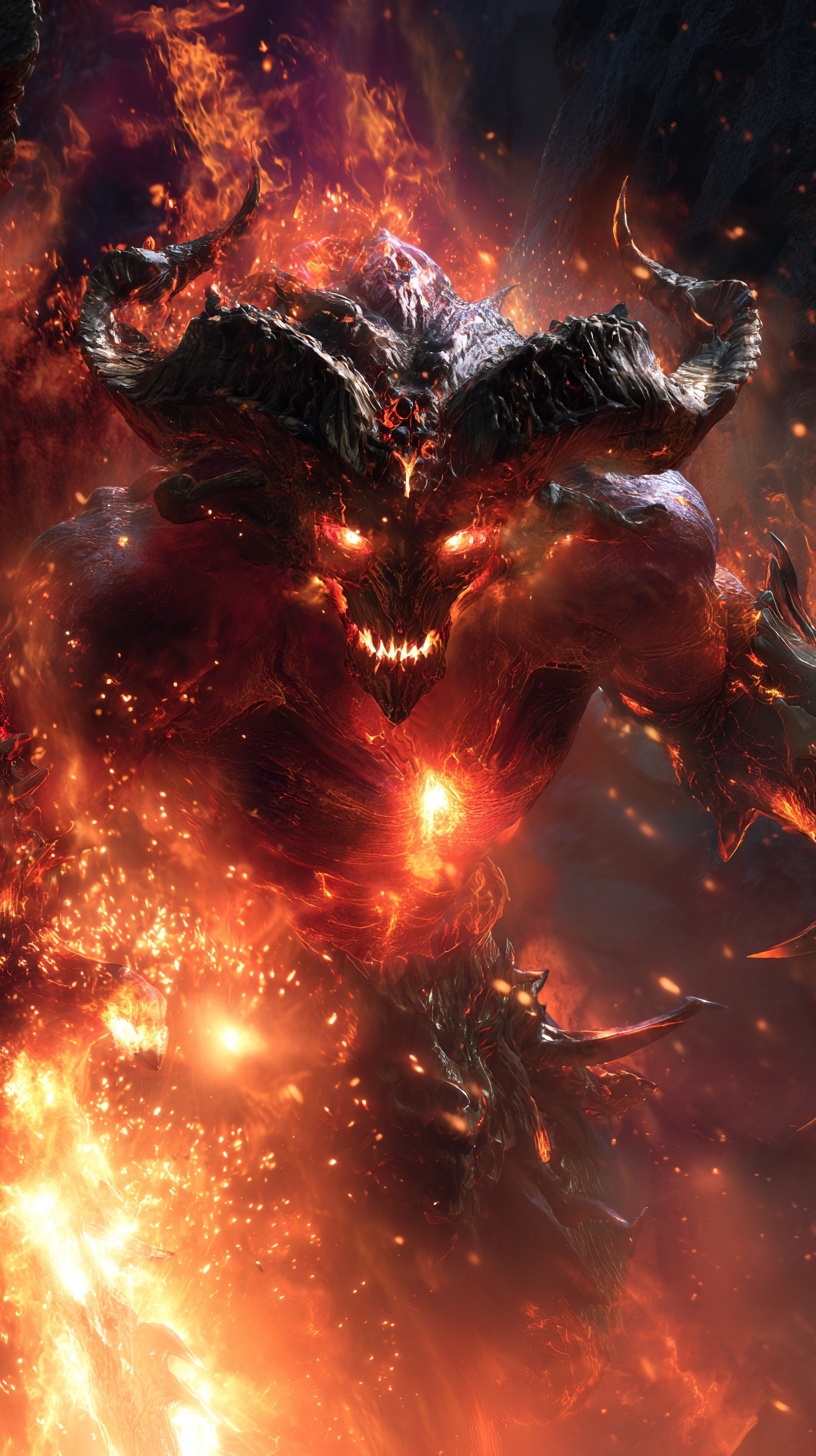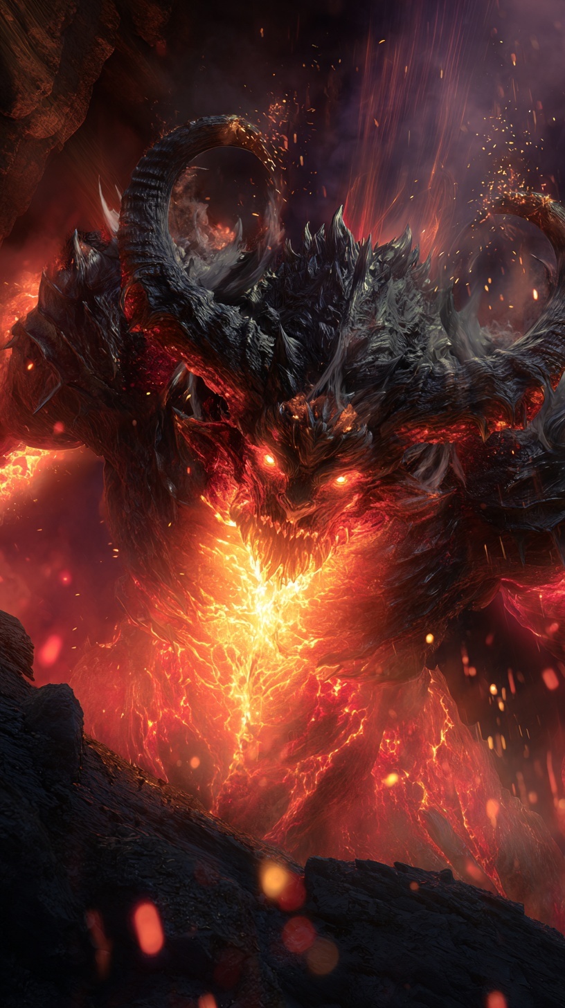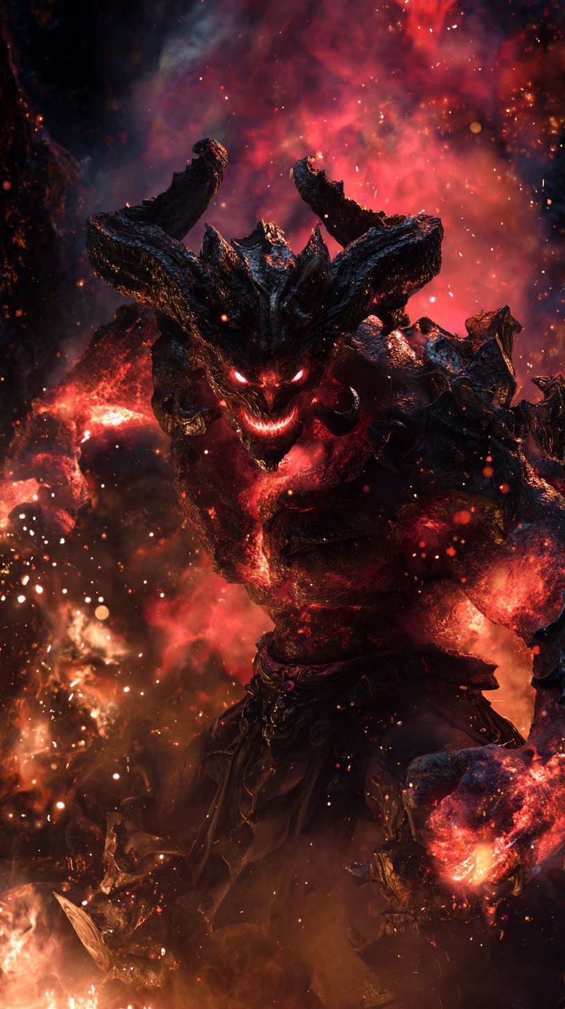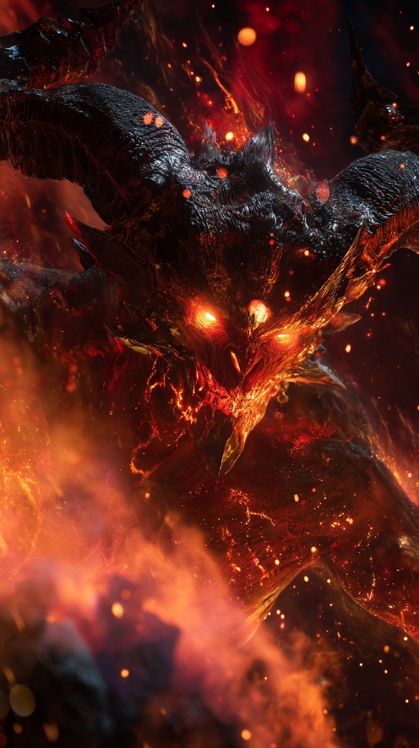 Фэнтези-изображение могущественного демона Ифрита в драматичном близком ракурсе.