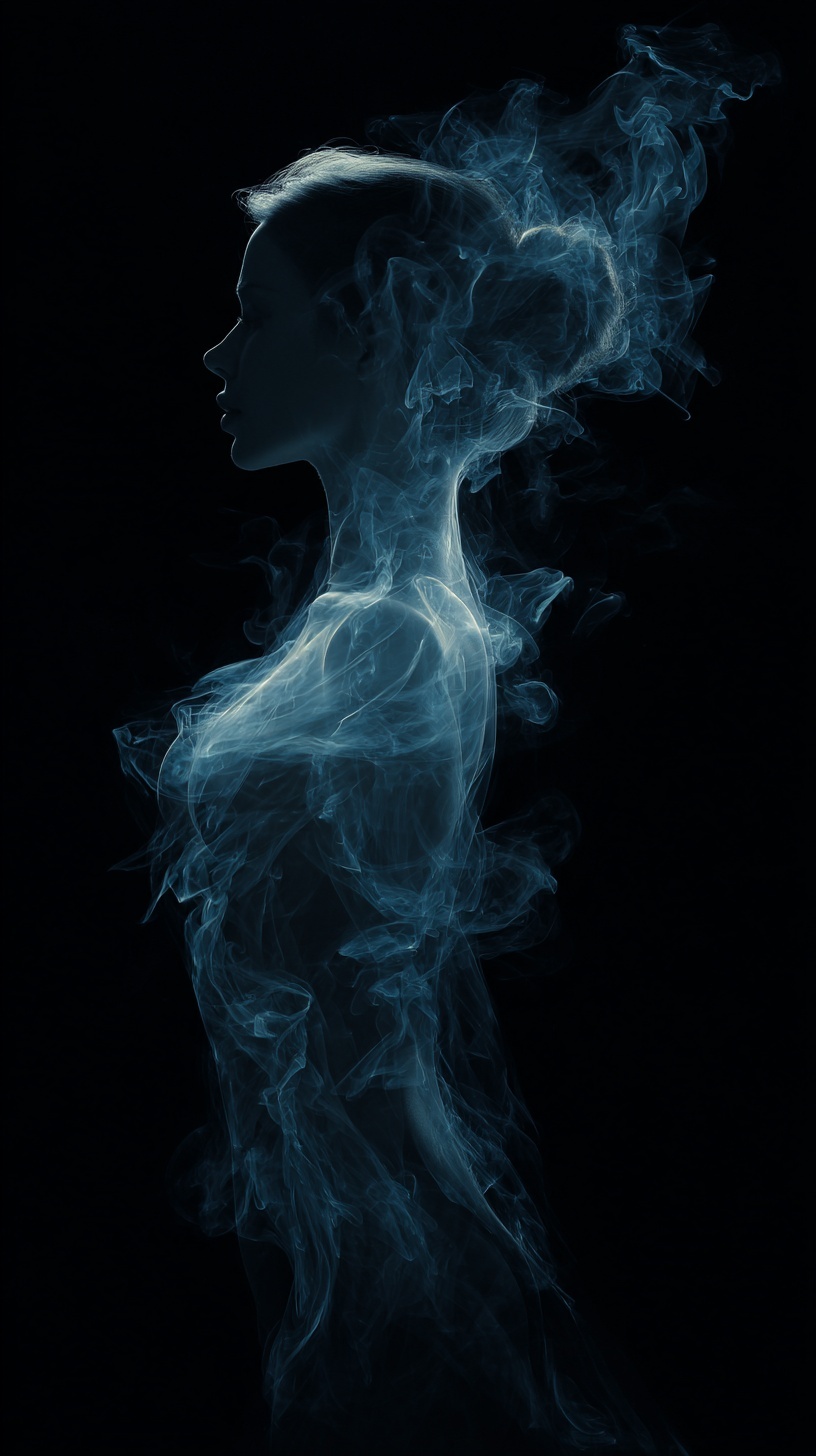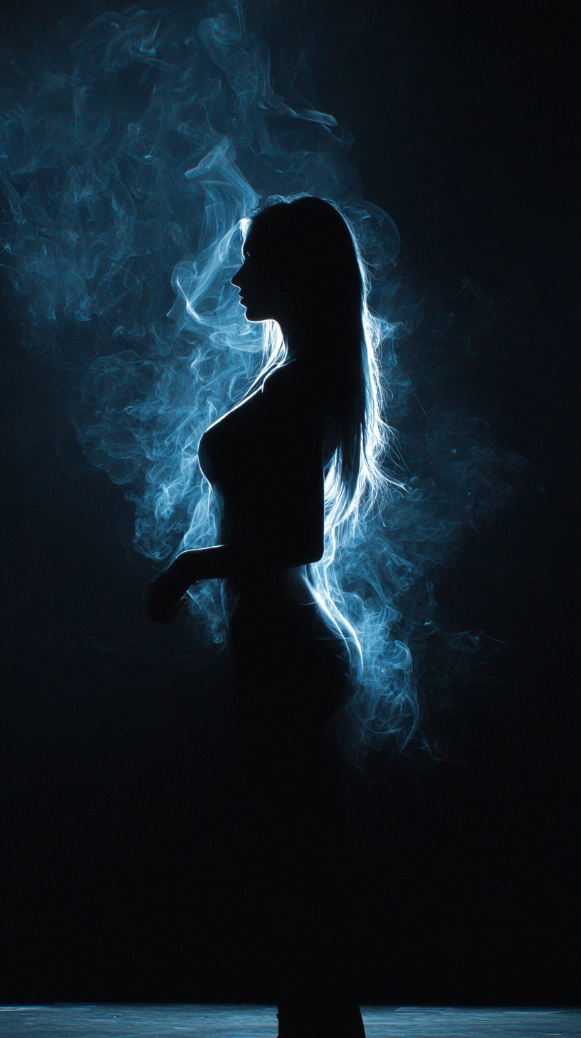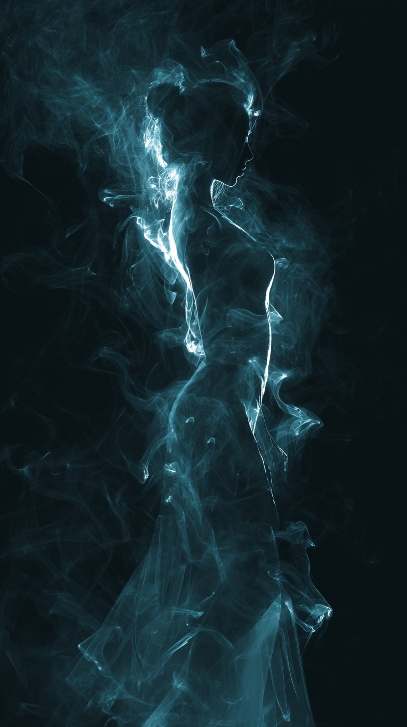 Силуэт женщины-голограммы, состоящего из дыма и призрачного свечения в темноте.