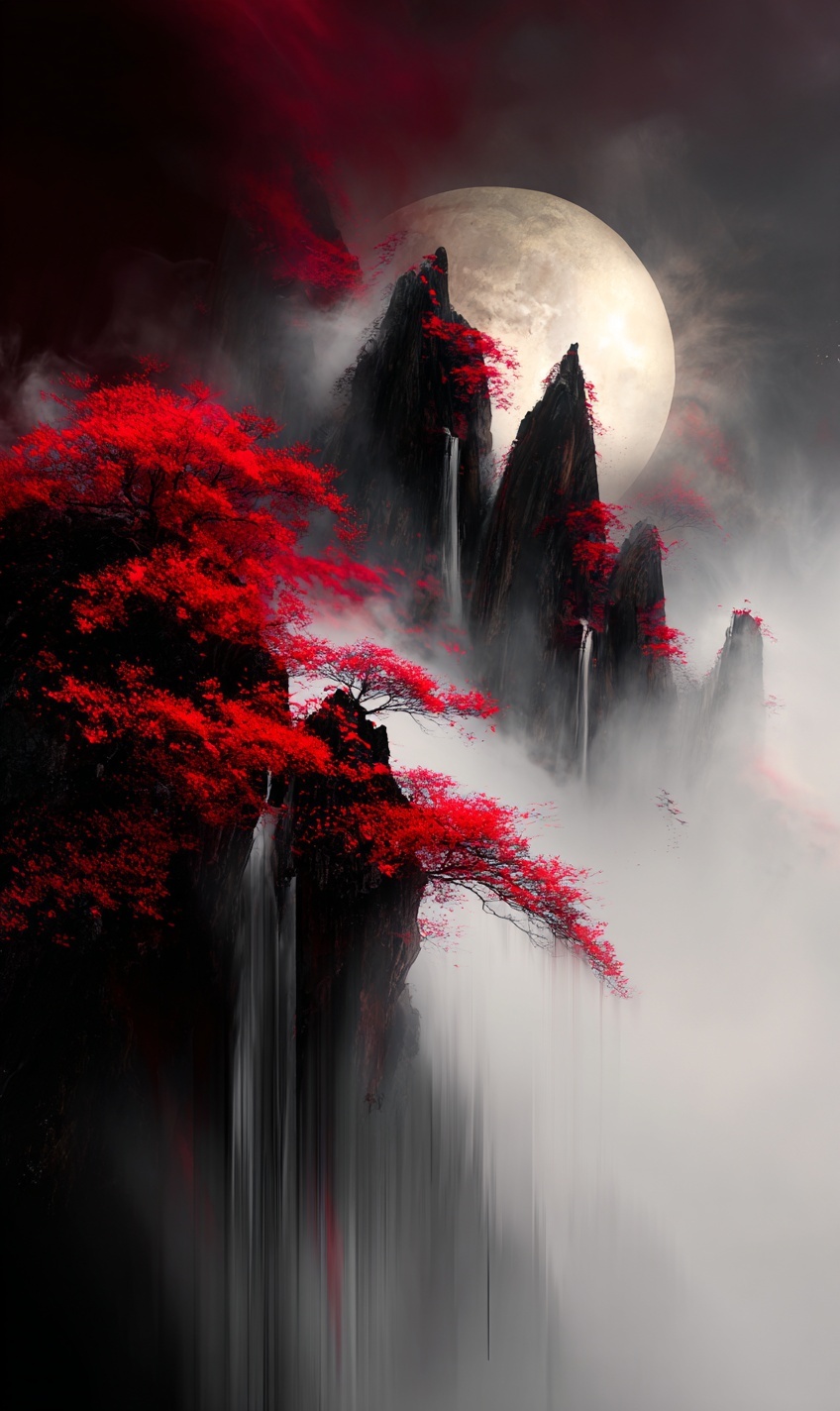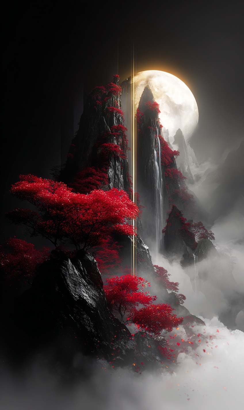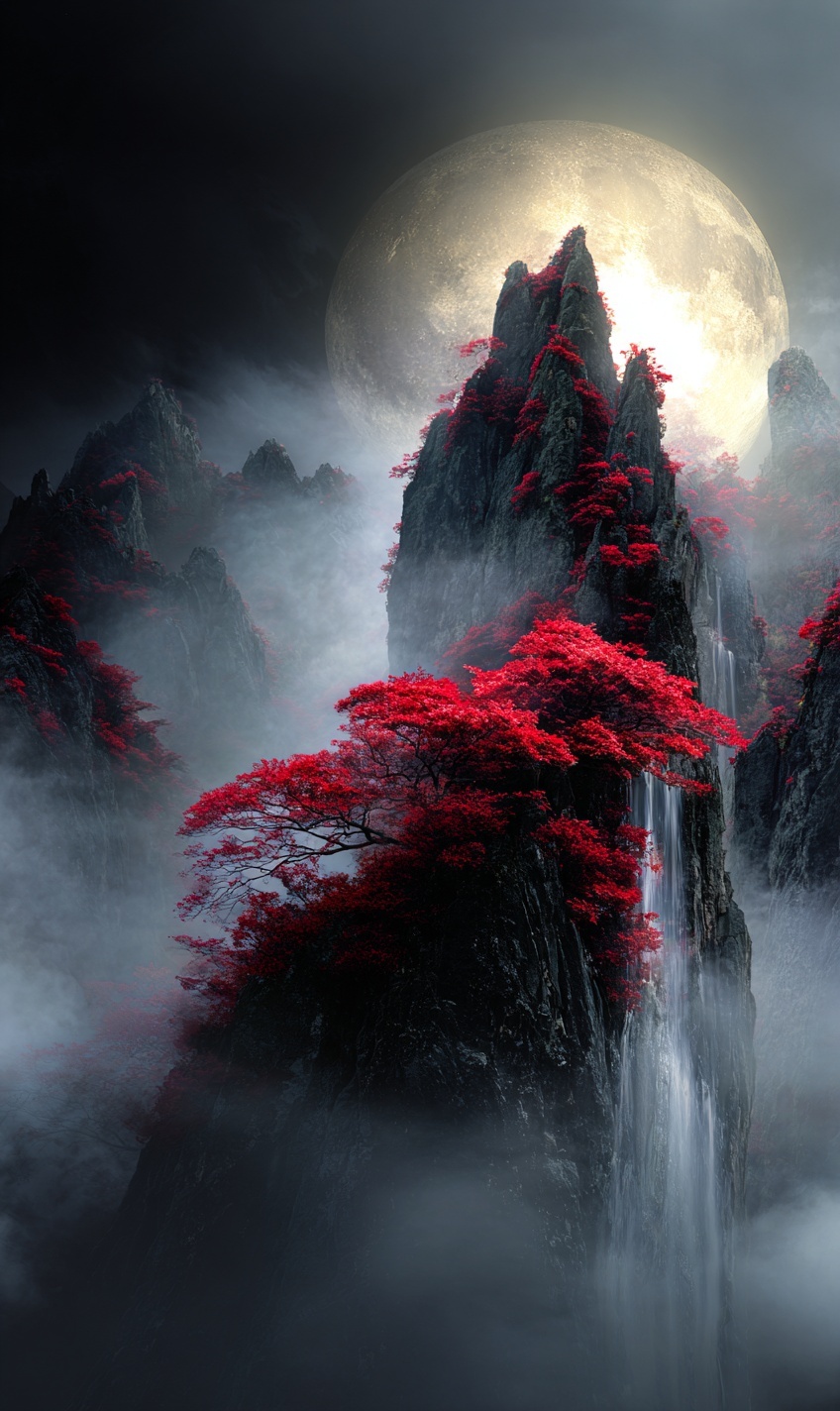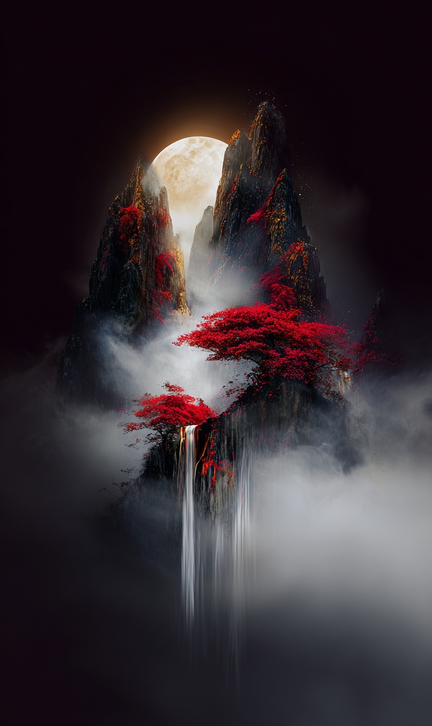 Сюрреалистичный фэнтези-пейзаж с горными пиками, красными клёнами на скалах и водопадом.