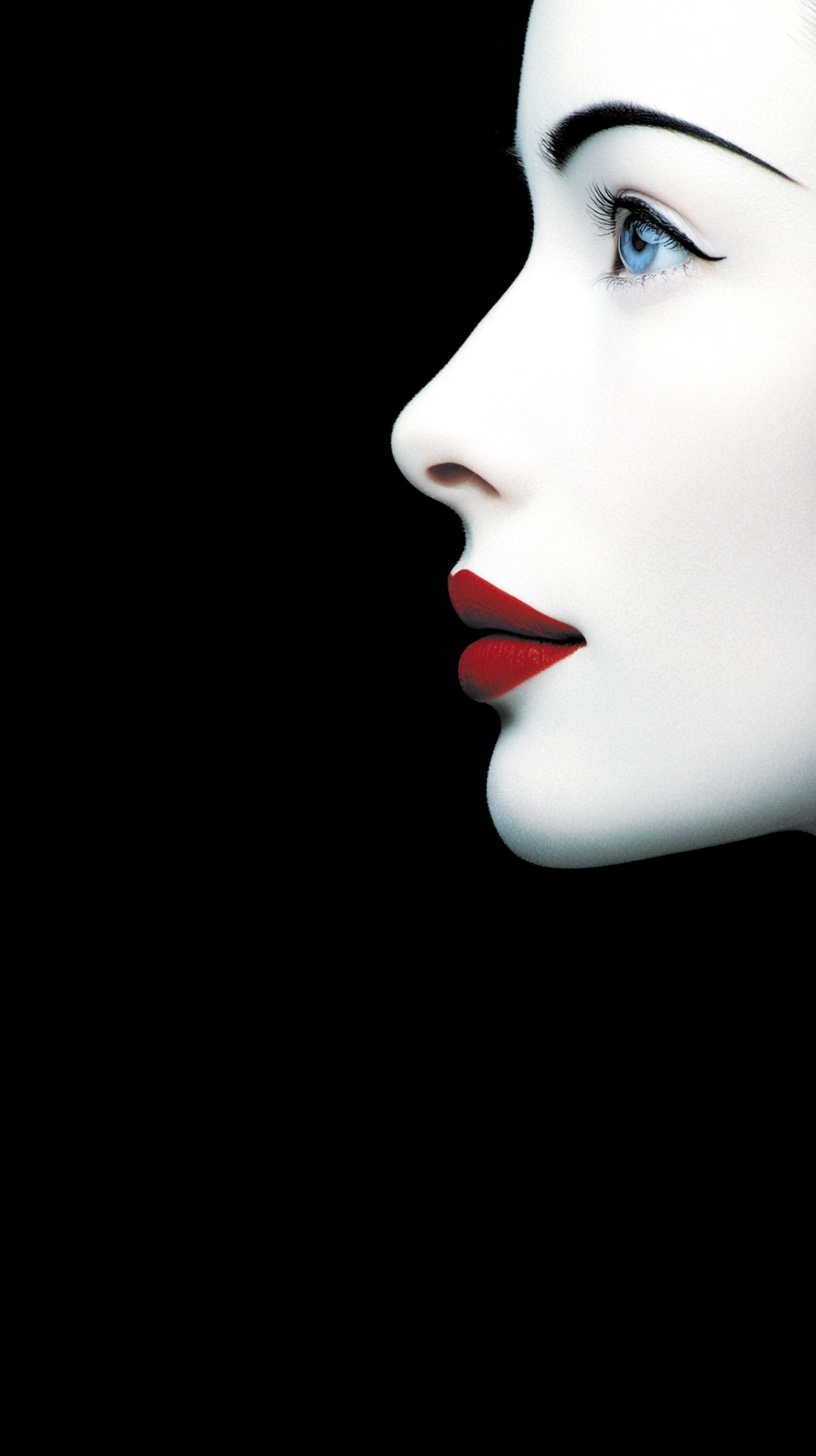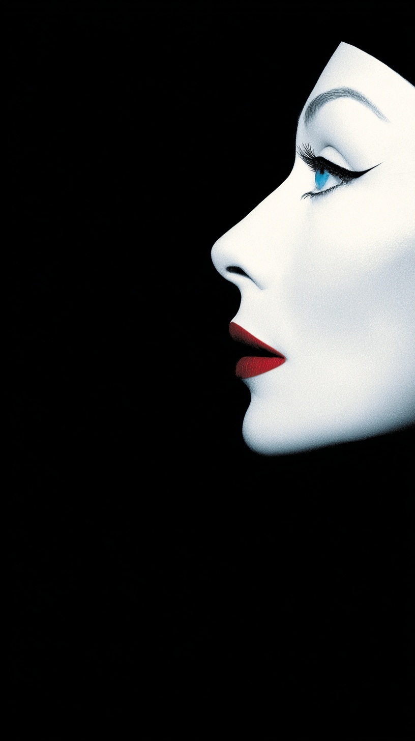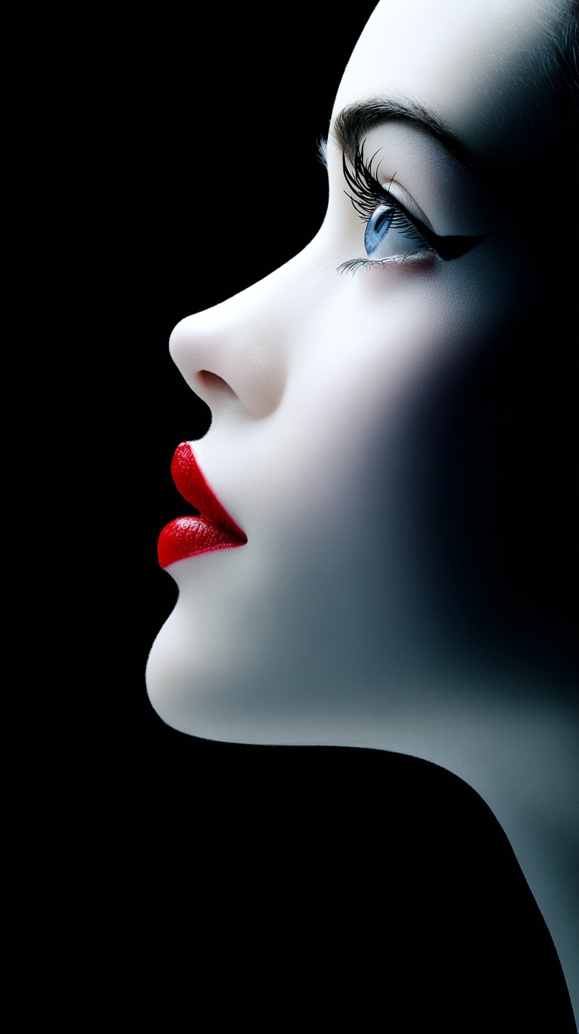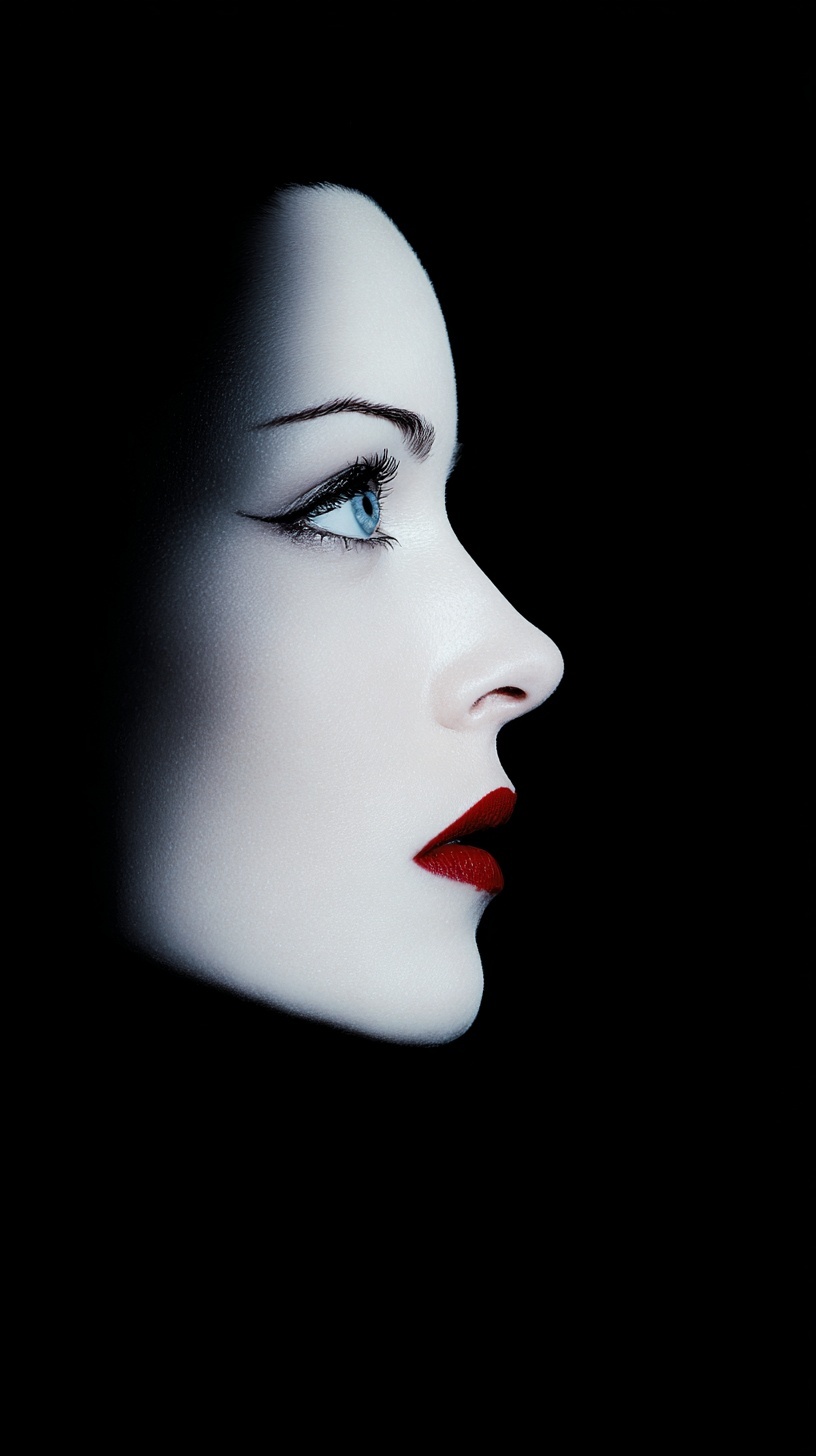 Портрет женщины в профиль, подчёркнуты бледная кожа, яркий голубые глаза, чёткая бровь и алая помада.