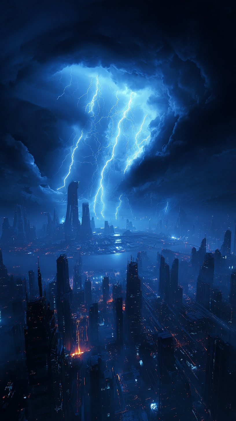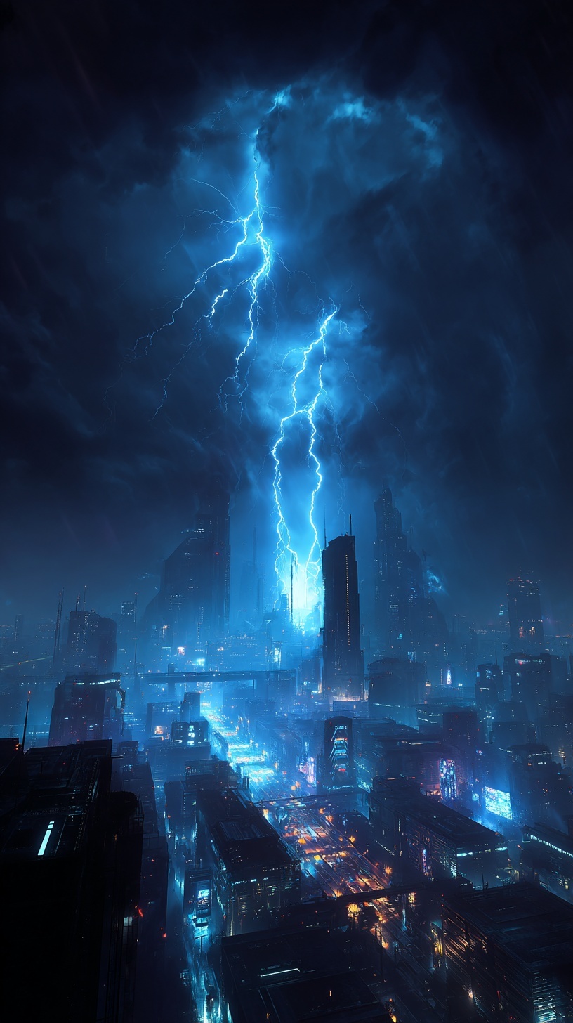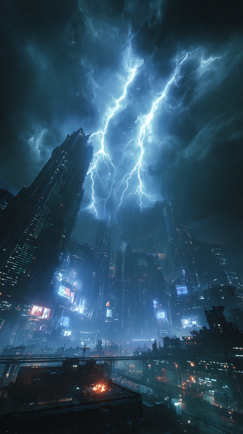 Дистопический город ночью: футуристические небоскрёбы, синяя молния в грозовом небе, мигающие неоновые огни, дождь и туман.