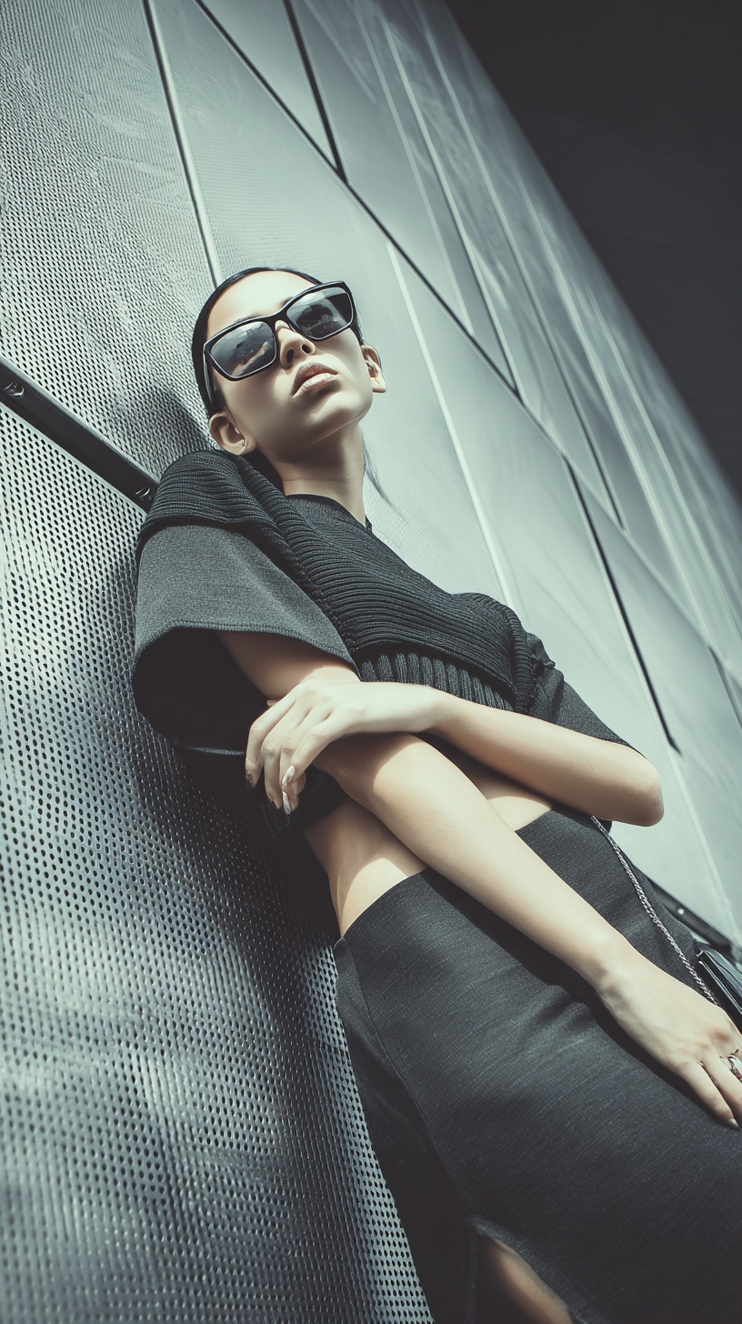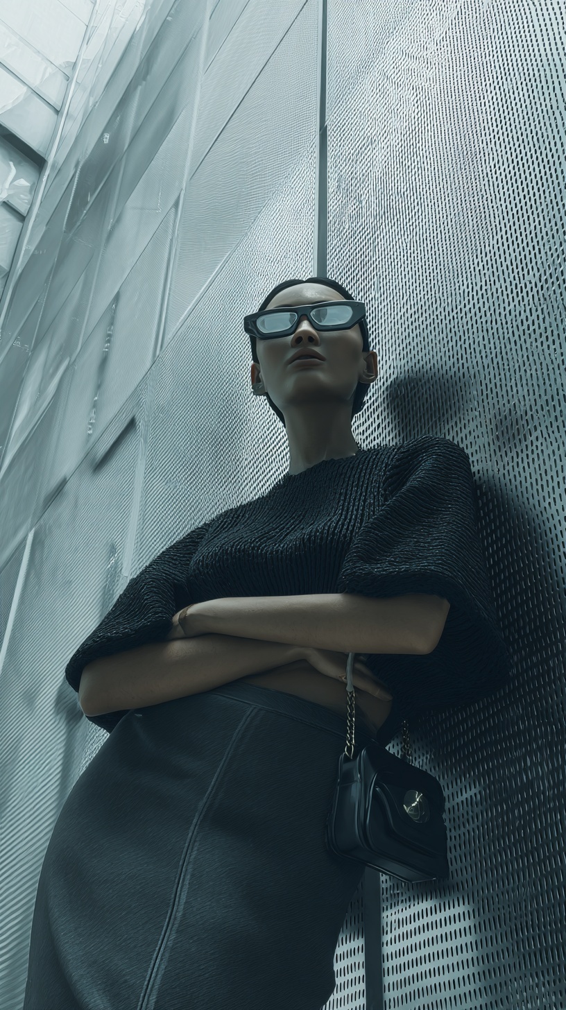 Футуристический фэшн-портрет женщины у металлического фасада.