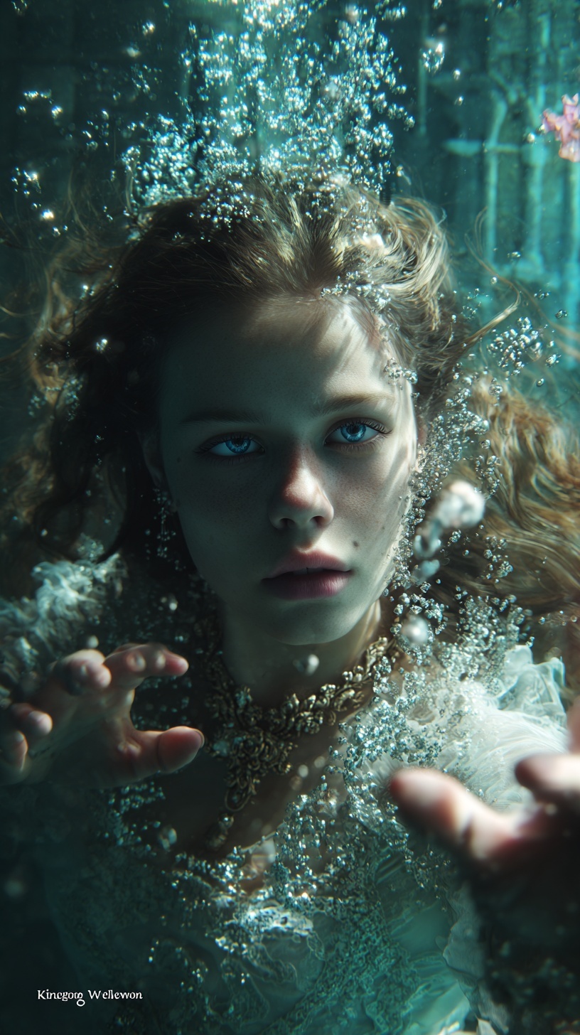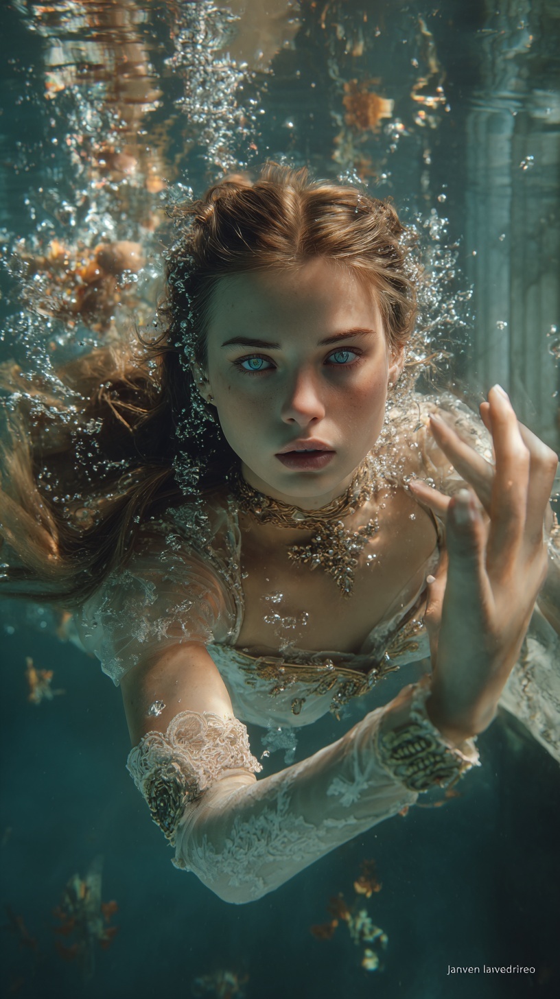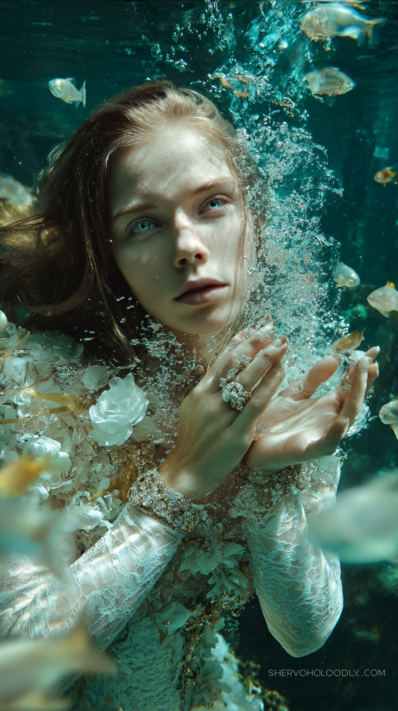 Подводный портрет славянской танцовщицы в барочном платье, исполняющей танец среди цветов и руин замка.