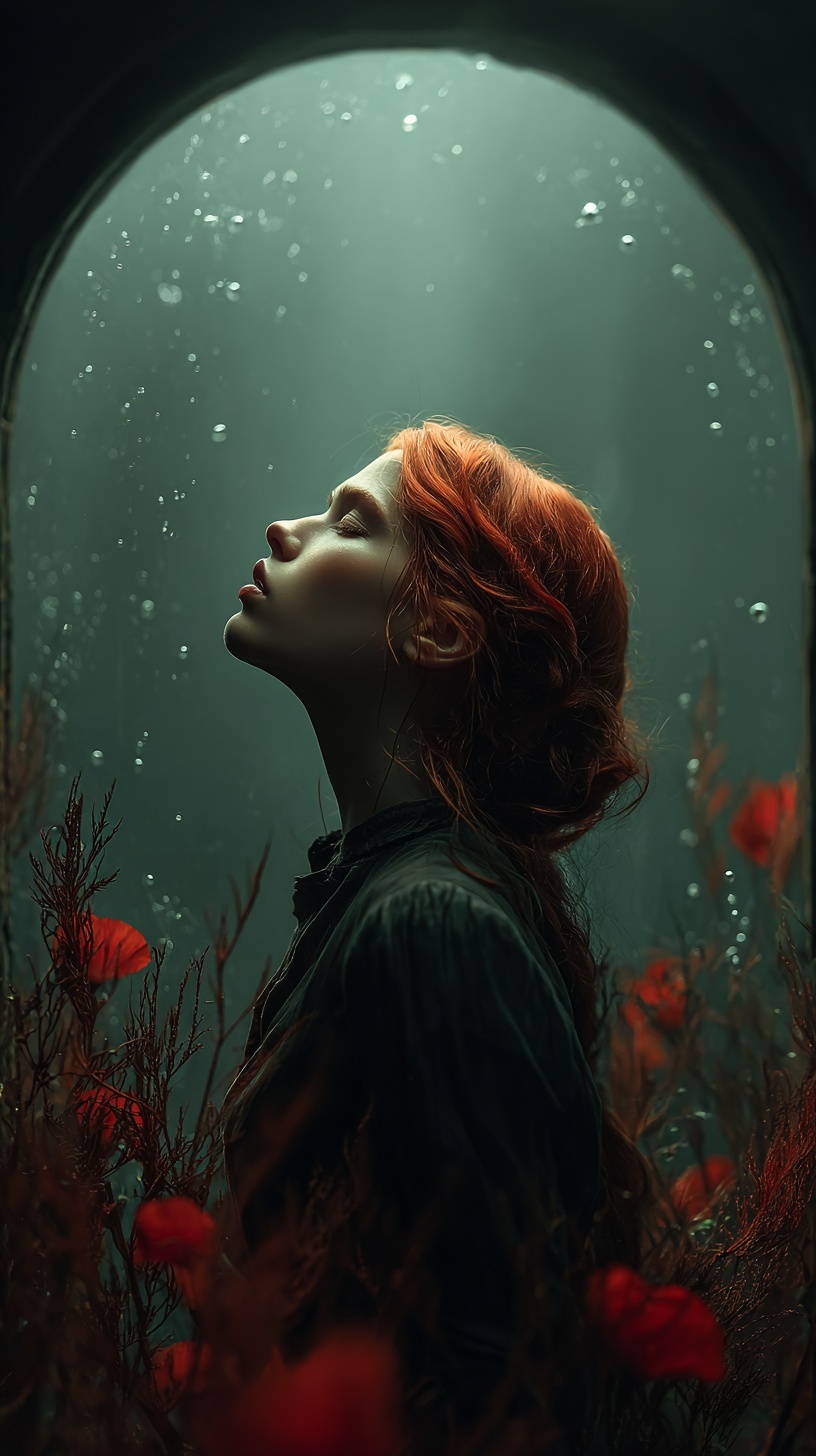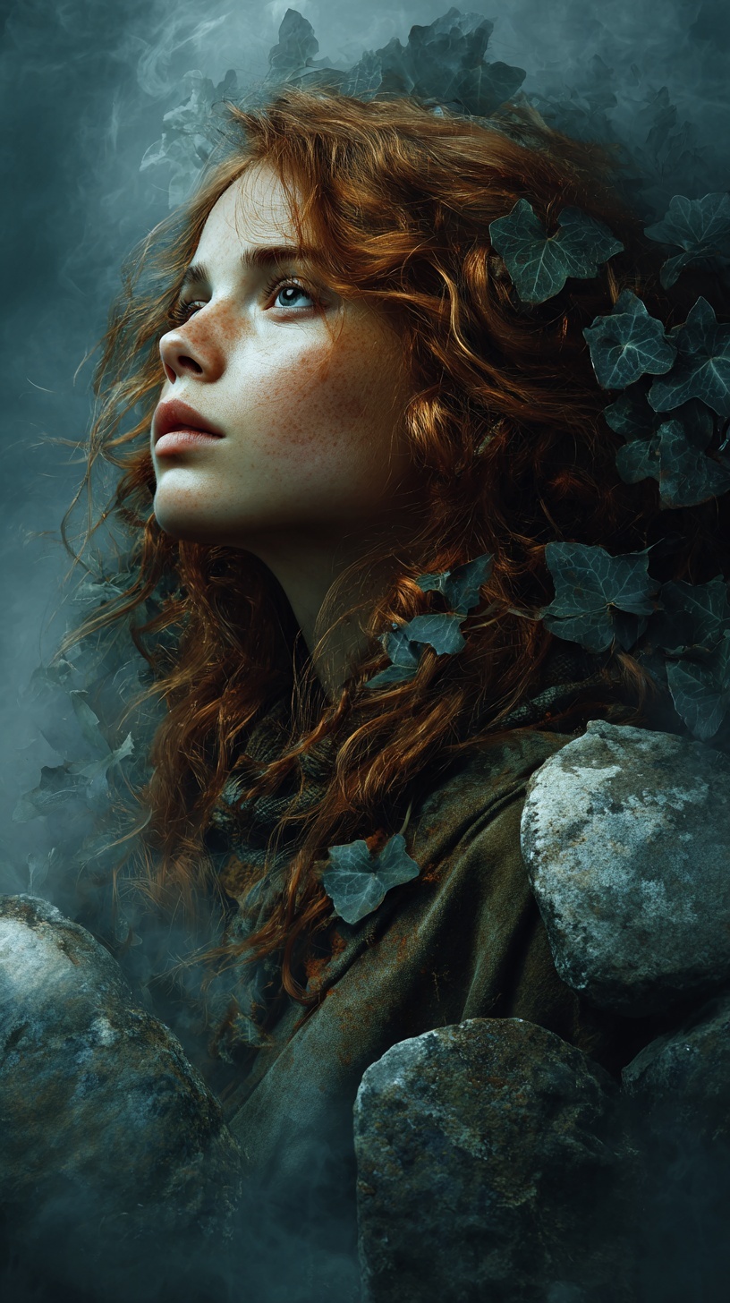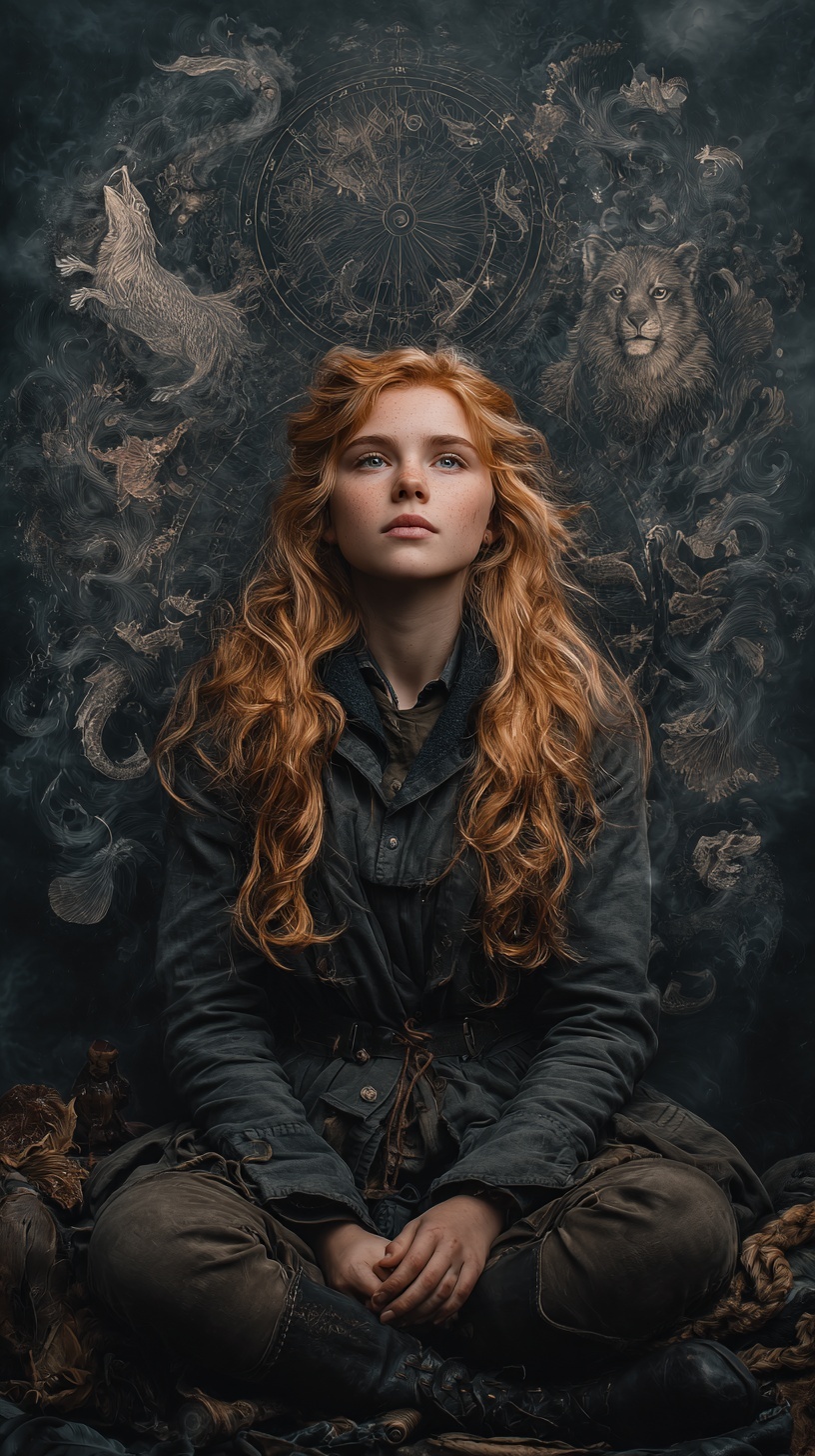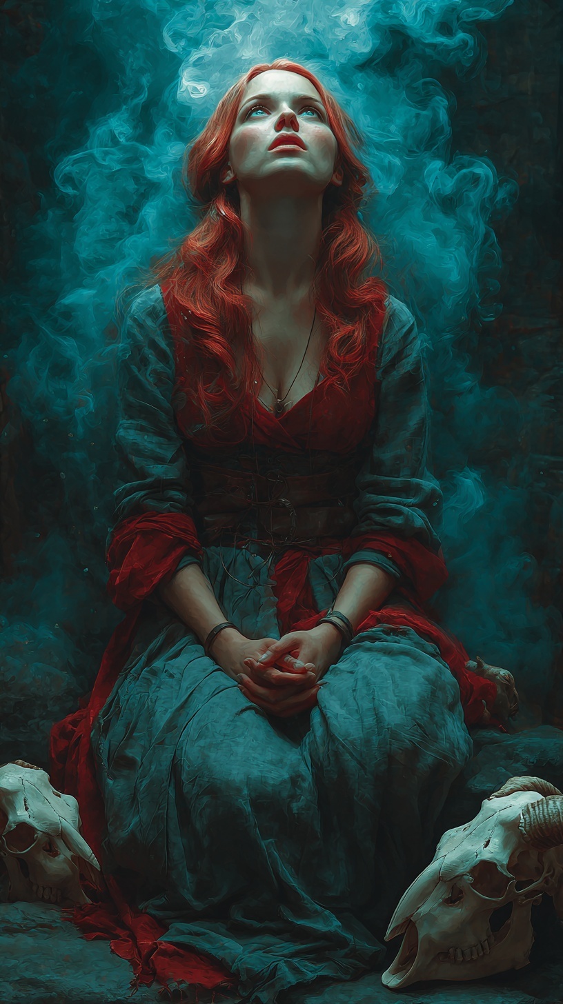 Изображение в стиле темного фэнтези с молодой рыжеволосой женщиной, окруженной мистическими элементами в мрачной атмосфере.
