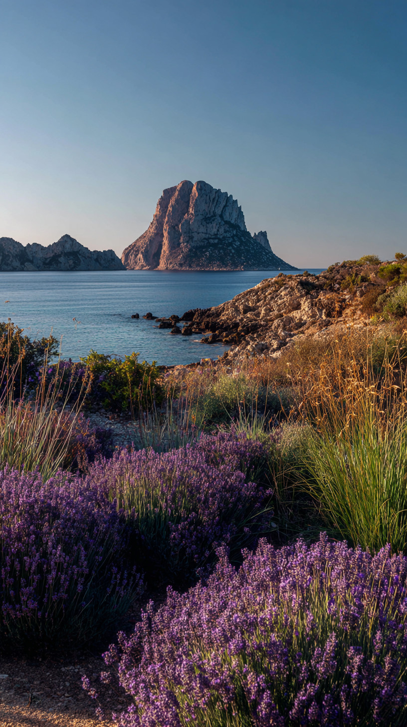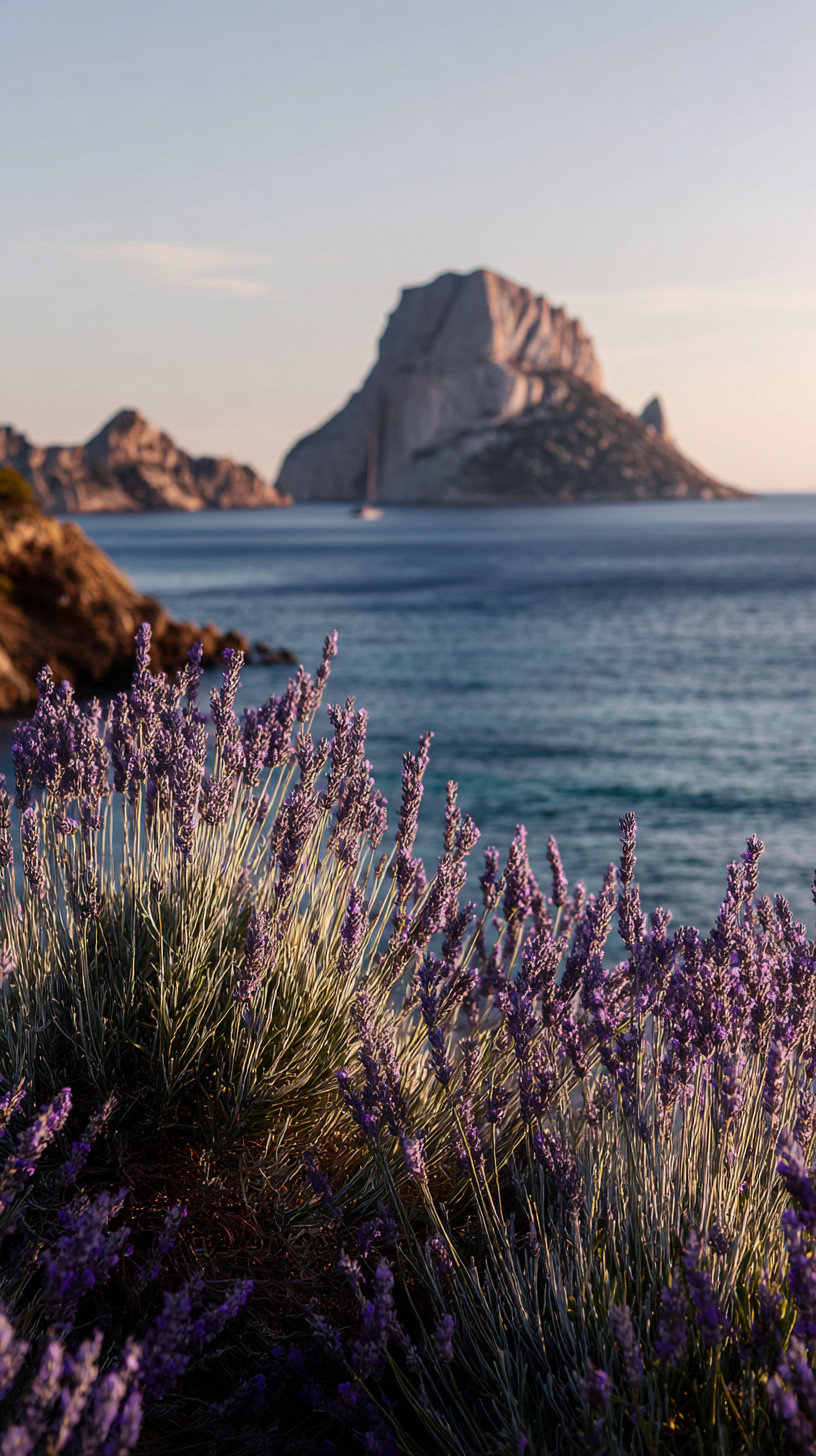 На переднем плане — лаванда и растения Ибицы, на заднем — море и знаменитая скала Эс-Ведра.