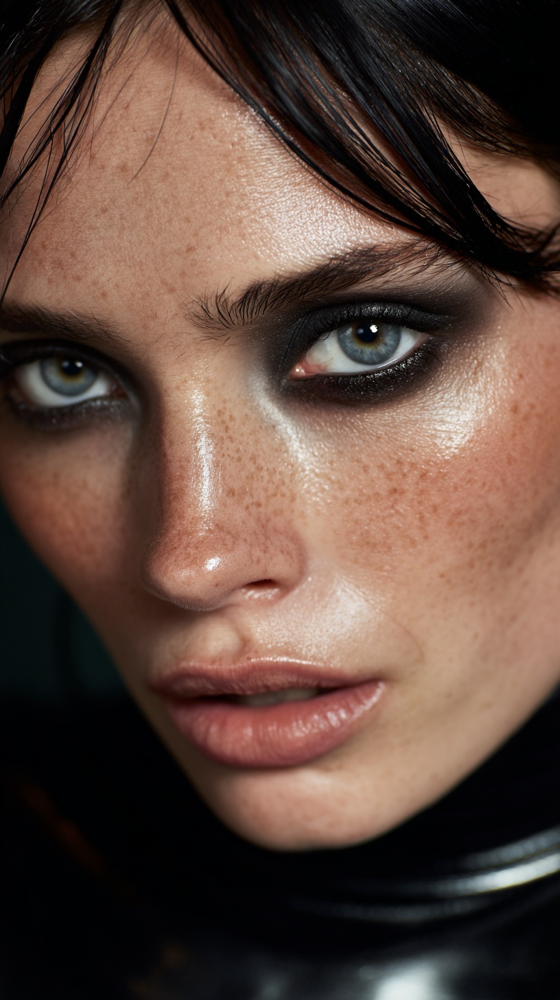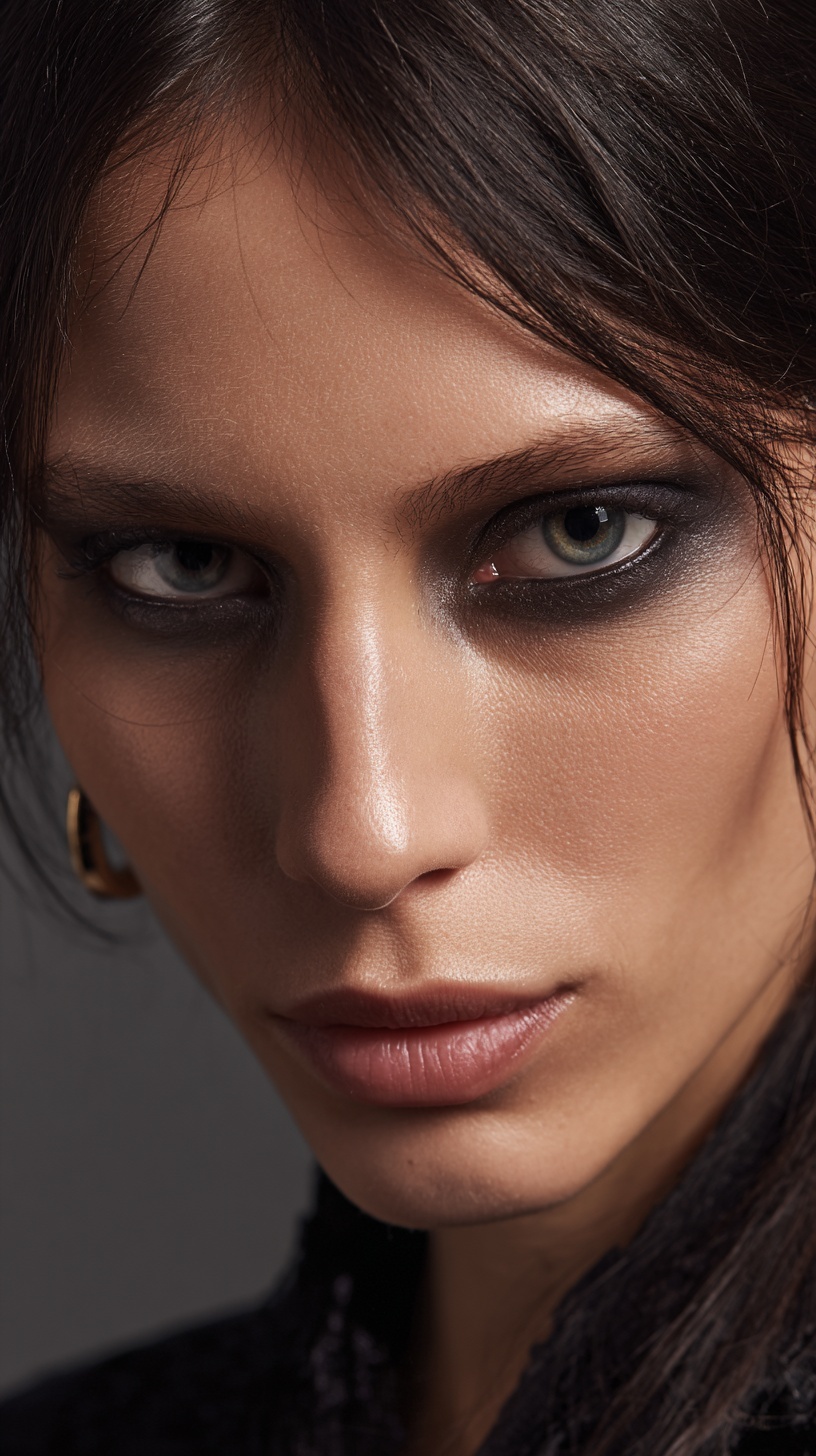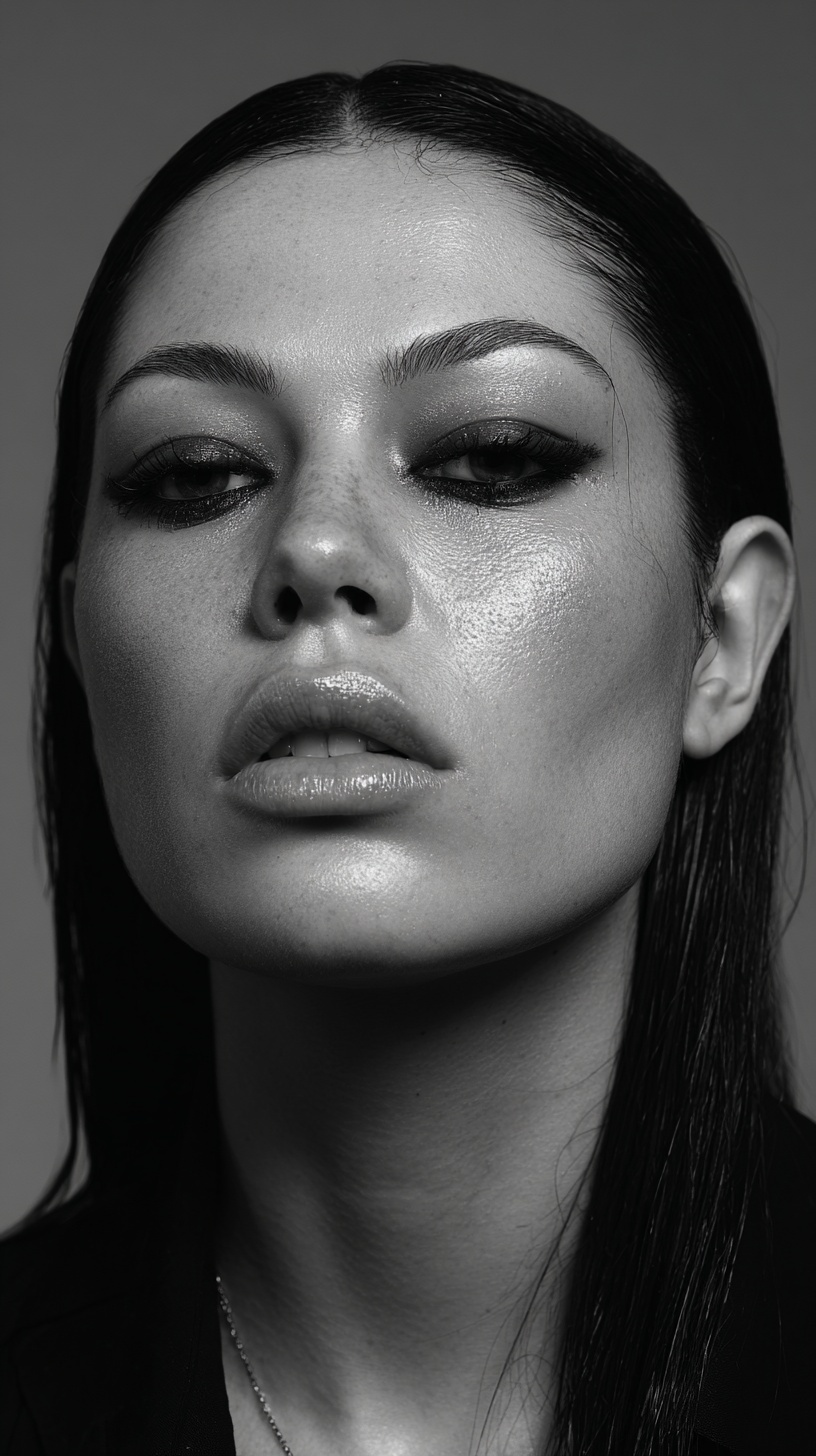 Реалистичное лиц, чёткая структура скул, гладкие волосы, студийное освещение.