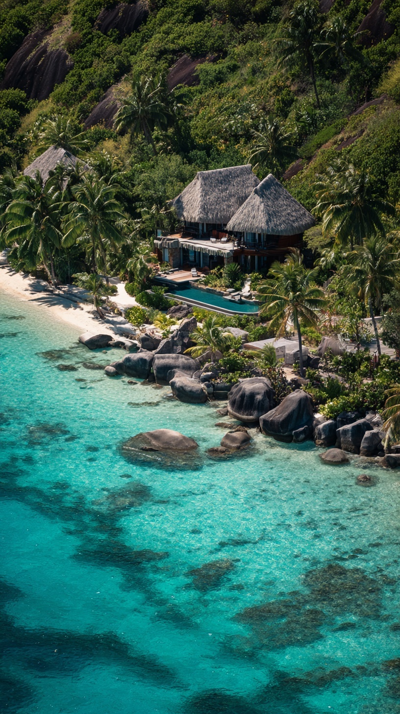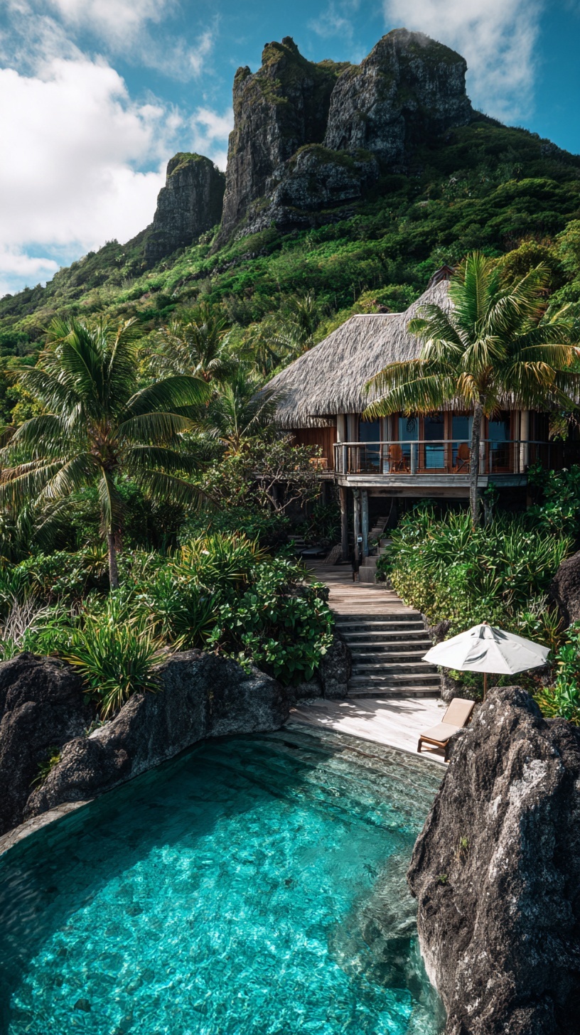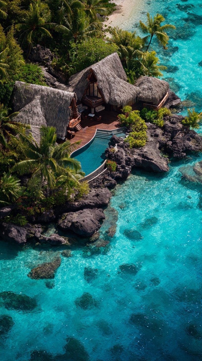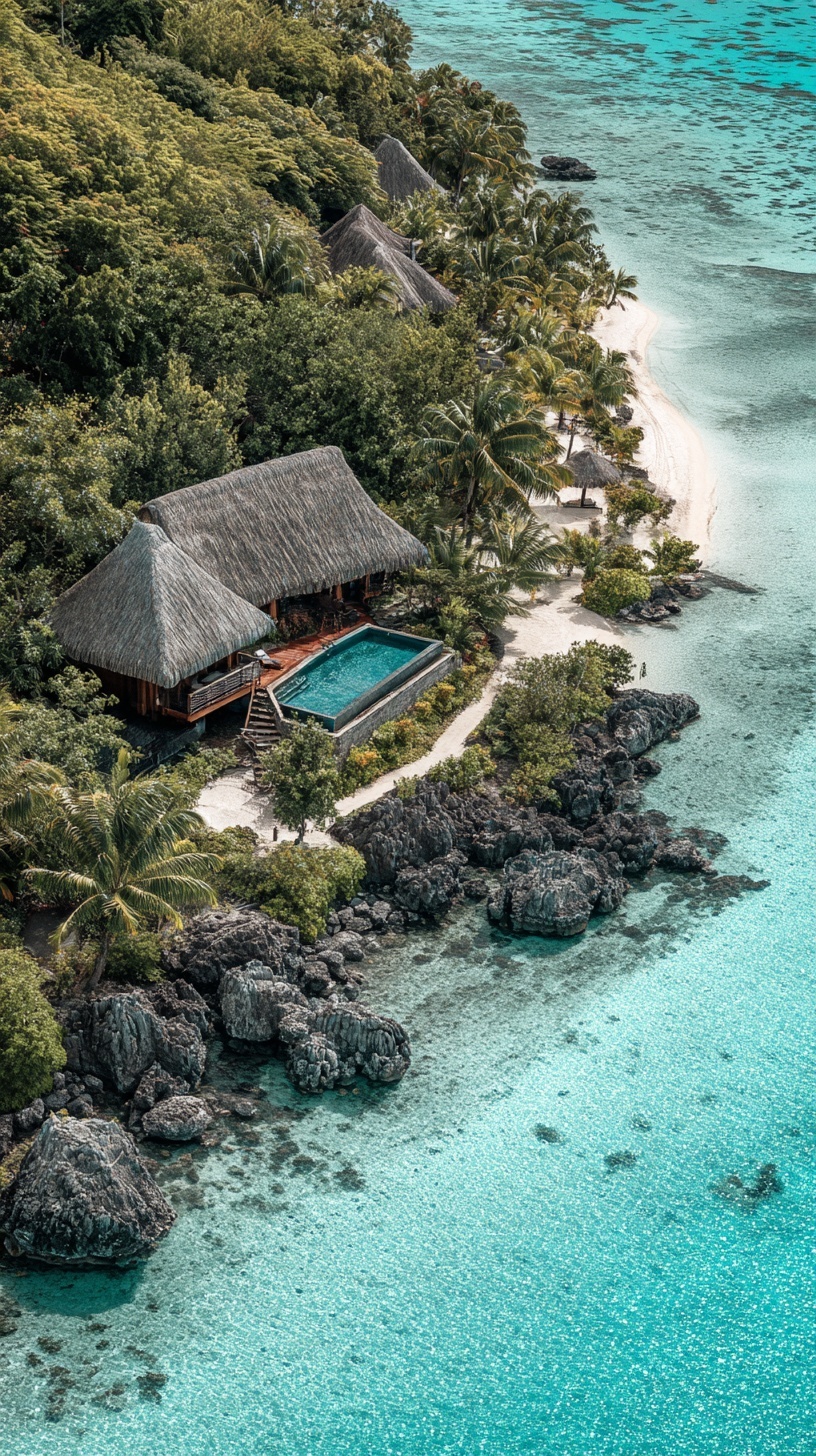 Бора-Бора: кристальные воды, золотые пляжи, бассейн на фоне океана и бунгало в тропической зелени.