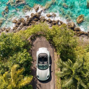 Вид сверху на роскошный кабриолет, едущий по узкой прибрежной дороге вдоль океана.