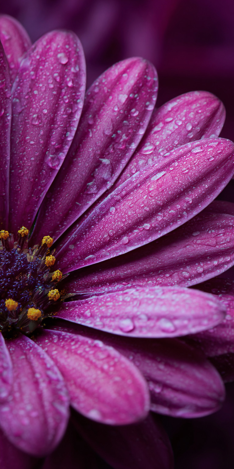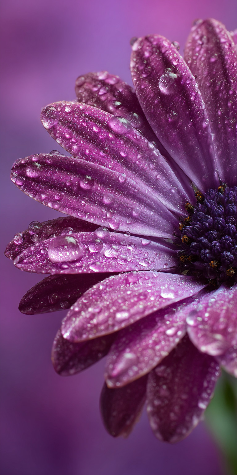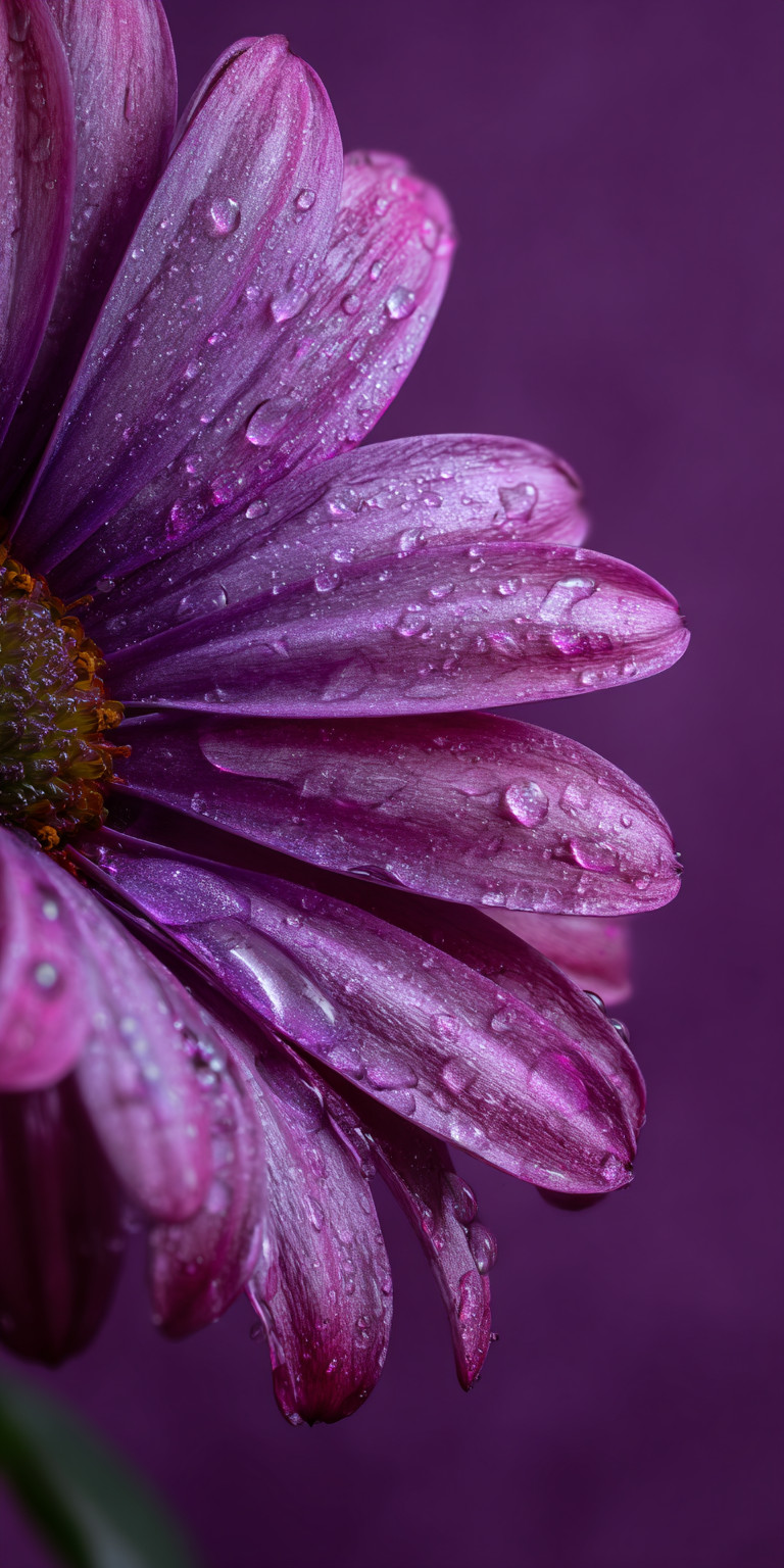 Макроснимок лепестков фиолетовой ромашки с каплями воды на пурпурном фоне.