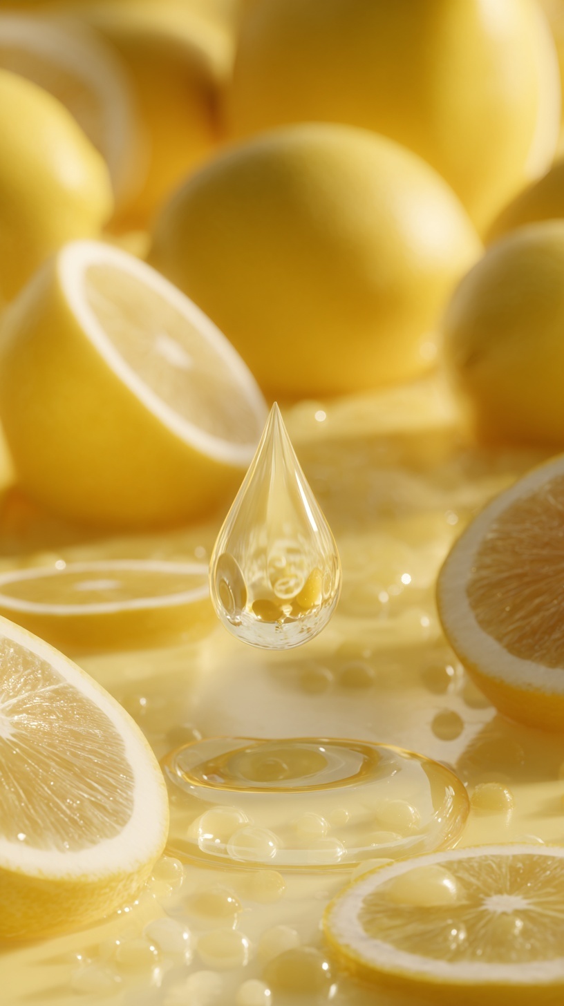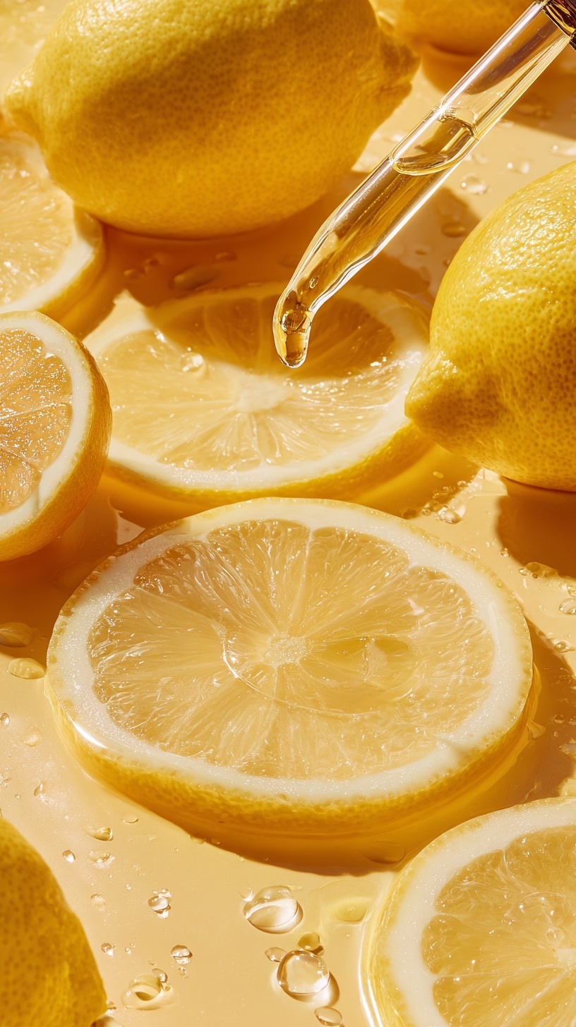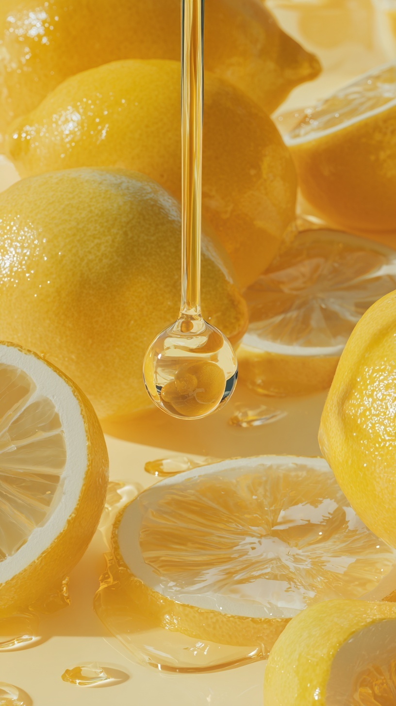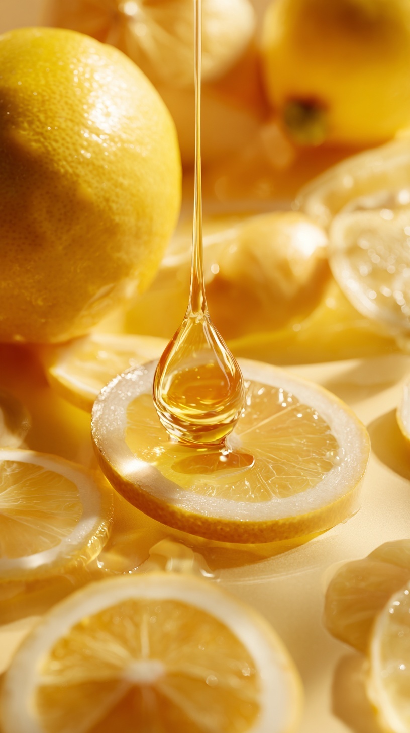 Крупный план капли витаминной сыворотки, падающей на свежие лимоны.