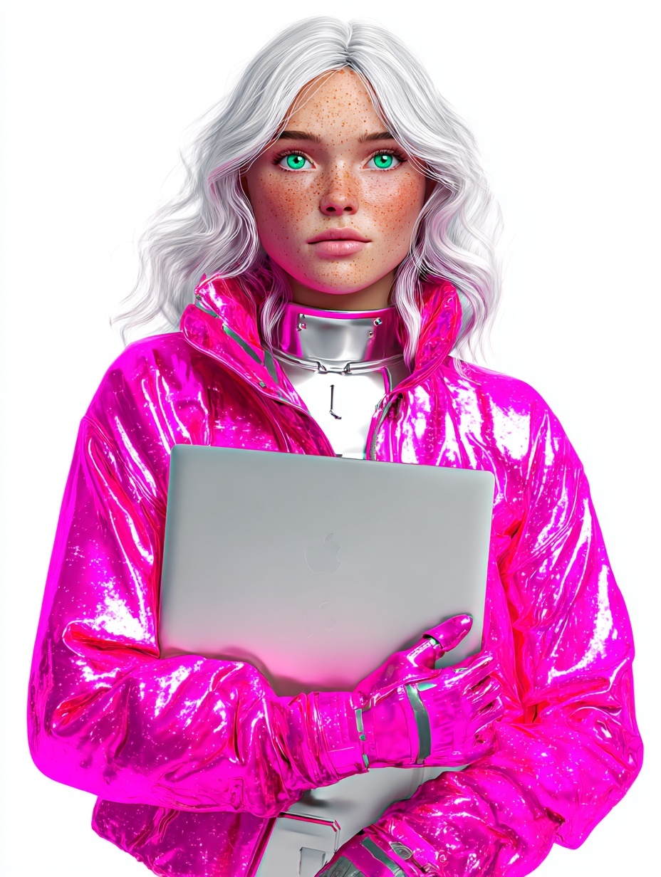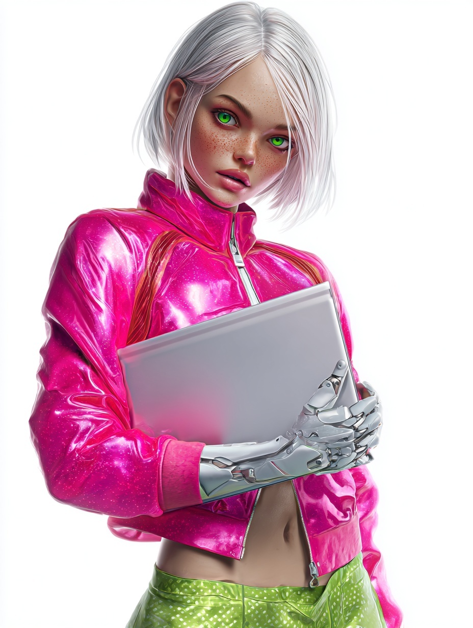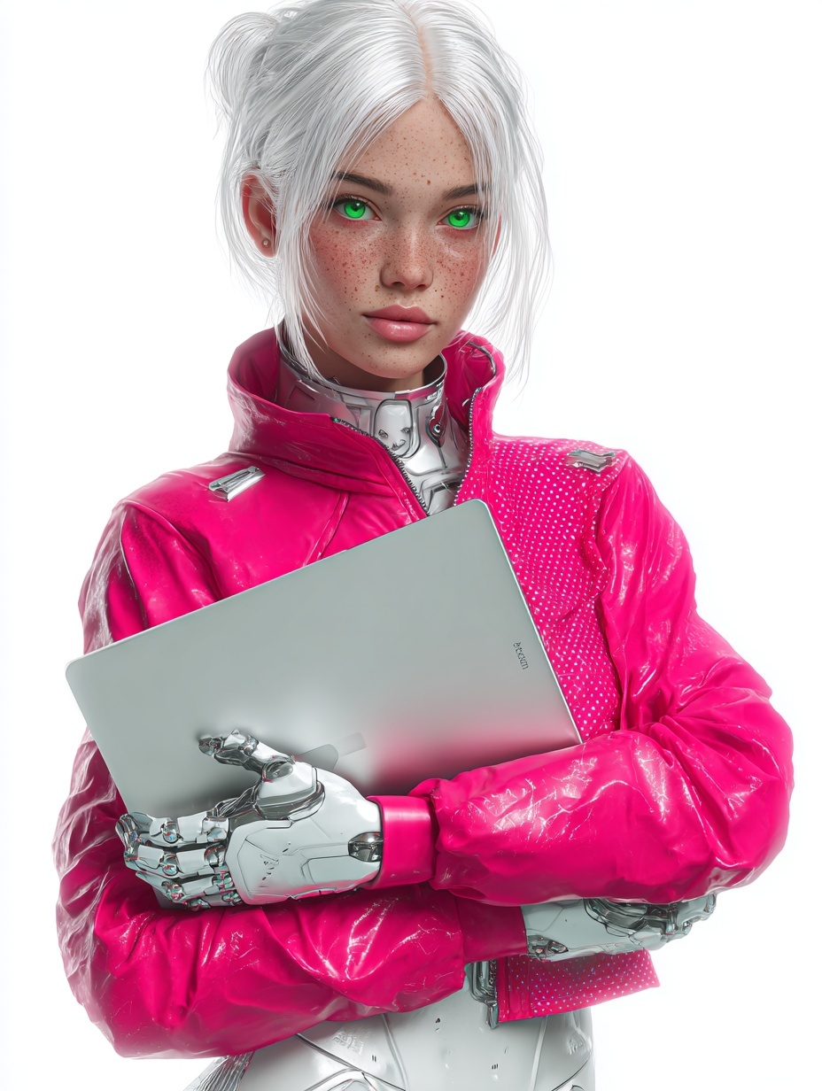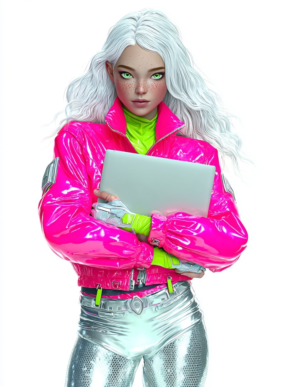 Футуристичная героиня с белыми волосами, зелеными глазами и веснушками в неоново-розовой куртке, держит ноутбук.