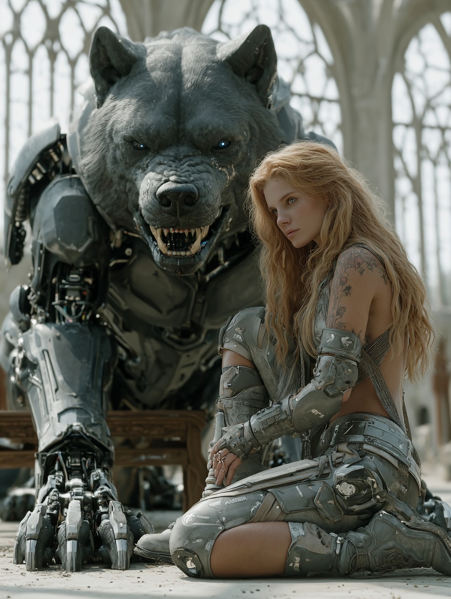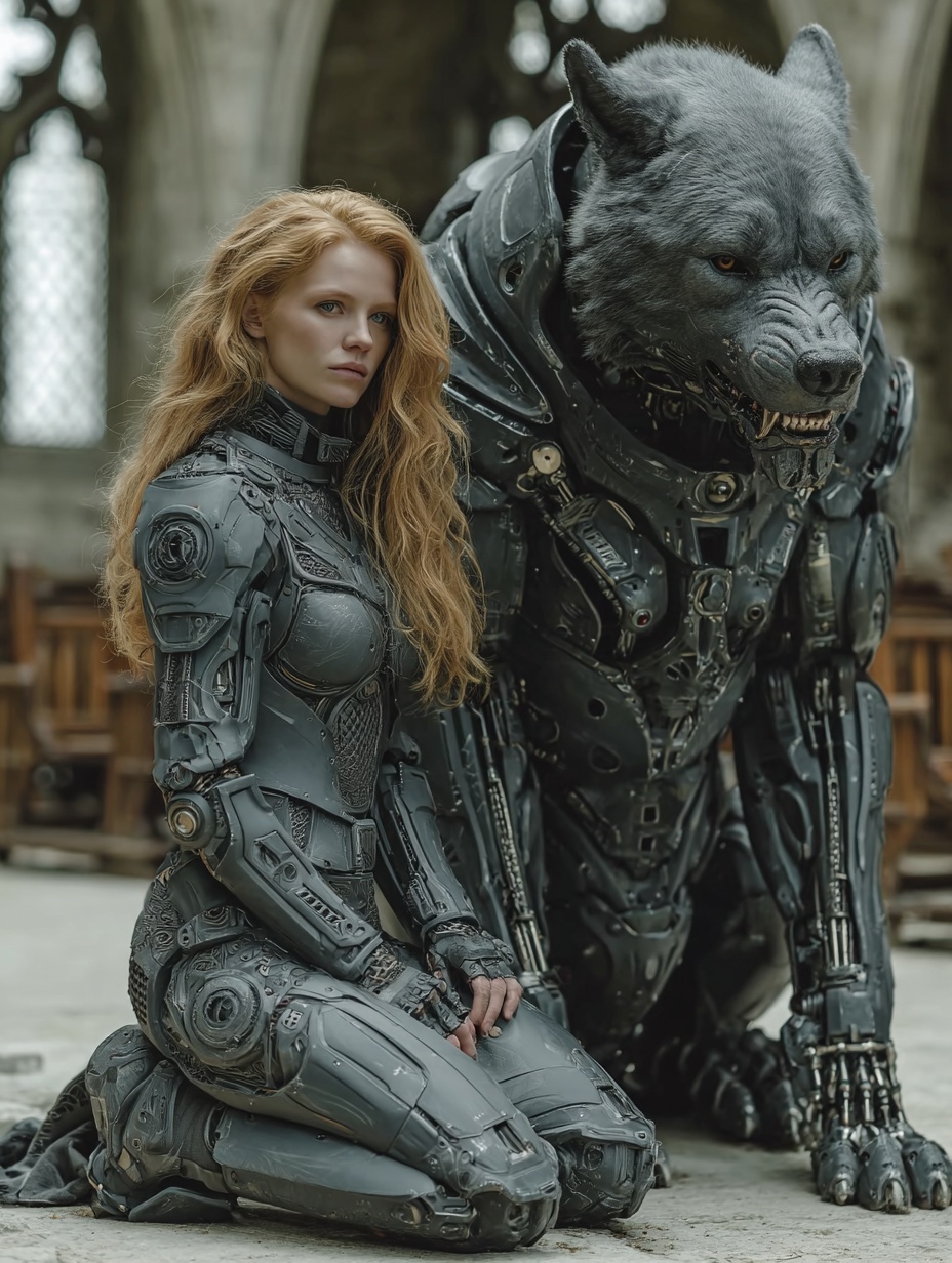 Портрет рыжеволосой киберпанк-воительницы и её массивной киберсобаки, волка
