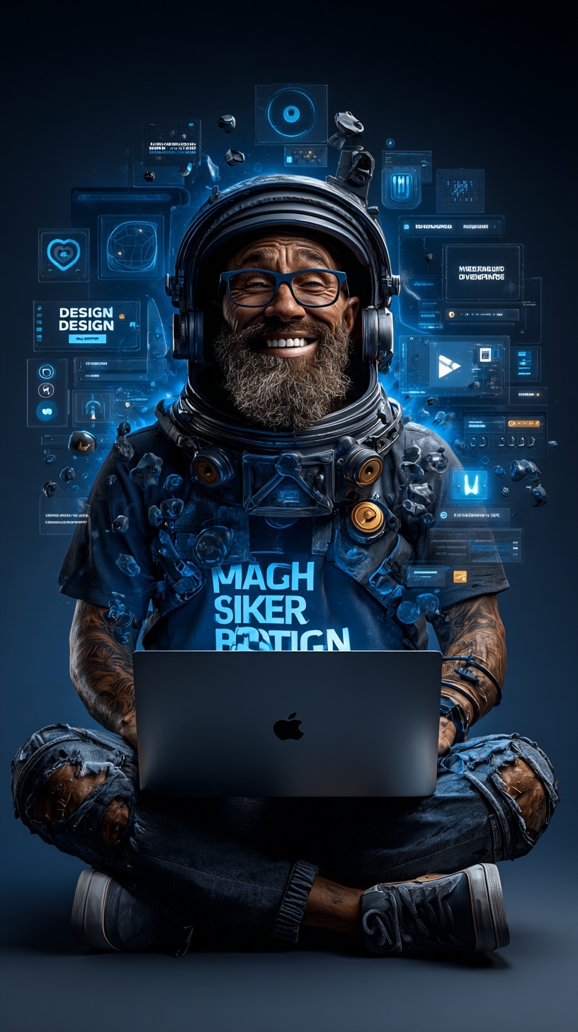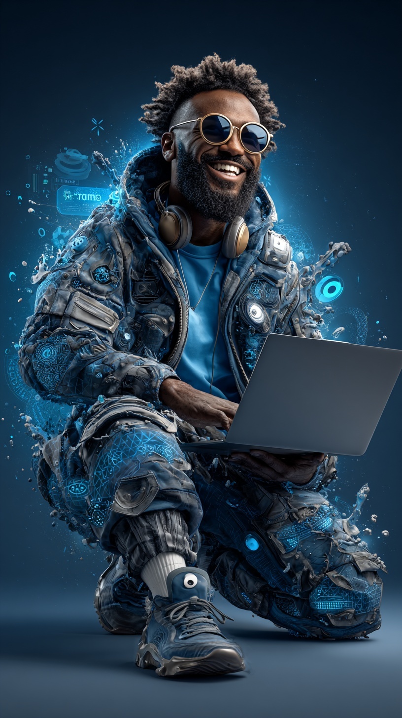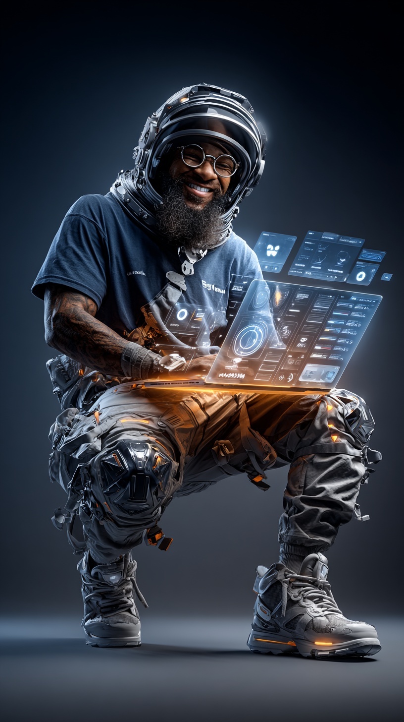 Промпт для Midjourney, для генерации изображений мужчины в стильных очках и синей футболке, окружённого прозрачными цифровыми UI-панелями с элементами брендинга и маркетинга в стиле sci-fi.