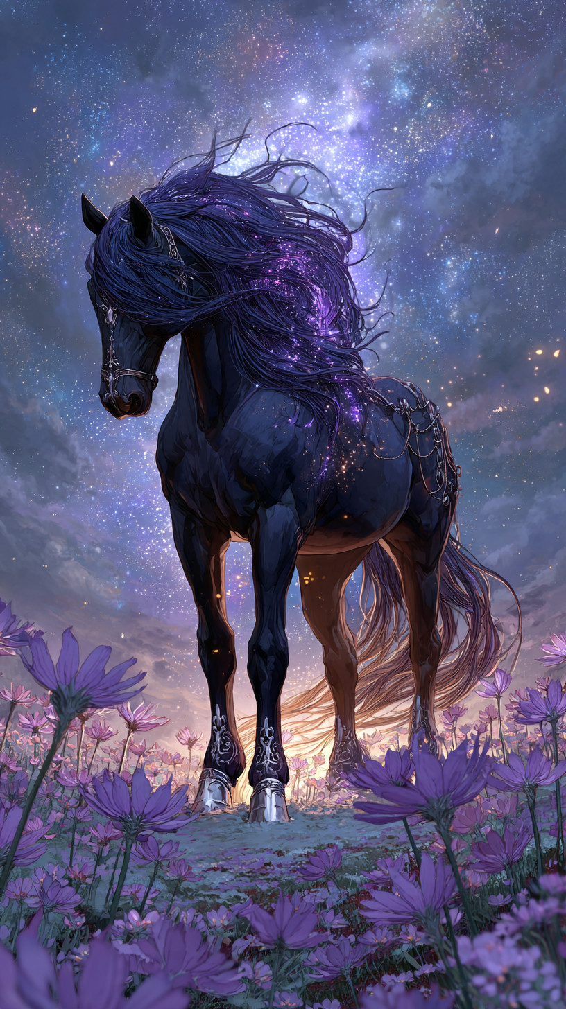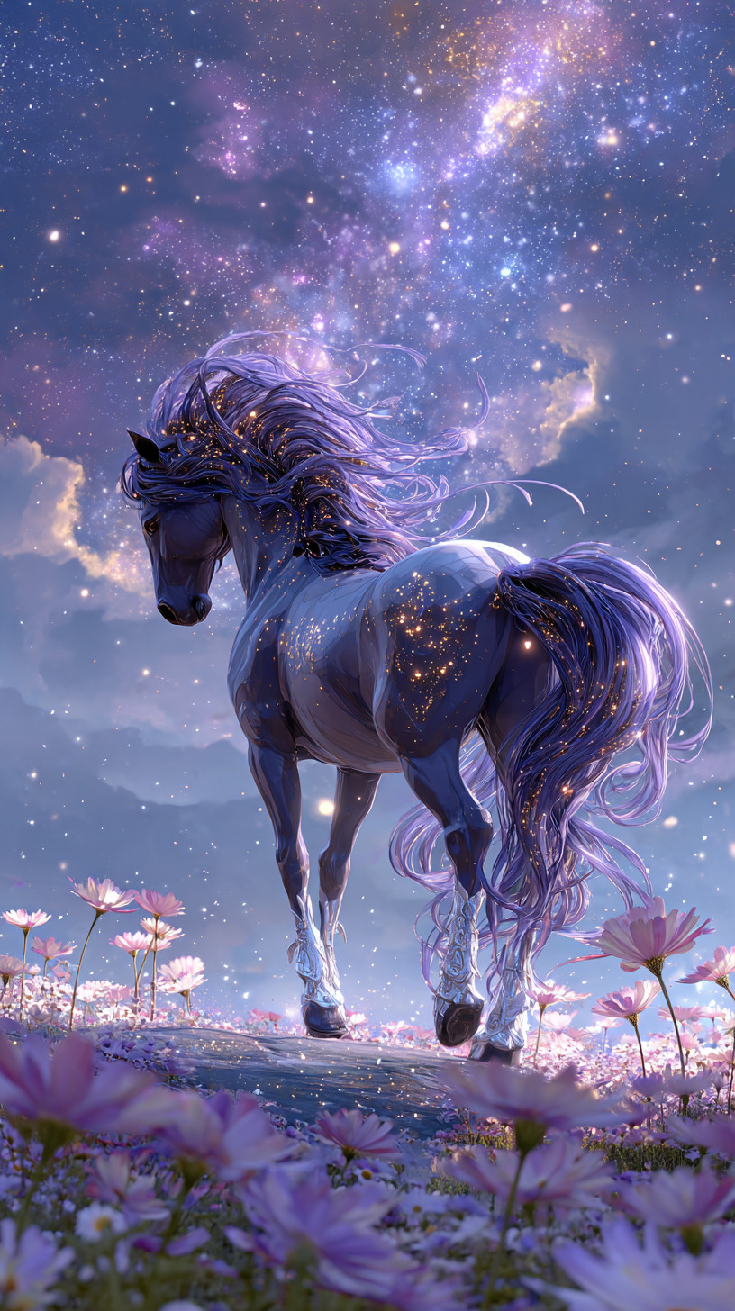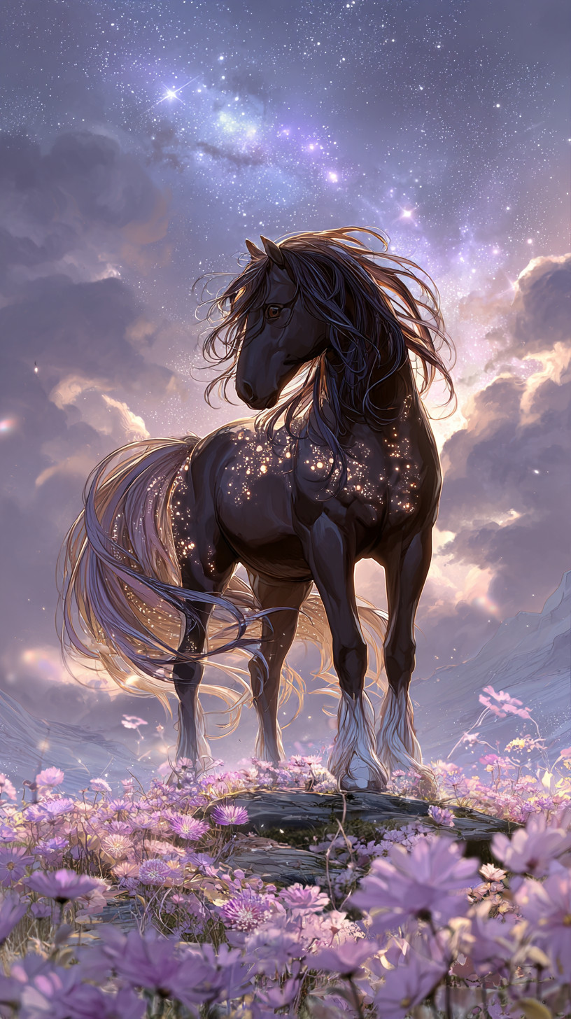 Иллюстрация величественной светящейся лошади с гривой из звёздной пыли, стоящей на холме под вращающимся галактическим небом.